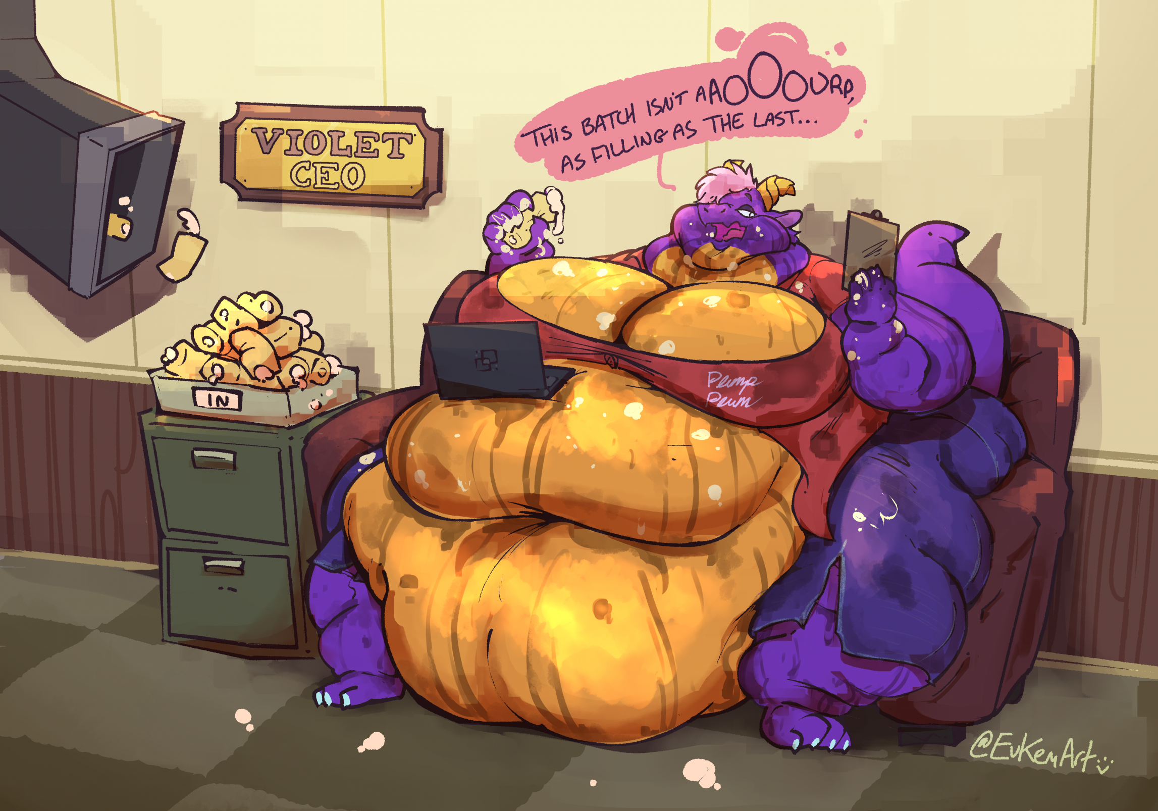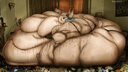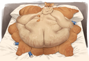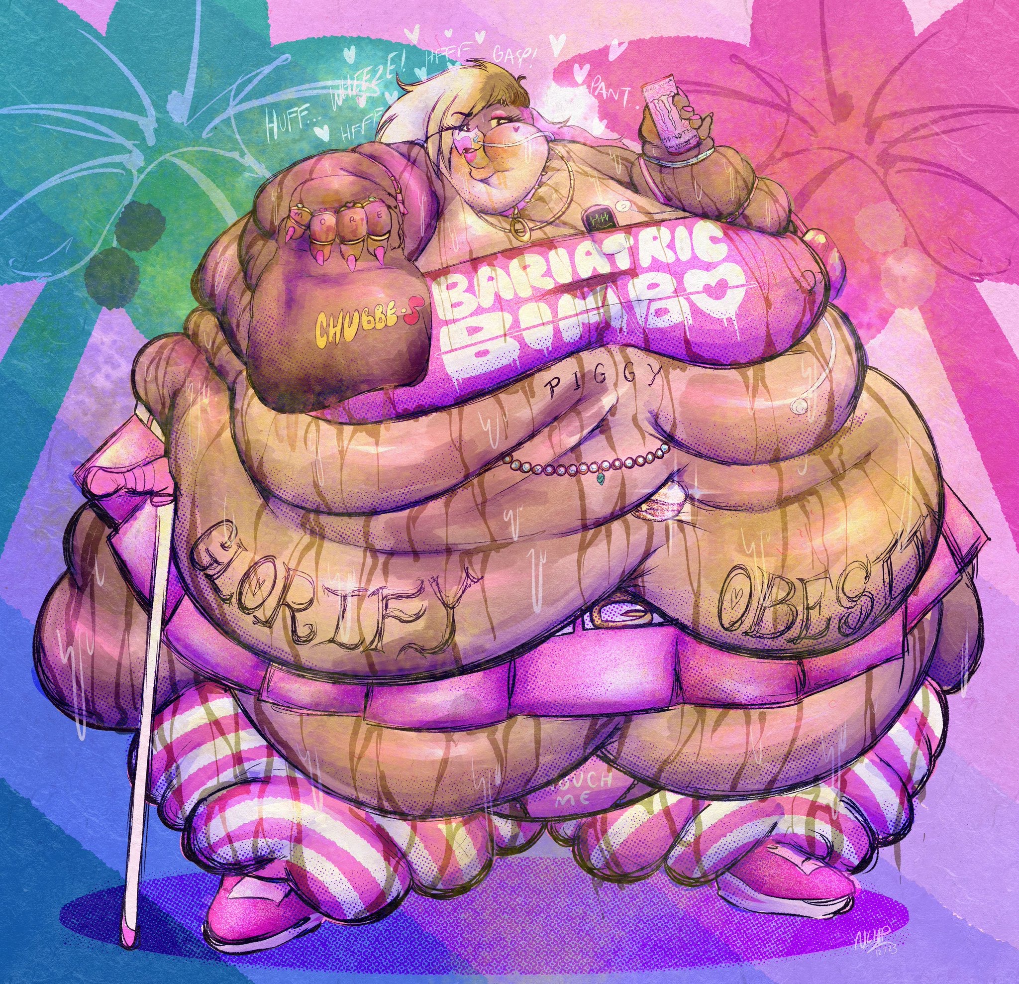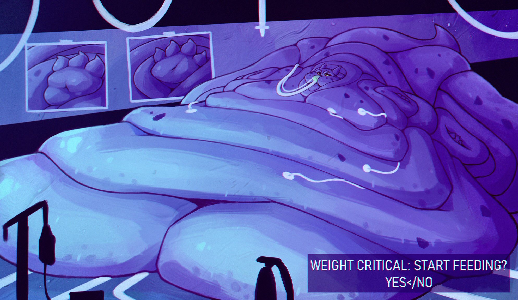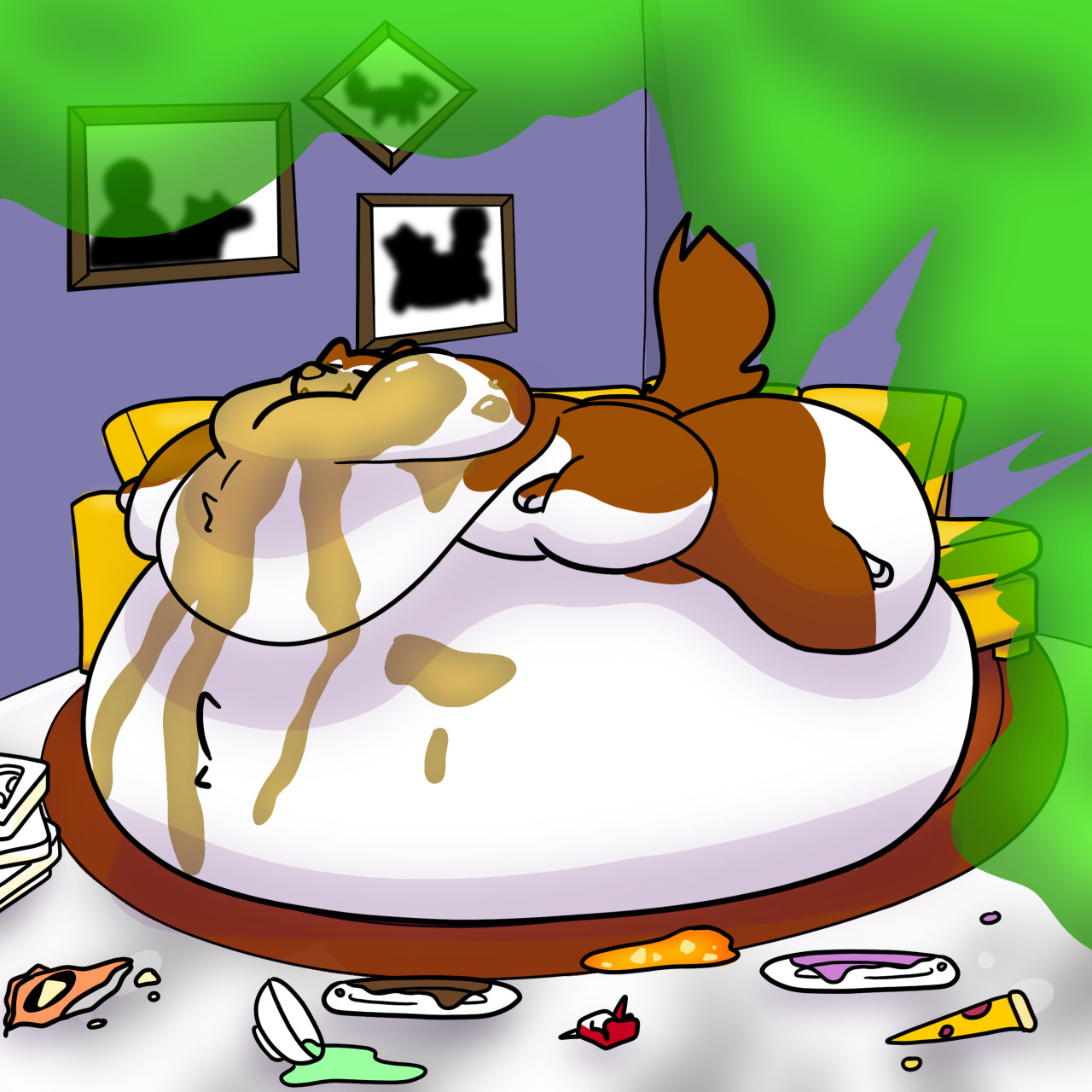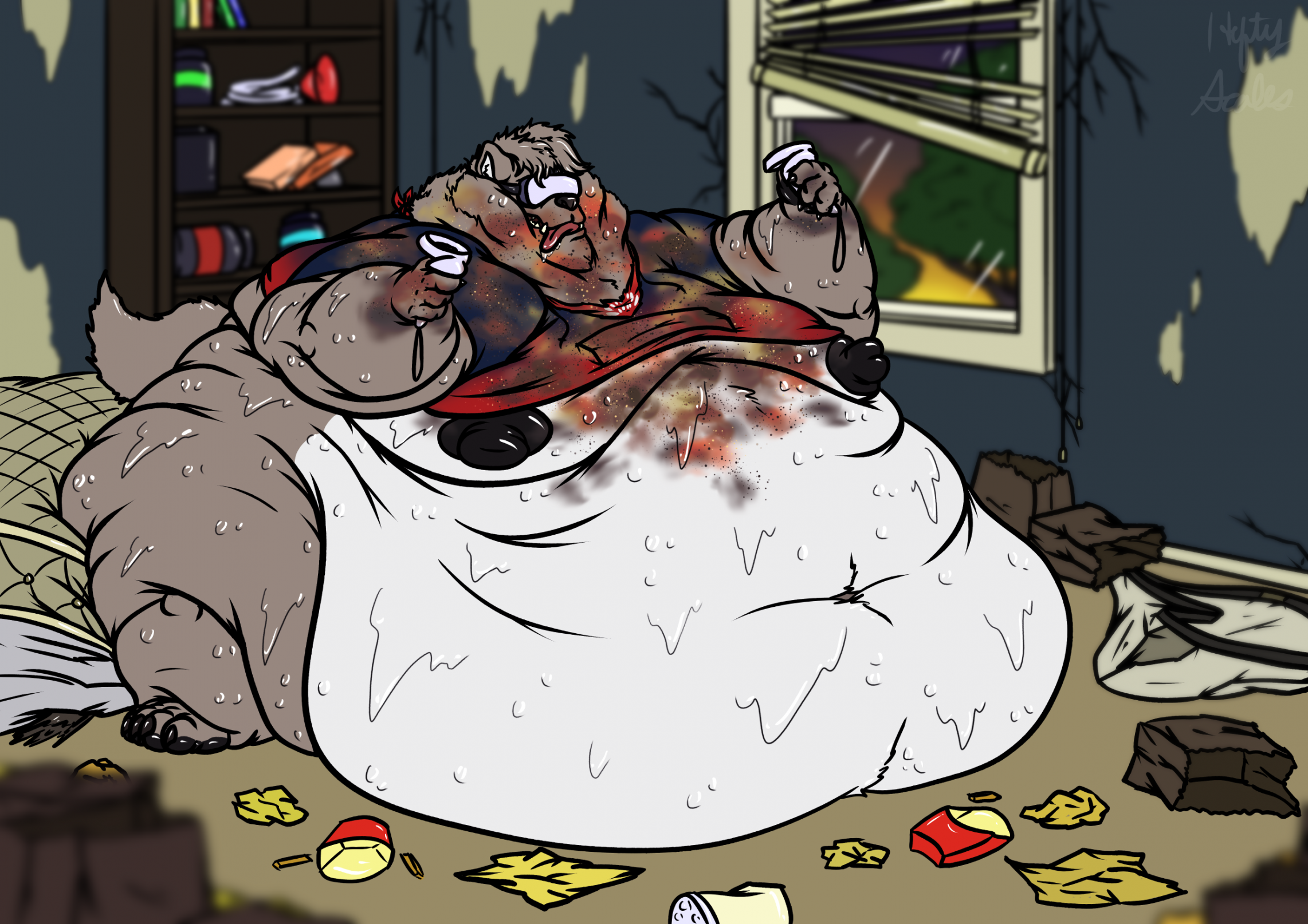 >>90890 I close the fridge behind me, still wheezing and recovering from the waddle over. I clutch a gallon of vanilla ice cream and stack sticks of butter on top of the lid. I’ve been looking forward to this gallon the whole day, leaving it in the fridge as opposed to the freezer to let it melt into a nice slurry. The arduous trek to the couch begins once again, as I clutch the counter and various pieces of furniture to help me across. Some of the chairs creak and groan under my weight. My breath grows raspier, the 10 foot walk being akin to a marathon for my atrophied body. After what seems like an eternity, I make it over to the couch, kicking old chip bags and soda bottles aside. The imprint of my flabby asscheeks permanently caking itself into the poor couch cushions; its legs snapped long ago. I catch my breath as I take a seat, my breaths turning from ones of exertion to ones of desperation. HWOOooOAAARPPP God, that was building for a while. Finally have space for these snacks. I stare at what I can see of myself; my expansive cream belly, covering my lap and sagging further down. I trace my bright red stretchmarks with a pudgy paw, still new from my last stuffing. I cup a handful of my massive moobs; feeling it sag and wobble. My nipples have grown so sensitive since I've gotten so fat… Makes it hard to keep my hands off them… As I drop my snacks on my shelf of a gut, I have a hand free to rub at my nipples. I can’t help but let out a moan. HHHUuurRRRPpp---nnfh I feel a twitch below my belly, remembering my length, buried deep in inches of fatpad. From a mere 4 inches at 200 pounds, to an unknown, lost size at 500 pounds, reaching climax has gotten extraordinarily difficult. Reaching with my paw has been out of the question. I look around, hoping to find something to help, when I spot my wand on the table next to me. Desperately, I grab it. A tubby finger flips the switch on, and the quiet buzz of the wand gets me excited. I move the wand further down, shuffling it around. I try so many angles, I try to shift my gut around in so many different ways. I buzz different parts of my adipose, hoping to reach my fupa. No matter how much I try and push, I can’t get a good angle. HHnnfhgh… Fuck. Fuck. Fuck. I’m not that fat, I’m not that fat. I can still- mmfhghh- do this… My realization turns my cheeks a bright red, and causes a drip of pre to leak into my cave of a fatpad. Realizing what I have to do, I crack open the tub of ice cream and unwrap the sticks of butter. As I buzz vaguely around where I think my cock is, I take my other paw and start chugging the sweet, yummy, icecream. As the cold liquid hits my throat, I can’t help but moan, feeling my buried cock twitch hopelessly. I gulp and gulp, catching my breath every now and then. I take bites out of the sticks of butter, feeling the pure fat hit my tongue causing a similar level of pleasure. The buzzing starts to feel more impactful, as I feel my gut swelling further, pushing my wand further into my plush fupa. Hhhhrhhnnff… Fuck… So good… Gotta get fatter… Fatter… More butter, more ice cream… MMnnnff… The tub of ice cream is cleaned first, throwing the empty gallon aside. I push the vibe’s level to its max, its vibration strong enough to even send ripples through my belly. I feel myself getting even closer and closer. I keep pushing more sticks of butter into my mouth, turning from bites to nearly inhaling them whole. My dick uselessly leaks more pre into the cave it calls a home, hoping it bears an impressive load. As the last stick of butter makes it into my belly, I feel the fullest I’ve ever been. My gut is swollen, full of butter. I’m a greasy, huffing, mess. But this is all it takes. HHhnnhfhnmgfgh-- God, fuck, fuck, c-cumming… So full,, HWWOOOOARRRPPPPP- That last burp sending me over the edge. I feel my dick leak its load into my fatpad. I wish it was strong enough to shoot, but all it does is leak and dribble. My sweet, buttery cum soaking into the couch. As my orgasm comes to a close, I lick some of the drips off my belly. Which reminds me, dinner should be here soon.