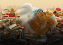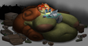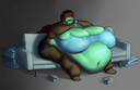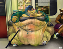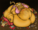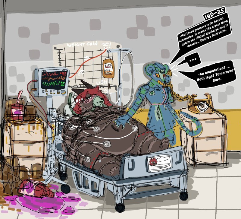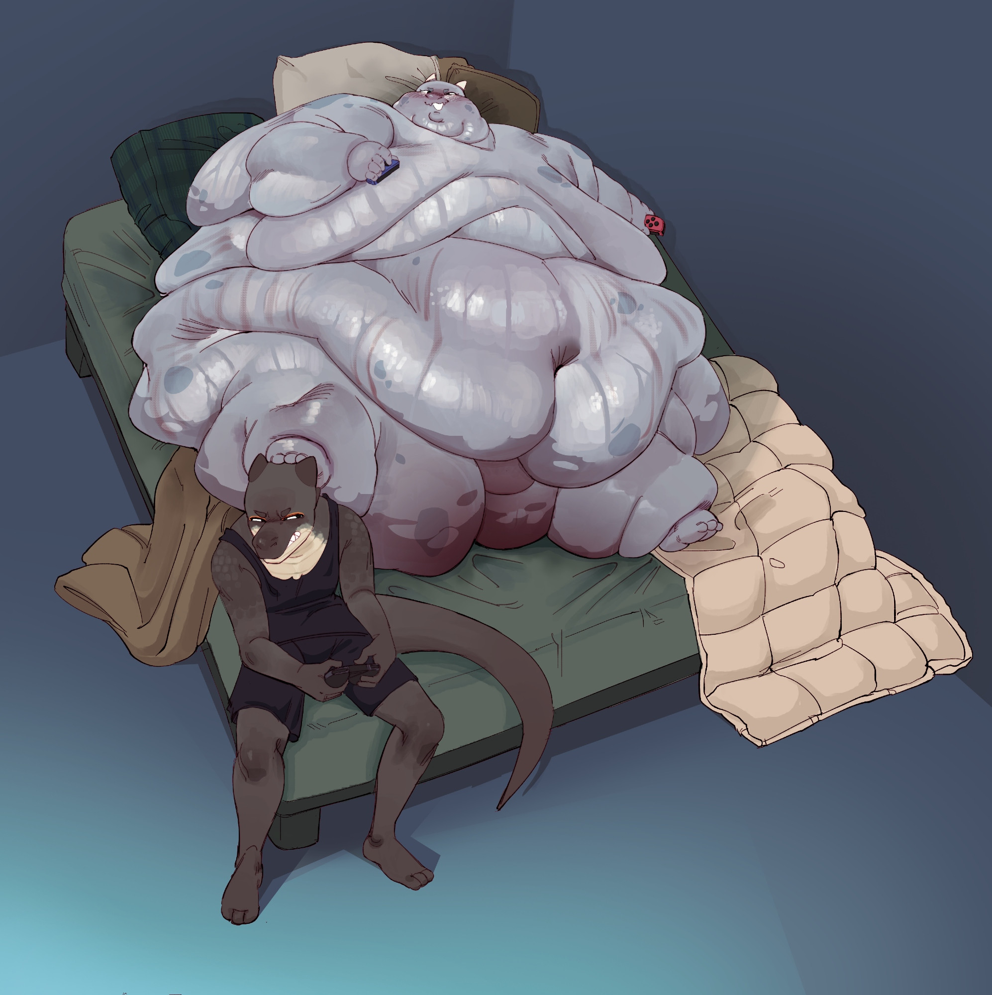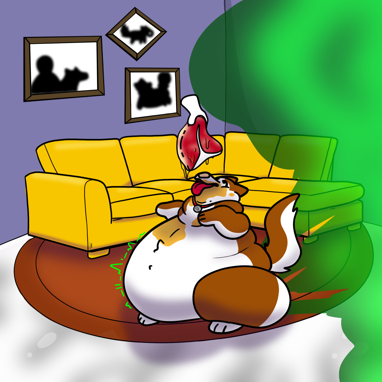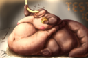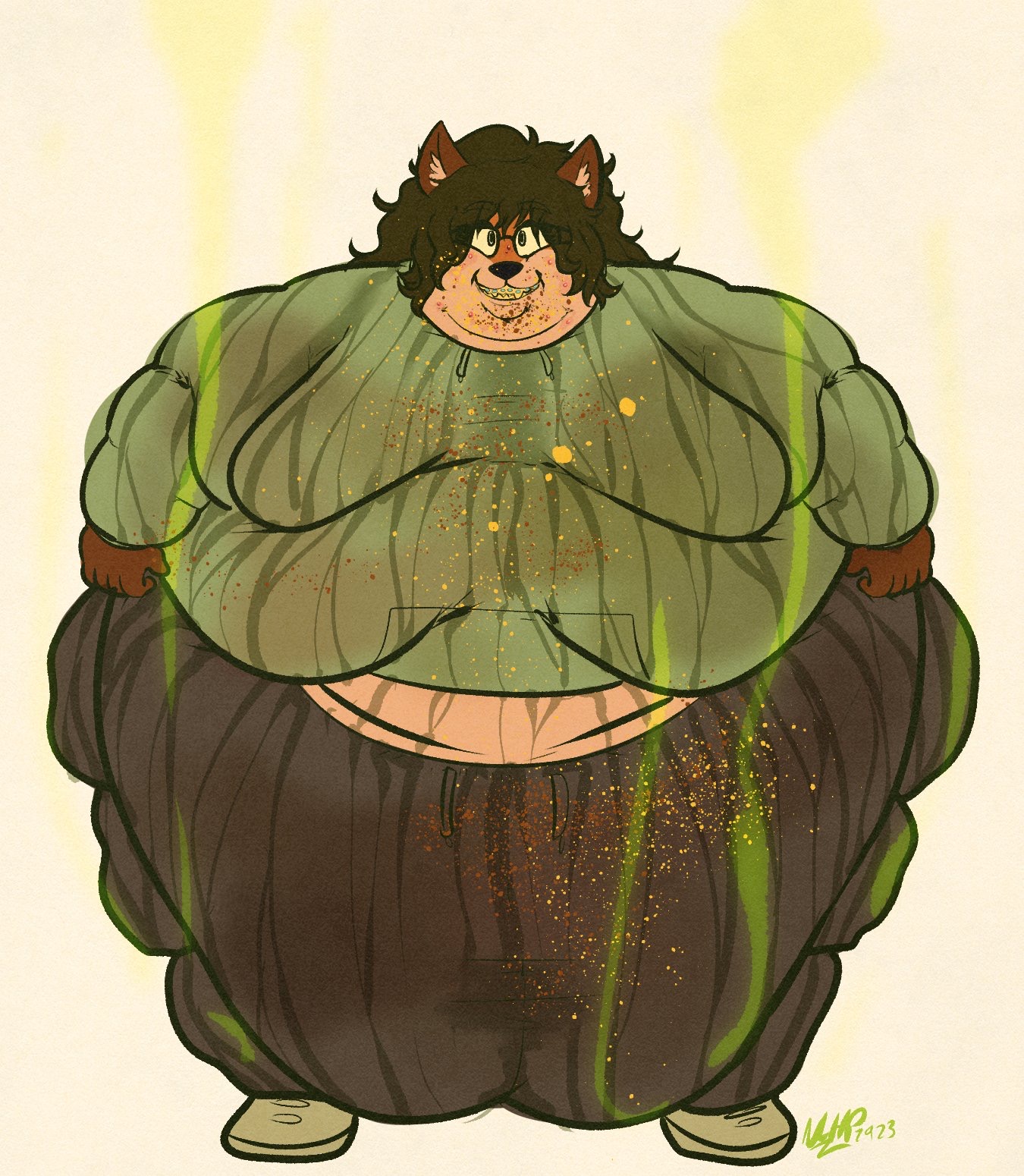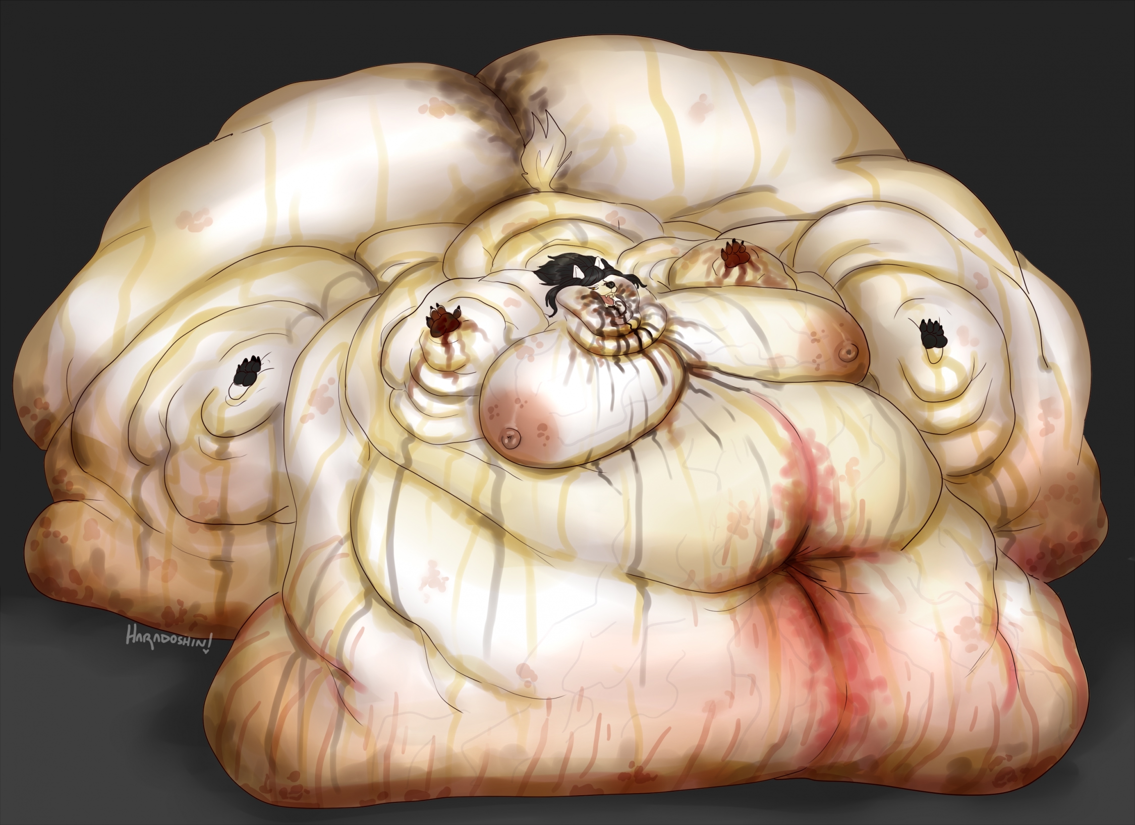 >>90890 I close the fridge behind me, still wheezing and recovering from the waddle over. I clutch a gallon of vanilla ice cream and stack sticks of butter on top of the lid. I’ve been looking forward to this gallon the whole day, leaving it in the fridge as opposed to the freezer to let it melt into a nice slurry. The arduous trek to the couch begins once again, as I clutch the counter and various pieces of furniture to help me across. Some of the chairs creak and groan under my weight. My breath grows raspier, the 10 foot walk being akin to a marathon for my atrophied body. After what seems like an eternity, I make it over to the couch, kicking old chip bags and soda bottles aside. The imprint of my flabby asscheeks permanently caking itself into the poor couch cushions; its legs snapped long ago. I catch my breath as I take a seat, my breaths turning from ones of exertion to ones of desperation. HWOOooOAAARPPP God, that was building for a while. Finally have space for these snacks. I stare at what I can see of myself; my expansive cream belly, covering my lap and sagging further down. I trace my bright red stretchmarks with a pudgy paw, still new from my last stuffing. I cup a handful of my massive moobs; feeling it sag and wobble. My nipples have grown so sensitive since I've gotten so fat… Makes it hard to keep my hands off them… As I drop my snacks on my shelf of a gut, I have a hand free to rub at my nipples. I can’t help but let out a moan. HHHUuurRRRPpp---nnfh I feel a twitch below my belly, remembering my length, buried deep in inches of fatpad. From a mere 4 inches at 200 pounds, to an unknown, lost size at 500 pounds, reaching climax has gotten extraordinarily difficult. Reaching with my paw has been out of the question. I look around, hoping to find something to help, when I spot my wand on the table next to me. Desperately, I grab it. A tubby finger flips the switch on, and the quiet buzz of the wand gets me excited. I move the wand further down, shuffling it around. I try so many angles, I try to shift my gut around in so many different ways. I buzz different parts of my adipose, hoping to reach my fupa. No matter how much I try and push, I can’t get a good angle. HHnnfhgh… Fuck. Fuck. Fuck. I’m not that fat, I’m not that fat. I can still- mmfhghh- do this… My realization turns my cheeks a bright red, and causes a drip of pre to leak into my cave of a fatpad. Realizing what I have to do, I crack open the tub of ice cream and unwrap the sticks of butter. As I buzz vaguely around where I think my cock is, I take my other paw and start chugging the sweet, yummy, icecream. As the cold liquid hits my throat, I can’t help but moan, feeling my buried cock twitch hopelessly. I gulp and gulp, catching my breath every now and then. I take bites out of the sticks of butter, feeling the pure fat hit my tongue causing a similar level of pleasure. The buzzing starts to feel more impactful, as I feel my gut swelling further, pushing my wand further into my plush fupa. Hhhhrhhnnff… Fuck… So good… Gotta get fatter… Fatter… More butter, more ice cream… MMnnnff… The tub of ice cream is cleaned first, throwing the empty gallon aside. I push the vibe’s level to its max, its vibration strong enough to even send ripples through my belly. I feel myself getting even closer and closer. I keep pushing more sticks of butter into my mouth, turning from bites to nearly inhaling them whole. My dick uselessly leaks more pre into the cave it calls a home, hoping it bears an impressive load. As the last stick of butter makes it into my belly, I feel the fullest I’ve ever been. My gut is swollen, full of butter. I’m a greasy, huffing, mess. But this is all it takes. HHhnnhfhnmgfgh-- God, fuck, fuck, c-cumming… So full,, HWWOOOOARRRPPPPP- That last burp sending me over the edge. I feel my dick leak its load into my fatpad. I wish it was strong enough to shoot, but all it does is leak and dribble. My sweet, buttery cum soaking into the couch. As my orgasm comes to a close, I lick some of the drips off my belly. Which reminds me, dinner should be here soon.