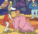 >>88324 Some characters were not intended to appear large and broad, such as the Queen of Gondoland. Focusing on the scene where she looks at herself in the mirror (see Figure 1), she first gazes into it, then gradually turns her back to it, and finally glances back. During this sequence, she repeatedly says, "I'm fat. I'm fat. I'm fat. I'm fat." In the first two repetitions, she seems aware of her size as she examines her reflection, but in the last two, she appears more at ease with it. However, her body underneath her royal gown doesn't seem as wide as her dress suggests—she looks too big to wear it comfortably (similar to Bob's shirt in Figure 2), as shown in the subsequent media files. Figure 3 displays the front cover of the 2021 publication "Muzzy and the Gondoland Disco," where Sylvia is dancing with the Queen, performing the "lay back" move from Lambada. Figure 4 is a screenshot from the 1997 PC game of the same name, showing Sylvia and the Queen doing bicycle crunches, implying her body resembles that of a plus-size model. Figure 5, from the 2013 CGI/Flash remake, indicates that the Queen was slightly slimmed down—her gown was resized accordingly—and all references to the characters’ body weights were removed. This disappointed fans who hoped the original "obese" (more accurately, plus-sized) Queen would remain unchanged. Notably, this character was absent from the initial montage where characters describe themselves with a single word, except when she comments on others (see this link: https://youtu.be/nxllySllKbE?si=DC0IwmbeJPvKr4co&t=231). Finally, Figure 6 shows a screenshot from the 1986 direct-to-video installment, where the Queen is relaxing outdoors on a lounge chair.