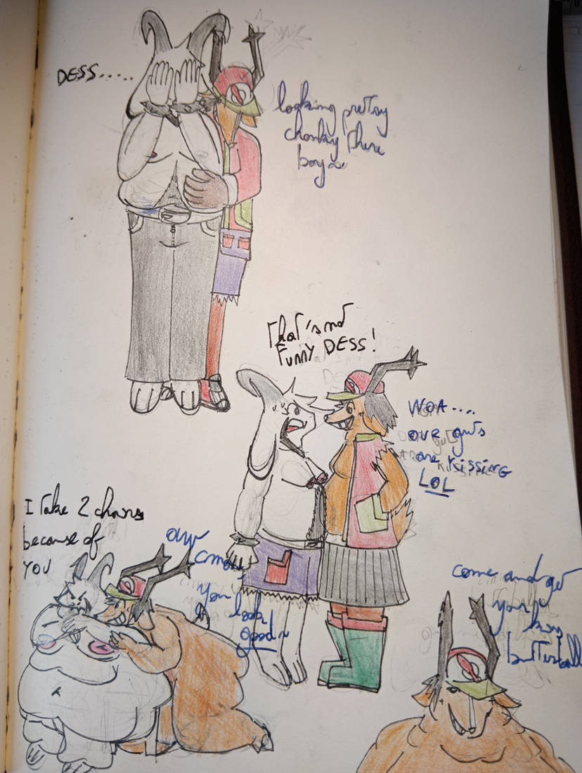 >>100908 Here's what is says: "Dess...." -"Looking pretty chonky there boy~" "That's not funny Dess !" -"Woa, our guts ate kissing LOL" "I take two chairs because of you..." -"Aw, come on you look good" -"Come and get your kiss butterball~"