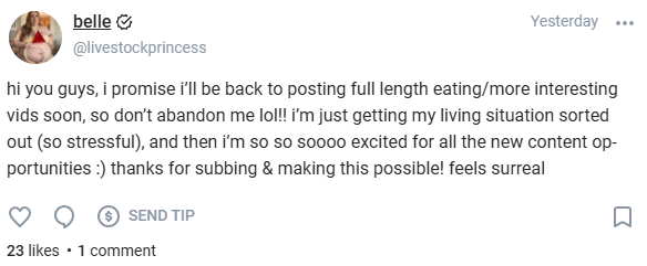 >>230070 She quit her job a while ago. She made a post on tumblr about when she moves out she'll have to keep getting fatter to pay the bills