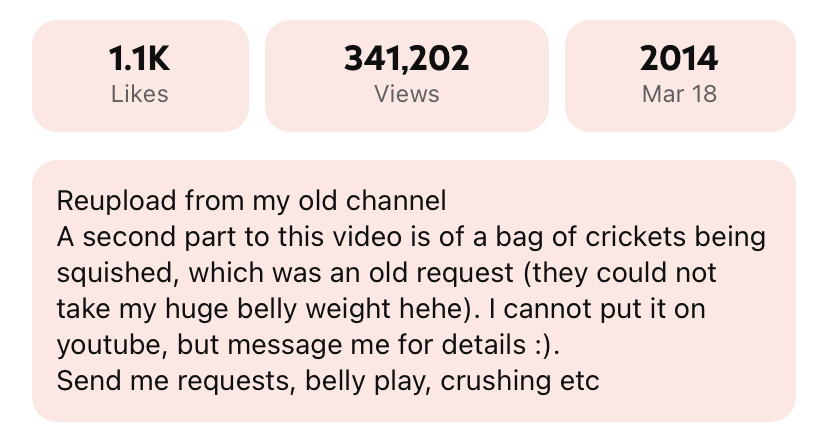 I have thought about this lost vid for years, because I’ve never heard of another like it and because of how disturbing it sounds AwesomeSSBBW from back in the day made a video of her squishing crickets with her gut. I was curious if anybody else had heard of this vid, had it, or has it. I understand if the mods wanna take this post down cause of how creepy it sounds/is.