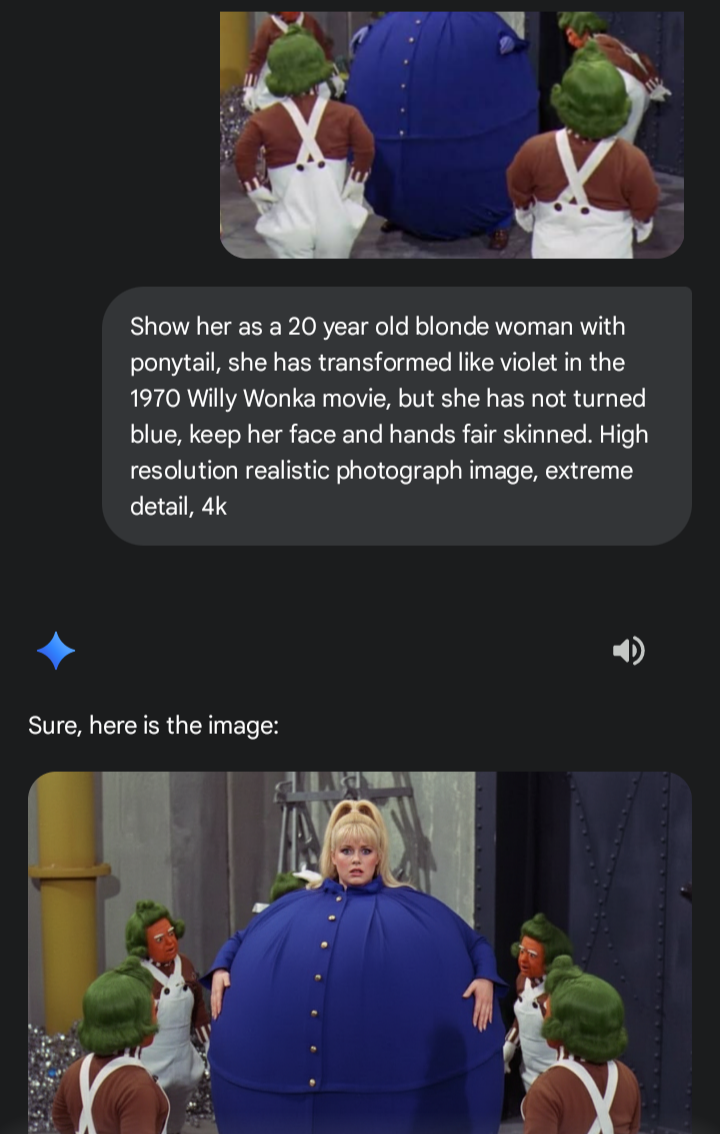>>37007 I used the exact prompt then modified it twice. Was 4/5, had to add the last lines on the last one when it depicted her in oompa loompa traditional cultural dress the first time. Try using a different Gemini account. I noticed one of the Google accounts I use is now much more restrictive but I can do this in the others.