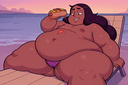 I did Nega-Shantae or Negative Shantae… whatevs Prompt: (nega-shantae from Shante: 1girl,solo,pointy ears,red hair,navel,midriff,very long hair,ponytail,silver jewelry,earrings,large breast, hoop earrings,yellow eyes,glowing eyes,cleavage,forehead jewel,purple skin,silver bracer,choker,pants,harem pants,silver tiara, high ponytail,shoes, purple o-ring bandeau, silver vambraces, purple pants, purple shoes,bare shoulders, circlet), massive breasts, big breasts, round breasts, fat chest, sexy body, detailed eyes, outdoors, (masterpiece),(best quality),(character detailed), masterpiece, best quality, amazing quality, hyper-Detailed, high resolution, extremely thick, chunky legs, Jumping, bouncing belly, voluptuous, corpulent, chubby, huge thighs, obese, thick arms, large breasts, thick arms, belly, ussbbw, good anatomy, wide hips, overweight female, morbidly obese swollen face,full bodyunderneath chest, underneath breast focus, from below, underneath her, (((bottom view))), belly sticking out, eyelashes , heavy steps, wide body, perfect anatomy, plump fupa, saggy breasts, resting, standing,fat feet, thick legs, ankle fat, no irises, no pupils, massive belly, belly overhang, huge gut, purple smoke on the floor, obese female, fat rolls, double chin, neck fat, Ssbbw, (weight: 700 lbs), pudgy face, fat fingers, fat hands, sinister smile, gigantic belly, fat arms, fat legs, tight clothes, straining clothing, Negative: NSFW, worst quality, bad quality, low quality, lowres, scan artifacts, jpeg artifacts, sketch, (worst quality, bad quality:1.1), lowres, jpeg, artifacts, signature, username, text, logo, bad anatomy, artist name, artist logo, extra limbs, extra digit, extra legs, extra legs and arms, disfigured, missing arms, too many fingers, fused fingers, missing fingers, unclear eyes, blur, film grain, noise,