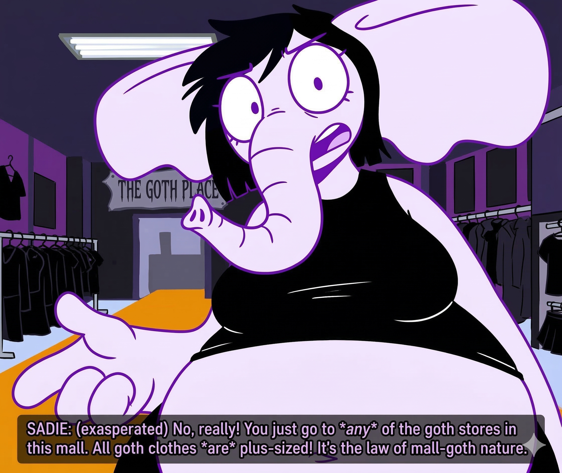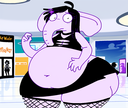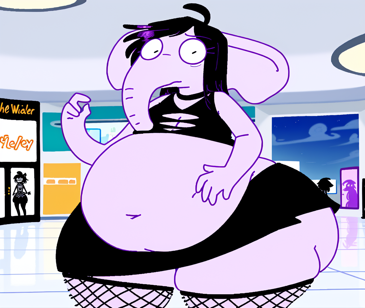 highly detailed CGI render depicting a hyper obese short sassy 500lbs stylized emo anthro leopardgecko slob leaning backwards with her massive round blubbery middle dragging on the ground, extremely bloated, fully clothed wearing muumuu, sweaty baggy black tshirt with "FOOD BLIMP" printed on it, monstrously obese cheeks, her monstrously obese double chin is squished against her chest, monstrously obese groin fupa dragging on the ground between her short legs, extremely obese short arms out to her sides, fat smothering her face, acne, she is at a public country fair, grassy ground, sunshine, winged eyeliner, pretty eyes, dark purple messy emo hair with messy ponytail, side view, candid shot. there are a few anthro characters in the background,