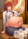 (With careful precision, she guides your head down—until it rests against her belly. The soft fabric of her sweater molds around you, and another deep, sluggish gurgle echoes from within her stomach. Her hand slides into your hair, fingers running through it with slow, deliberate strokes.)