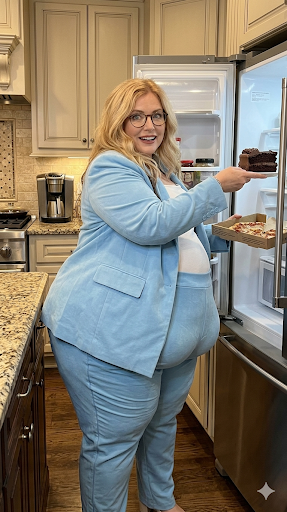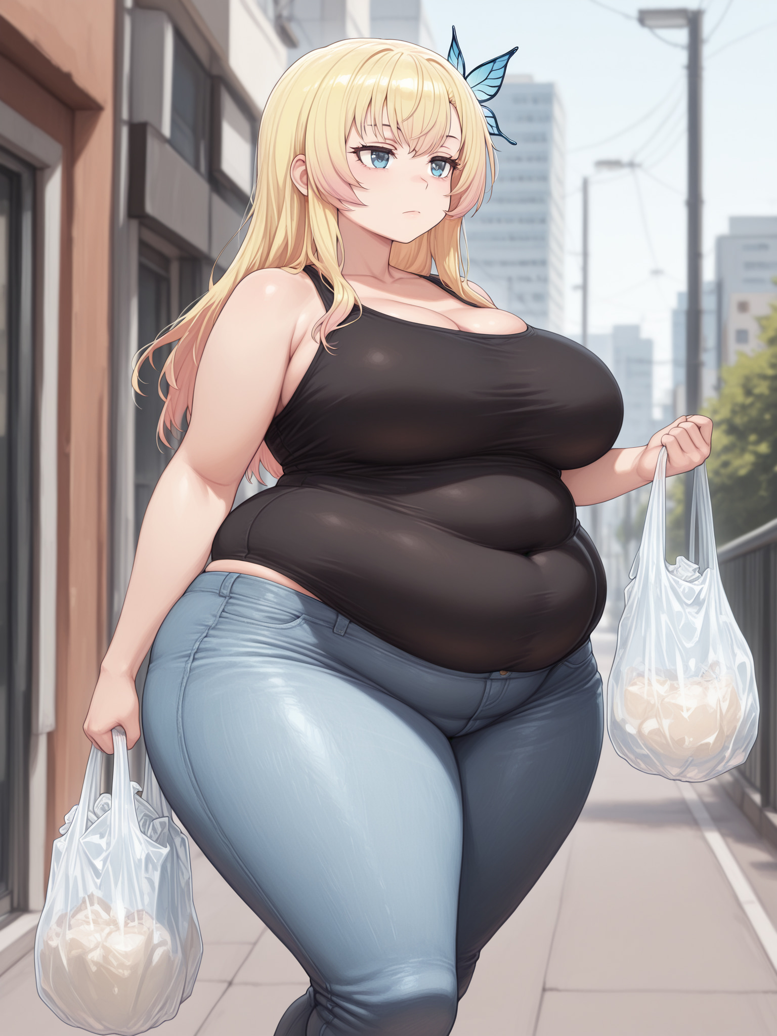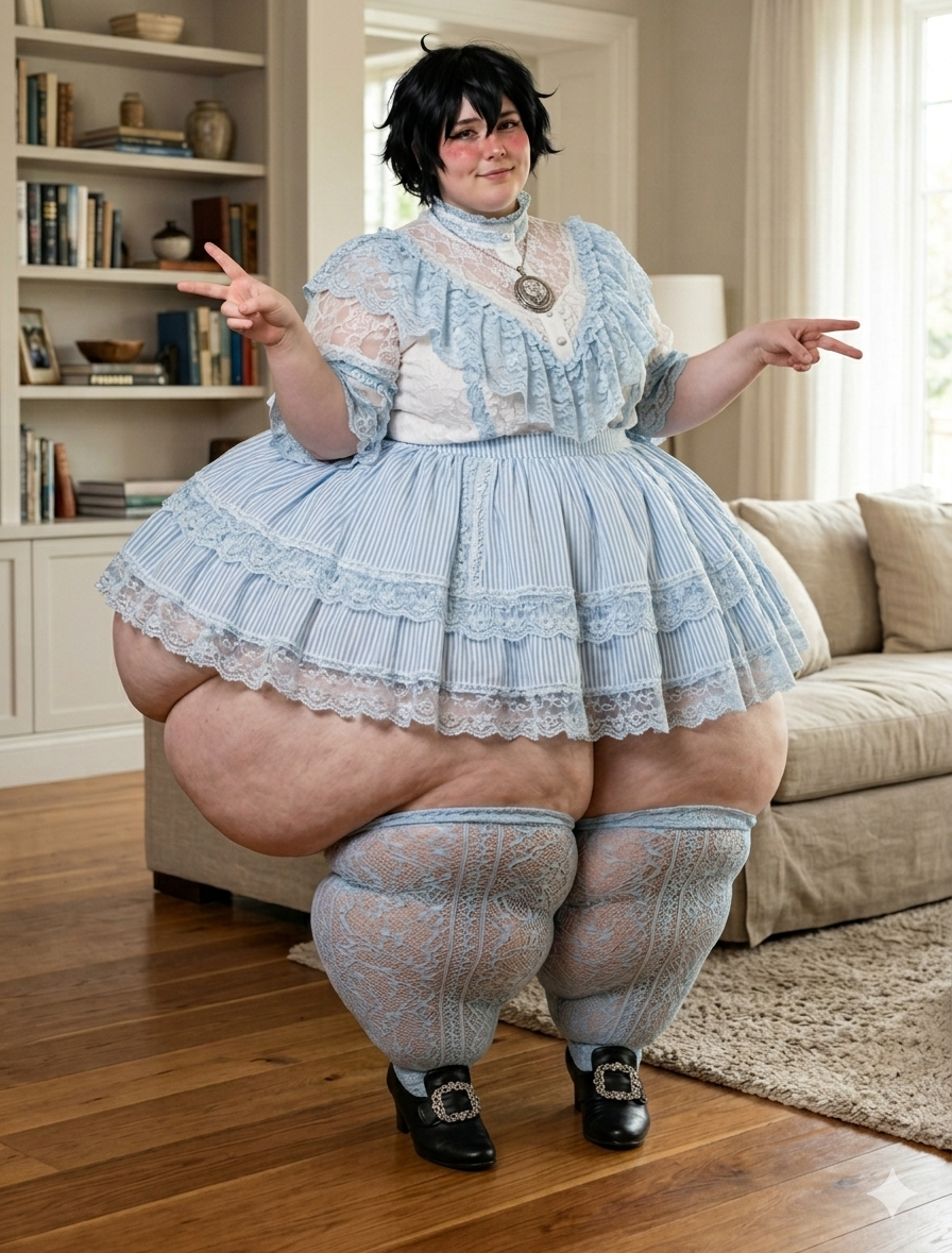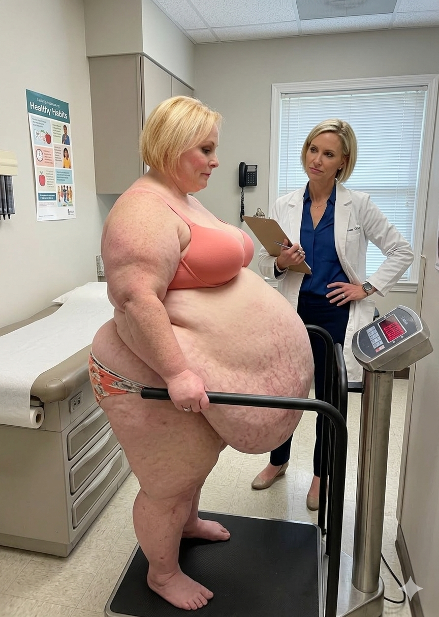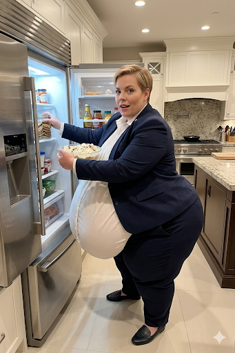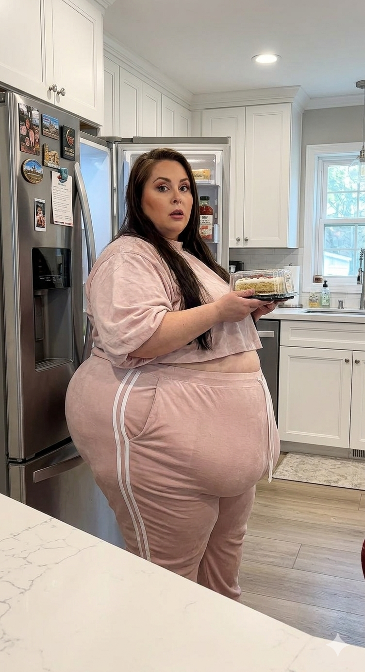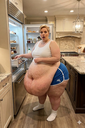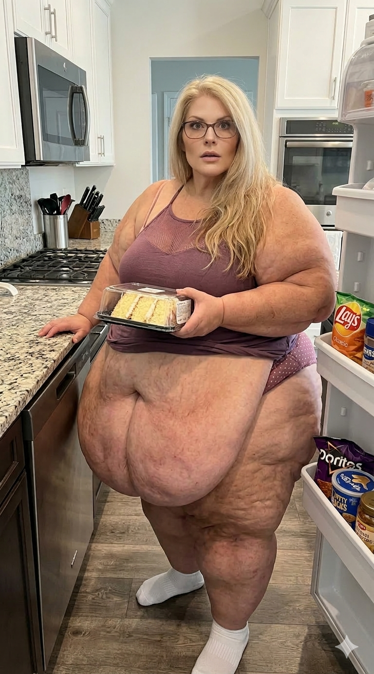 I used reference images of actual ssbbws that I had already face swapped (blue panties is party, pink bra is celia, images in my deviantart account youonlgetonebody and youonlygetonebody2) and used this prompt or something similar to it: "Create a high-resolution candid photo (captured by another person on their phone camera) of this same subject, taken as she stands in kitchen raiding he fridge for fattening snacks in a upscale upper middle class house . wide angle. Subject is mildly surprised to be photographed. The subject should appear to be the extremely fat and obese , extremely super-obese. Extreme overwhelming body fat interacts with the environment, squishes against things, spills onto things, etc. Body fat hangs loosely and is extremely voluminous and doughy.. Preserve the subject's extreme body type exactly. Pose is natural, playful, and imperfect; composition is asymmetrical.. Pose should be different from the input image. Her face is cute and beautiful and she is 45 years old.. she had a beautiful face that is relatively thin. Same outfit and exact same body size and shape. She is a formerly thin beautiful woman who now weighs over 600 pounds. She has an immensly fat disproportionately large low hanging belly that hangs between her legs. Her hips and.backside are monumentally fat and wide, her hips and backside are wider than a standard door. Show her massive hanging belly apron belly outline under her dress. Extreme ultra pear shaped body, massively wide hips and backside. Emphasis and focus of image on her extremely wide body. Her belly button is low on her belly. No hand in picture no phone..no other people in picture. Same body size and shake and outfit."