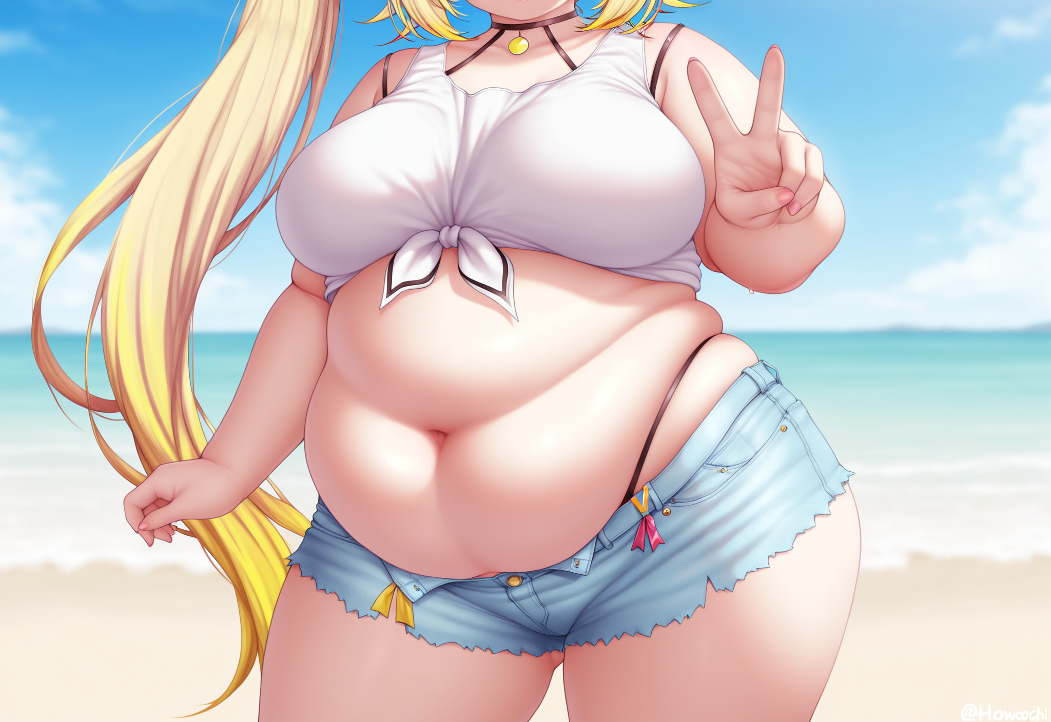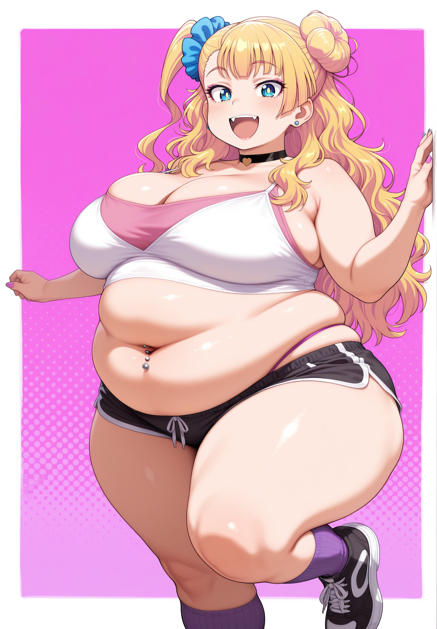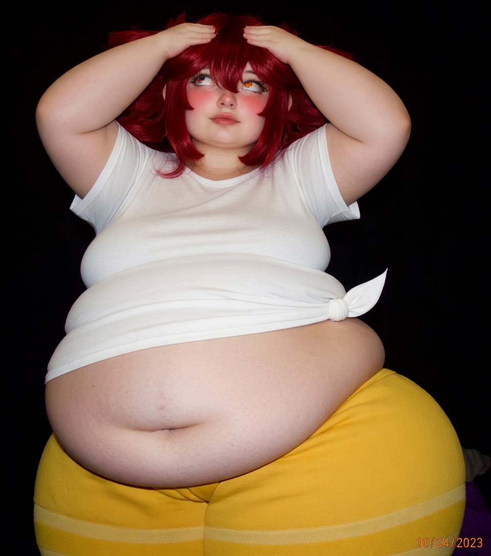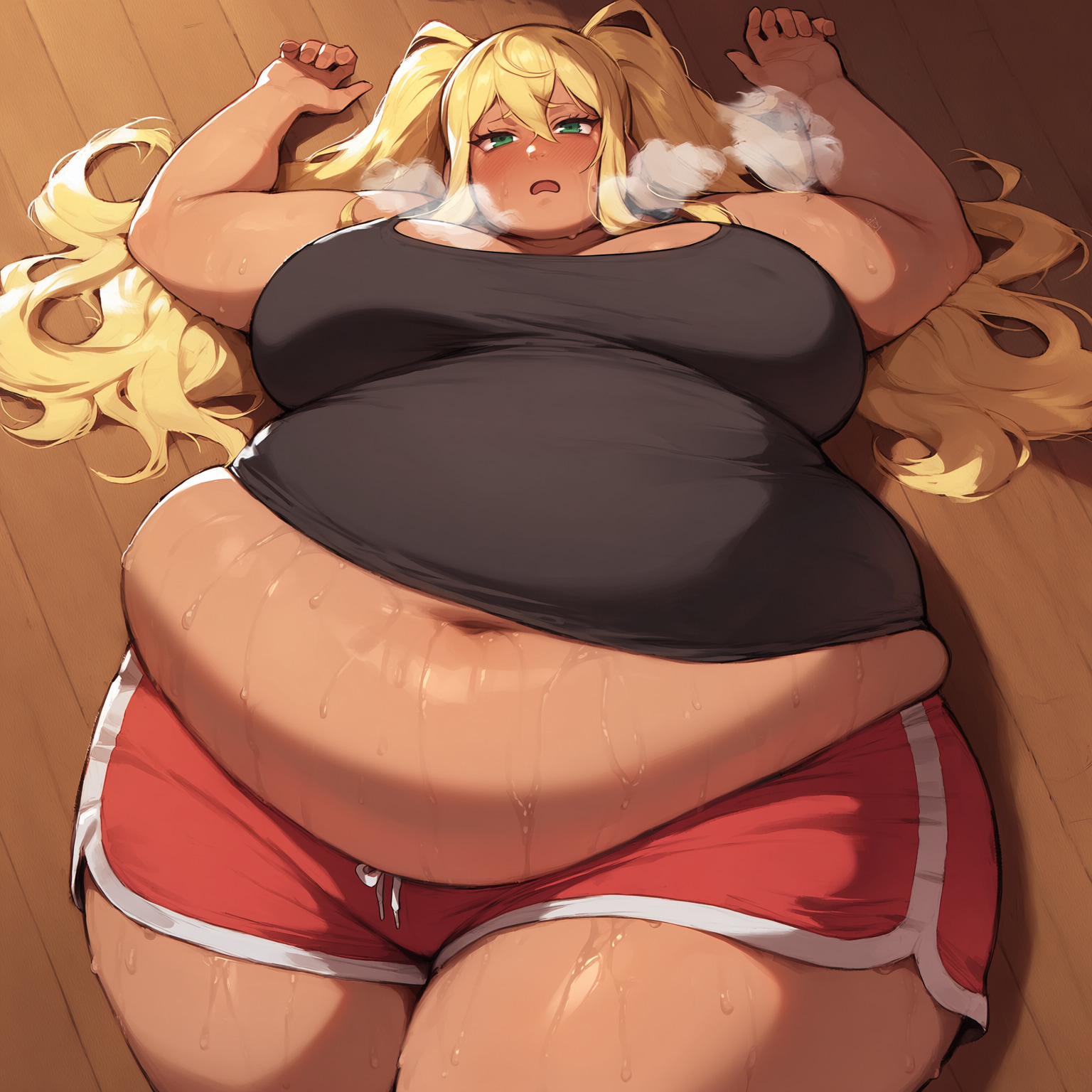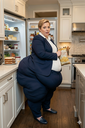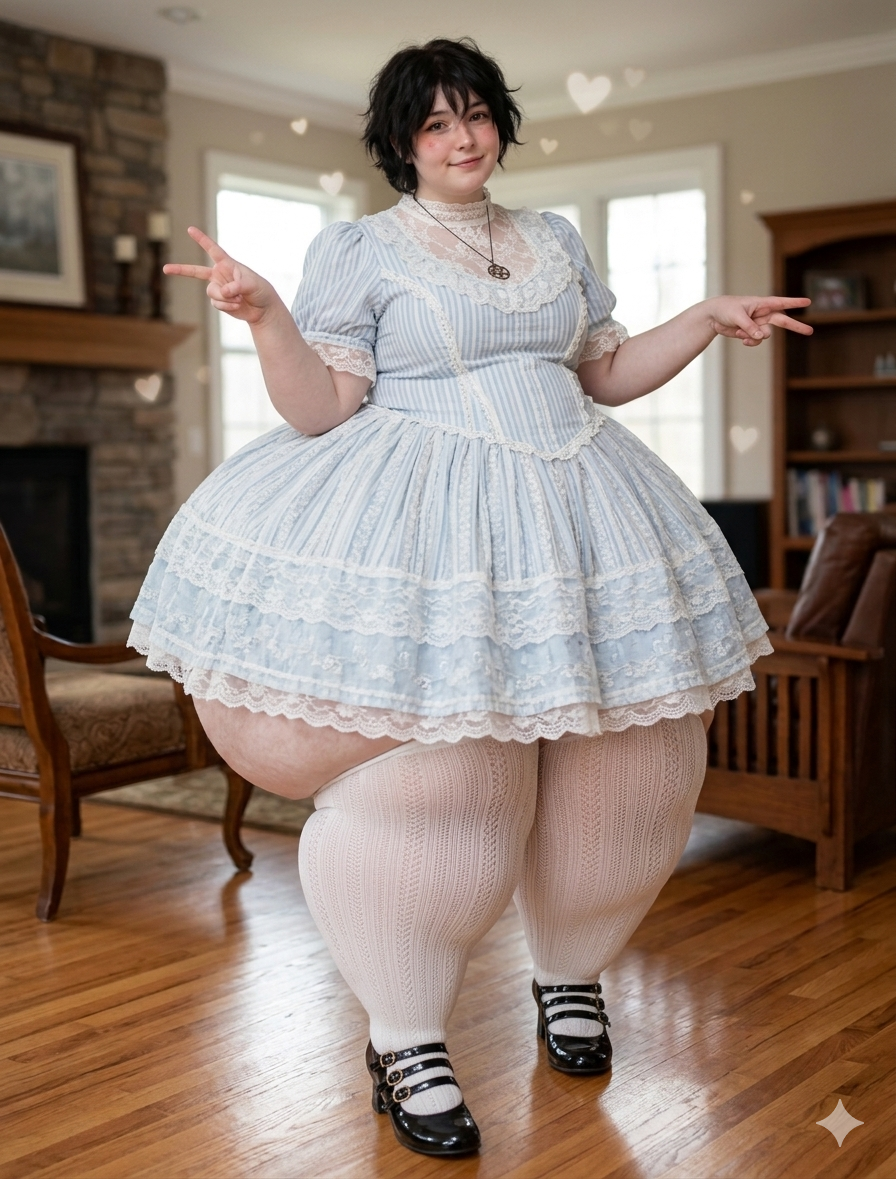 I used reference images of actual ssbbws that I had already face swapped (blue panties is party, pink bra is celia, images in my deviantart account youonlgetonebody and youonlygetonebody2) and used this prompt or something similar to it: "Create a high-resolution candid photo (captured by another person on their phone camera) of this same subject, taken as she stands in kitchen raiding he fridge for fattening snacks in a upscale upper middle class house . wide angle. Subject is mildly surprised to be photographed. The subject should appear to be the extremely fat and obese , extremely super-obese. Extreme overwhelming body fat interacts with the environment, squishes against things, spills onto things, etc. Body fat hangs loosely and is extremely voluminous and doughy.. Preserve the subject's extreme body type exactly. Pose is natural, playful, and imperfect; composition is asymmetrical.. Pose should be different from the input image. Her face is cute and beautiful and she is 45 years old.. she had a beautiful face that is relatively thin. Same outfit and exact same body size and shape. She is a formerly thin beautiful woman who now weighs over 600 pounds. She has an immensly fat disproportionately large low hanging belly that hangs between her legs. Her hips and.backside are monumentally fat and wide, her hips and backside are wider than a standard door. Show her massive hanging belly apron belly outline under her dress. Extreme ultra pear shaped body, massively wide hips and backside. Emphasis and focus of image on her extremely wide body. Her belly button is low on her belly. No hand in picture no phone..no other people in picture. Same body size and shake and outfit."