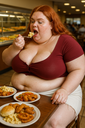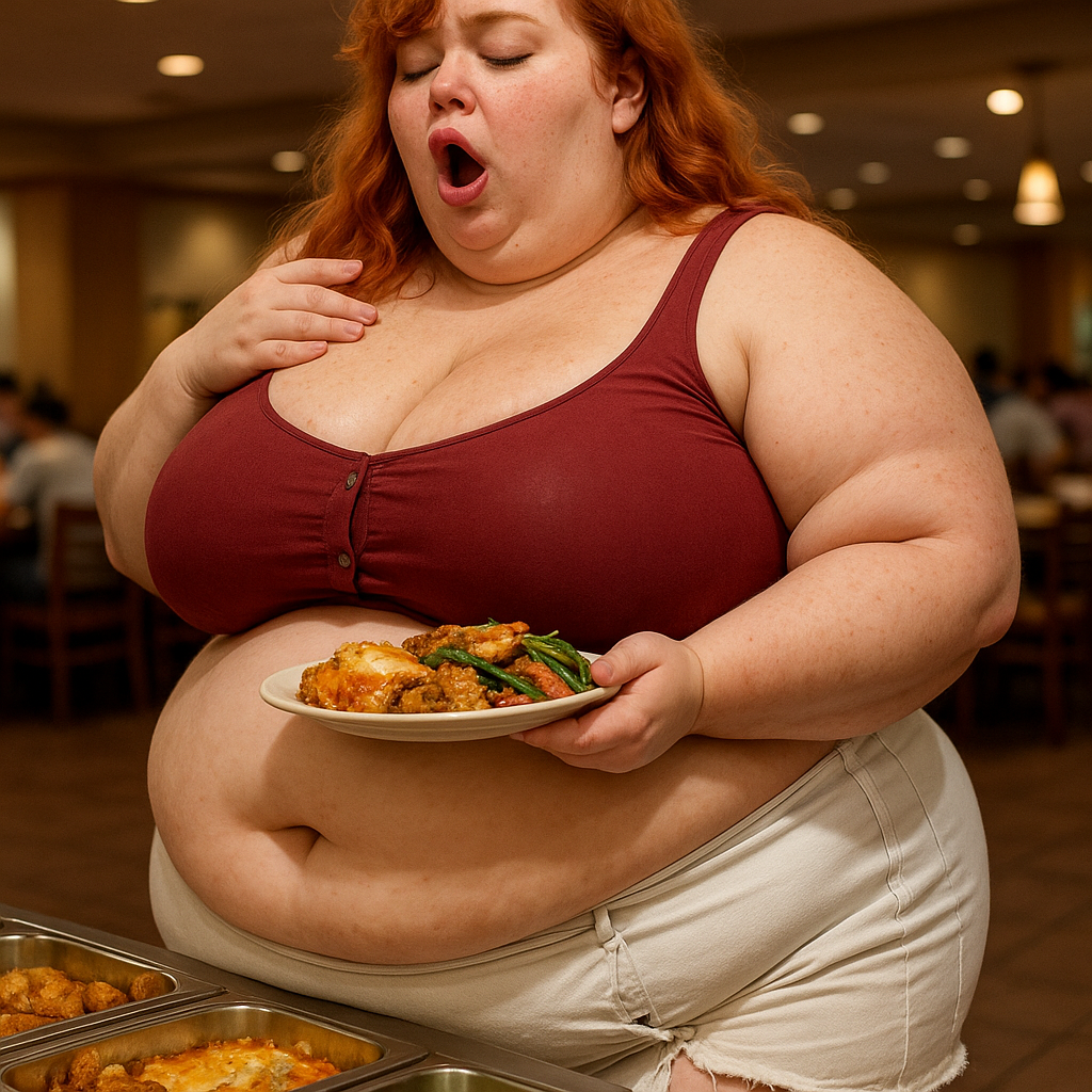 In a tranquil suburban haven, a fragile ray of morning light gently filters through the curtains, caressing the opulent figure of Amelia as she stirs in the embrace of her voluminous bed. Her body, a voluptuous masterpiece of curves and softness, commands attention with each contour—an inviting belly that swells gently, thighs that brush delicately against each other in a sensual dance, breasts that command attention with their substantial presence, and a sumptuous butt that caresses the fabric of her pajama bottoms with each languid movement. With a determined resolve and a palpable anticipation, Amelia endeavors to extract herself from the cocoon of her bed, the soft mattress groaning in reluctant response to the weight she bears. As her generous form stirs, the fabric of her pajamas strains against the plush expanse of her body, the seams gently protesting as they cradle the abundant curves that they encase. Rising from the bed is a feat of physicality, each motion a testament to the gravitational pull her figure exerts—an interplay of softness, weight, and the gentle rhythm of her breath. As the day unfurls, a fresh challenge emerges—Amelia's insatiable appetite. Her meals have expanded to new heights of indulgence and unhealthiness. Breakfast beckons with a symphony of gluttony—a towering stack of syrup-drenched pancakes, a mountain of scrambled eggs drenched in cheese, and a cascade of bacon that crackles and sizzles in delight. The table groans under the weight of her feast, her body's anticipation mirroring the grandeur of the meal that awaits her. Amelia's fingers navigate the mountain of food with practiced expertise, each bite a testament to her unapologetic embrace of pleasure. The allure of mid-morning snacking beckons, and she reaches for four substantial bags of crisps, their crinkling melodies accompanied by the rhythmic swish of fabric against her figure. Her grasp on the gallon-sized bottle of sugary soda speaks of her undying commitment to indulgence—each sip, a pledge to embrace her cravings with resolute abandon. Crumbs collect on her ample lap and fingers, a consequence of the struggles her figure endures, her fingers sinking into the pliant flesh that envelopes her form. Lunch arrives, a feast of epic proportions that defies the boundaries of health. Burgers, fries, and an assortment of sauces transform her table into a grand display of decadence. Amelia's fingers dive into the culinary wonderland, her lips and teeth tearing into the layers of food with a hunger that matches her figure's abundance. With each bite, her belly rumbles, a sonorous symphony of indulgence that accompanies her dining experience. As the day progresses, Amelia's appetite remains insatiable. Afternoon snacking becomes an intricate ballet of opening bags, consuming with abandon, and pausing only to burp with contentment. Her figure takes center stage as she indulges, each movement accentuating her sensuous curves and contours, her fingers and lips becoming the instruments of her pleasure. Dinner, the crowning glory of her day, becomes an extravagant affair that defies all reason. A feast laid out like a banquet—rows upon rows of fast food delicacies, a buffet of indulgence that stretches as far as the eye can see. Burgers tower like skyscrapers, their layers dripping with cheese and sauce. Fried chicken, onion rings, and mountains of fries beckon, each bite a celebration of excess and abundance. Amelia's eyes widen in awe as she surveys the culinary wonderland before her, her heart racing with anticipation. With each plateful she fills, her body responds with audible satisfaction—burps and gentle farts punctuating the symphony of her feasting, a harmonious tribute to her insatiable desires. She relishes in the chaos of flavors and textures, her body's journey mirroring the extravagant buffet that surrounds her. Amidst her feast, Amelia rises from her seat, her figure swaying with the effort. Her struggles are palpable—each step a delicate dance, her thighs rubbing against one another, her belly spilling generously over the waistband of her pants. She navigates the space with a deliberate grace, each movement accompanied by a symphony of her own—a soft panting, the occasional creak of fabric, and the muted thud of her footsteps. And then, a door frame—a seemingly innocuous obstacle that halts her progress. As Amelia attempts to maneuver through, her figure becomes wedged, her softness resisting the space's confines. A moment of frustration ensues, her breaths growing heavy as she works to extricate herself, her ample hips and belly resisting the frame's embrace. With a final effort, she breaks free, her form trembling with the exertion. Her relief is palpable, each breath a testament to the challenges her figure navigates with unyielding determination. As the day draws to a close, Amelia's body bears the marks of her indulgence—soft skin glistening with a patina of sweat, a testament to the exertions she has experienced. Her scent, a potent blend of perspiration and the lingering aroma of fast food, is a tangible reminder of her journey—a journey of pleasure and self-discovery. Every breath carries the weight of her experiences, her inhalations deep and deliberate, a rhythm that matches the pulse of her existence. With a contented sigh, she slips beneath the covers, her body settling into the plushness of the bed, the contours of her form becoming one with the bedding's embrace. And so, the day ends—a tapestry woven with the threads of pleasure, self-discovery, and the unapologetic embrace of her figure's sensuous symphony. In the quietude of the night, as Amelia's breaths sync with the rhythm of her surroundings, her body remains a testament—to her journey, her desires, and the exquisite mosaic of moments that define her existence.