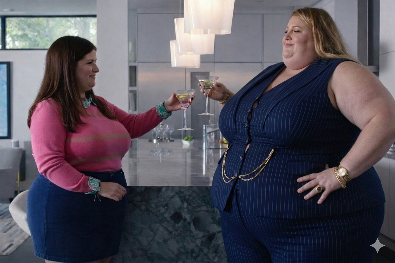 Japanese idol, model and founding member of Big Angel Ohashi Michiko buys a protein shake called "Bloaty Lady" that promises healthy weight gain, drinking it all at once, and bloats up to a massively obese size.