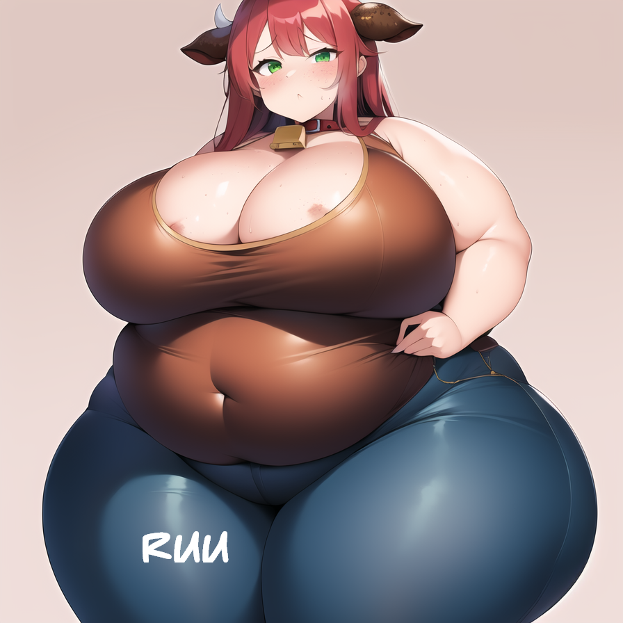 There’s this one image from an early day image request (I think) where it had a fat redhead demon lady with cow horns and a cowbell. It’s similar to the image above, but she’s fully naked and holding her belly with her hands.