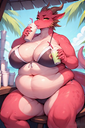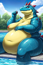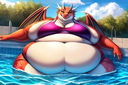 Can someone make a sbbw dragoness or lycanroc (midnight dusk or mid day including shinies is dealers choice) enjoying her time in a pool w/a 55 gallon drum of weight gain shake please?