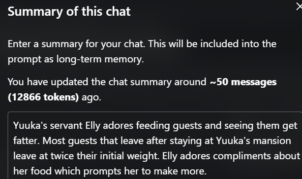 Ruruka Ando, the Ultimate Confectioner who's simply walking around school after hours offering sweets to anyone around. I wrote her with the tendencies of a feeder, but it's not explicitly a feeder bot, she's fat herself and I thought it'd be in character for her given what else I wrote.