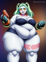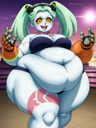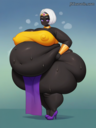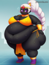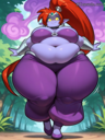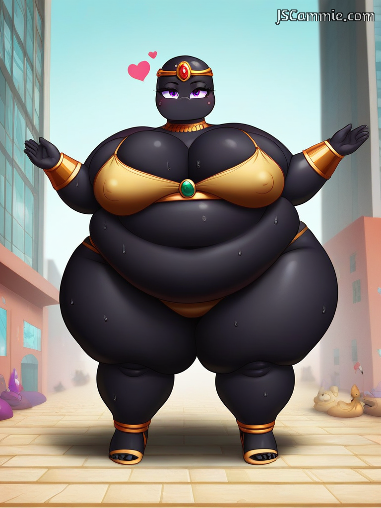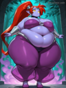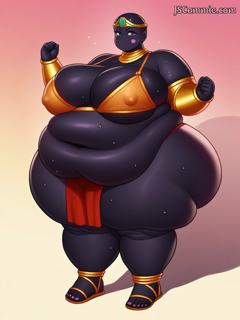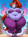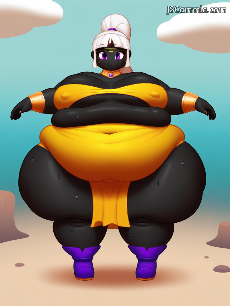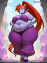 I did Nega-Shantae or Negative Shantae… whatevs Prompt: (nega-shantae from Shante: 1girl,solo,pointy ears,red hair,navel,midriff,very long hair,ponytail,silver jewelry,earrings,large breast, hoop earrings,yellow eyes,glowing eyes,cleavage,forehead jewel,purple skin,silver bracer,choker,pants,harem pants,silver tiara, high ponytail,shoes, purple o-ring bandeau, silver vambraces, purple pants, purple shoes,bare shoulders, circlet), massive breasts, big breasts, round breasts, fat chest, sexy body, detailed eyes, outdoors, (masterpiece),(best quality),(character detailed), masterpiece, best quality, amazing quality, hyper-Detailed, high resolution, extremely thick, chunky legs, Jumping, bouncing belly, voluptuous, corpulent, chubby, huge thighs, obese, thick arms, large breasts, thick arms, belly, ussbbw, good anatomy, wide hips, overweight female, morbidly obese swollen face,full bodyunderneath chest, underneath breast focus, from below, underneath her, (((bottom view))), belly sticking out, eyelashes , heavy steps, wide body, perfect anatomy, plump fupa, saggy breasts, resting, standing,fat feet, thick legs, ankle fat, no irises, no pupils, massive belly, belly overhang, huge gut, purple smoke on the floor, obese female, fat rolls, double chin, neck fat, Ssbbw, (weight: 700 lbs), pudgy face, fat fingers, fat hands, sinister smile, gigantic belly, fat arms, fat legs, tight clothes, straining clothing, Negative: NSFW, worst quality, bad quality, low quality, lowres, scan artifacts, jpeg artifacts, sketch, (worst quality, bad quality:1.1), lowres, jpeg, artifacts, signature, username, text, logo, bad anatomy, artist name, artist logo, extra limbs, extra digit, extra legs, extra legs and arms, disfigured, missing arms, too many fingers, fused fingers, missing fingers, unclear eyes, blur, film grain, noise,