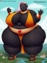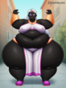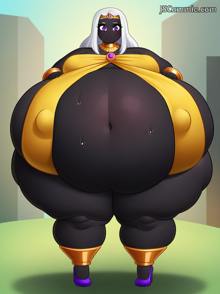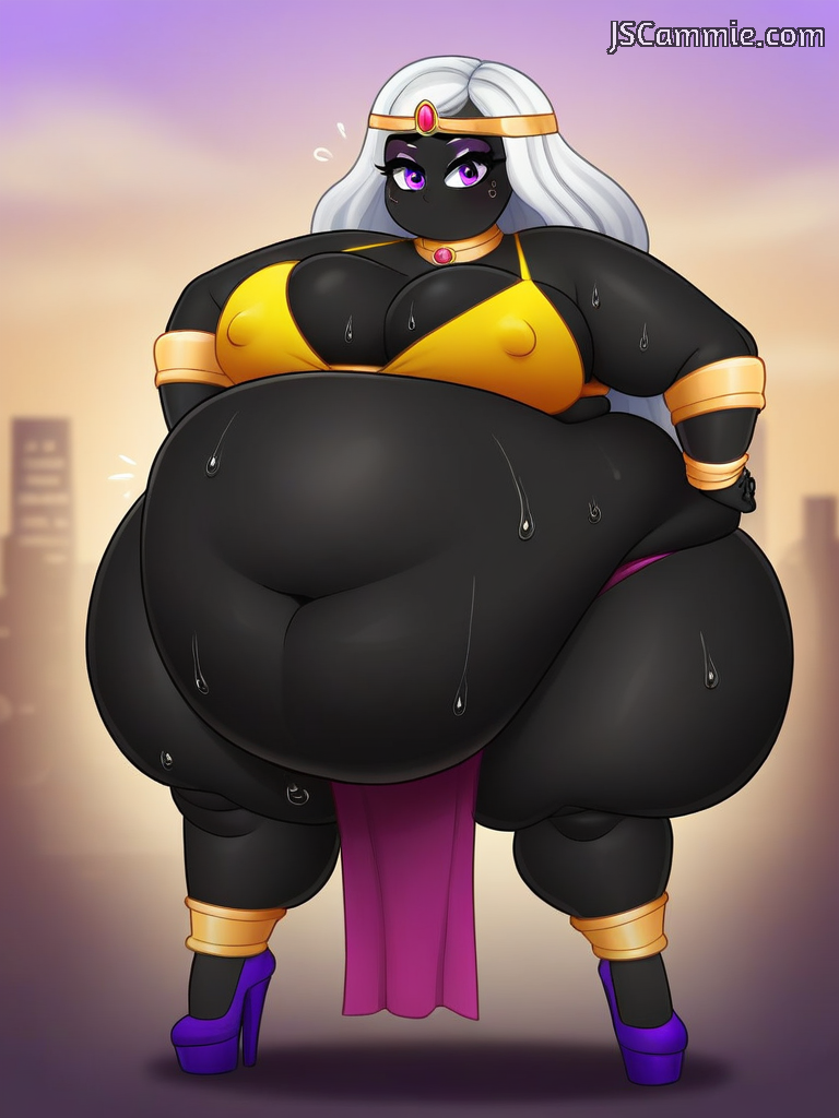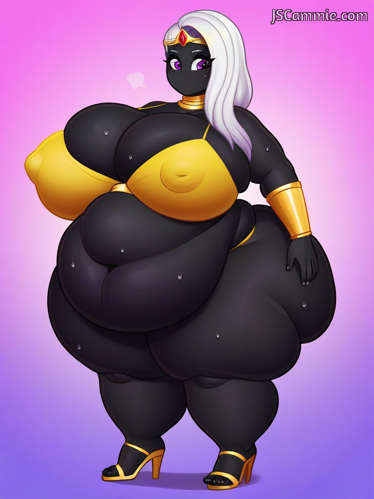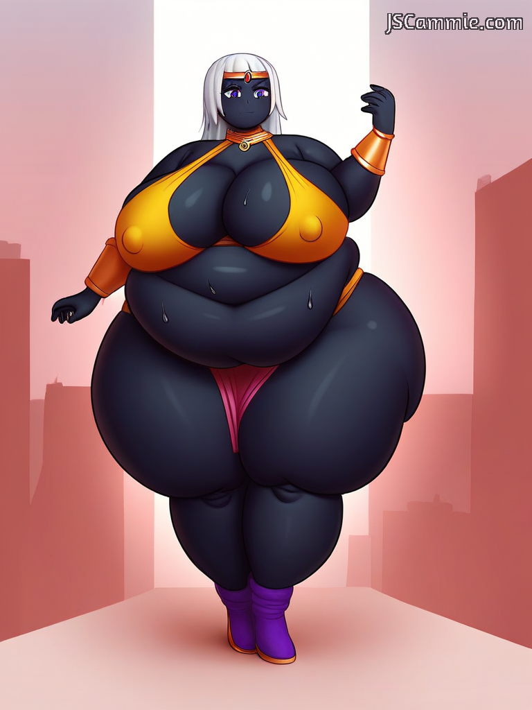 *Queen Tyr’ahenee (Duck Dodgers)* Prompt: masterpiece, best quality, amazing quality, best quality, amazing quality, queen tyr'ahnee, black body, black skin, white hair, purple eyes, no mouth, circlet, bracer, neck ring, yellow bra, gold belt, pelvic curtain, purple heels, ssbbw,ussbbw,blob, wide hips,bottom heavy, immobile, blob, fat (hyper fat), hyper belly, fat rolls, hyper blob, extremely obese, massive belly, Body inflation, giganticbody, body filled with air, dimensional gigantic belly, Mars (Duck Dodgers), sweat, Big breasts, Big ass, Big hips, Big belly, obese, fat, immobile, ssbbw, Patreon, fat arms, fat legs, fat chin, double chin, justfat, fatlegs, fatarms, buildblob, giant, cityblob, fatface, fatsea, fat blob, fat rolls, fat woman, fattest, solo, sweat, clothes start to strain, Wardobe malfunction, nipple outline, clothes about to burst, morbidly obese, sssbbw, ((Ssbbw)), Blob, ((blob)), no mouth, solo, Panet Mars (Background), one hand on stomach, Negative Prompt: nstw, bad quality, worst quality, worst detail, sketch, censor, nstw, bad quality, worst quality, worst detail, sketch, censor, worst quality, bad quality, low quality, lowres, scan artifacts, jpeg artifacts, sketch, (worst quality, bad quality:1.1), lowres, jpeg, artifacts, signature, username, text, logo, bad anatomy, artist name, artist logo, extra limbs, extra digit, extra legs, extra legs and arms, disfigured, missing arms, too many fingers, fused fingers, missing fingers, unclear eyes, blur, film grain, noise, large head, low quality, extra digits, bad face, bad eye, EasyNegativeV2, ng_deepnegative_v1_75t, lips, lipstick, giant, giantess, macro,