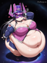 Jscammie is now pixforge.ai And here is Galacta (Marvel Rivals) Version… Prompt: masterpiece, best quality, amazing quality, galacta, purple headgear, purple dress, Long hair, straight black hair, a purple eye mask, and a long purple helmet. A one-piece fitted suit in dark purple and violet tones, paired with blue fingerless gloves and long sleeves. Silver rings around the wrists, a purple asymmetrical short skirt, an, belly blush, blushing, sweatdrop, big fat breasts, hyper butt, huge hips, huge thick fat legs, fat cheeks, (morbidly obese:1.4), (huge hyper overinflated puffed belly: 1.3), visible breath, panting, smug, from above, deep navel, rolls of fat, sweaty, (fat double chin:1.2), belly squish, thick fat arms, standing up, hearts, mischievous, scratching head, space background, Anime screencap, anime coloring, simple shading, vibrant colors, ((1 girl, solo female)), giant girl, POV from below, looking down at viewer, marvel rivals, detailed eyes Negative Prompt: bad quality, worst quality, worst detail, sketch, censored, artist name, signature, watermark, realistic, 3d, angry, six arms, eight arms, extra fingers, fewer fingers, six hands, five arms, seven arms, three arms, shota, torn clothes,