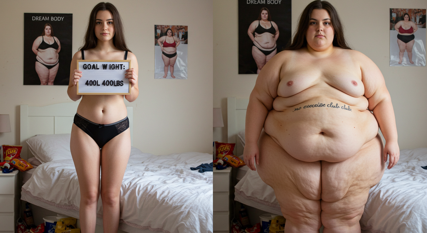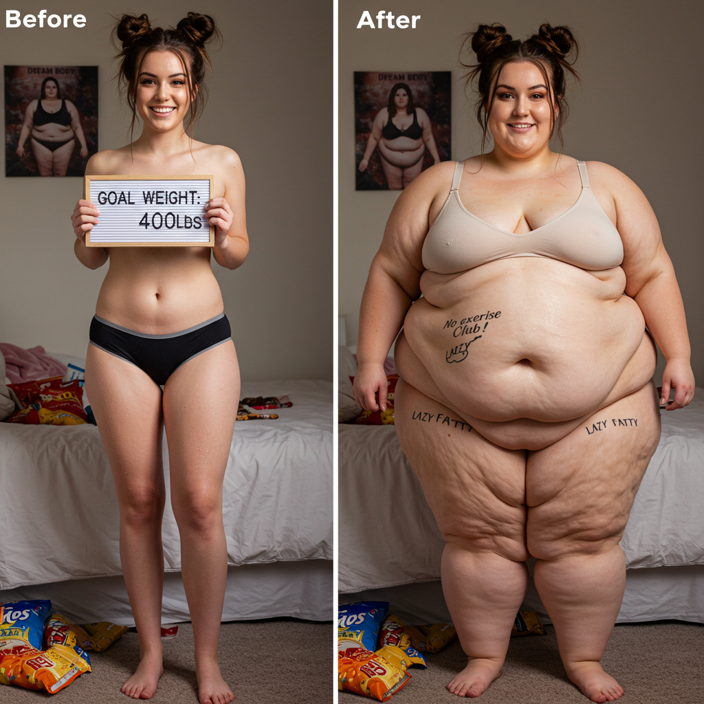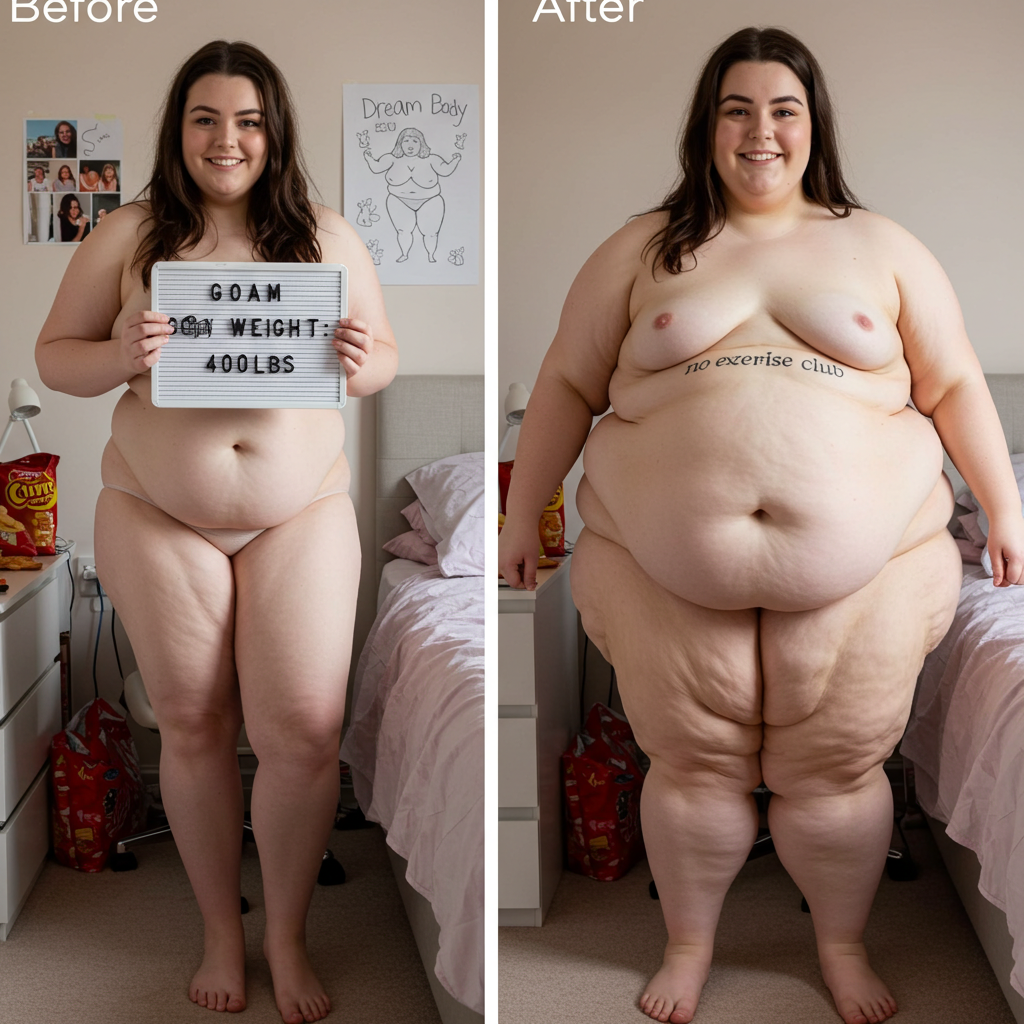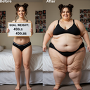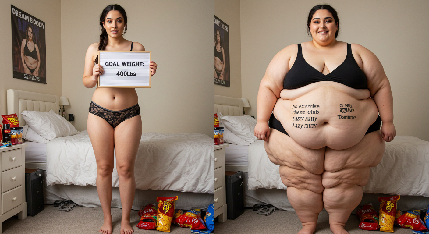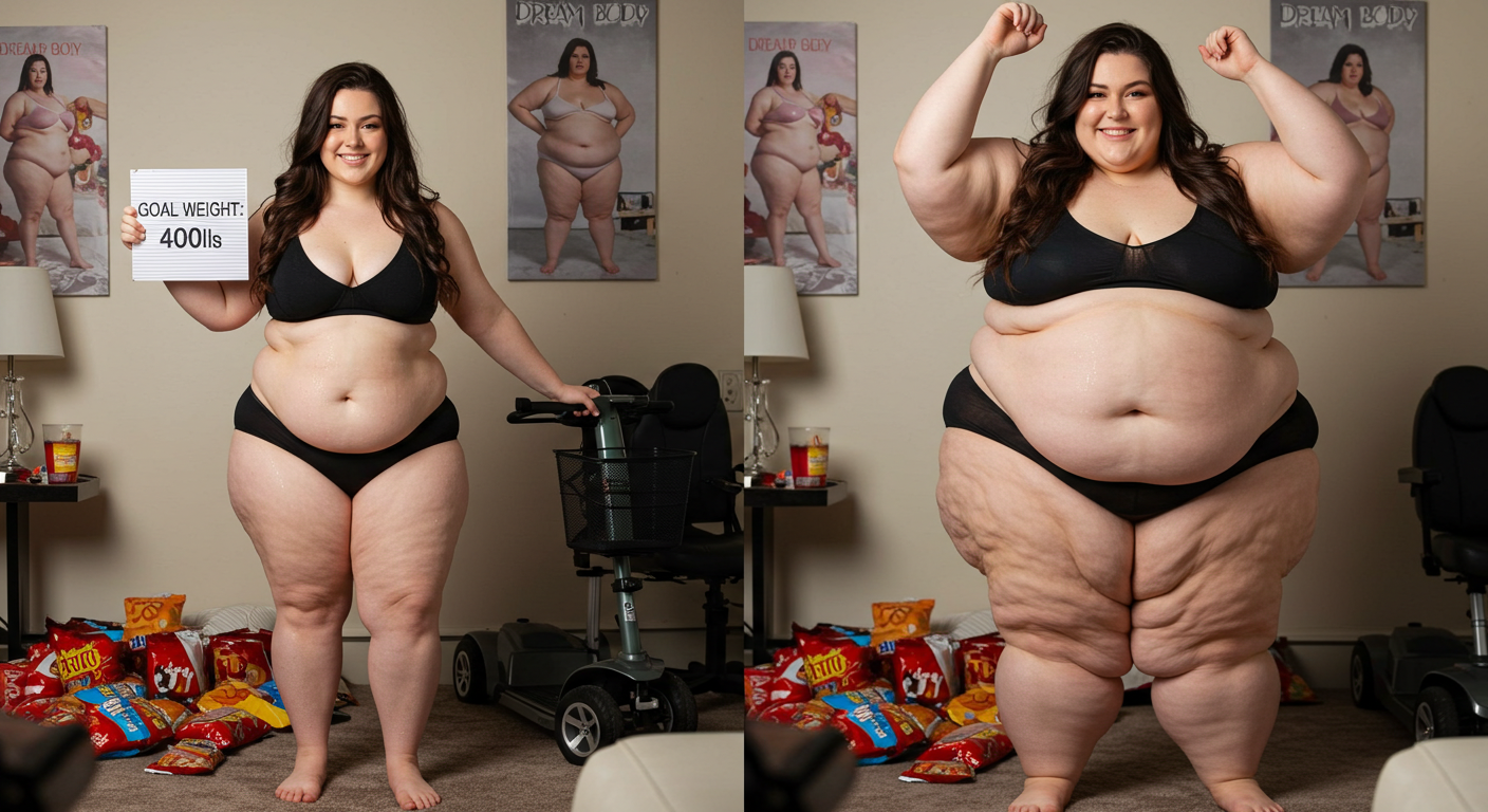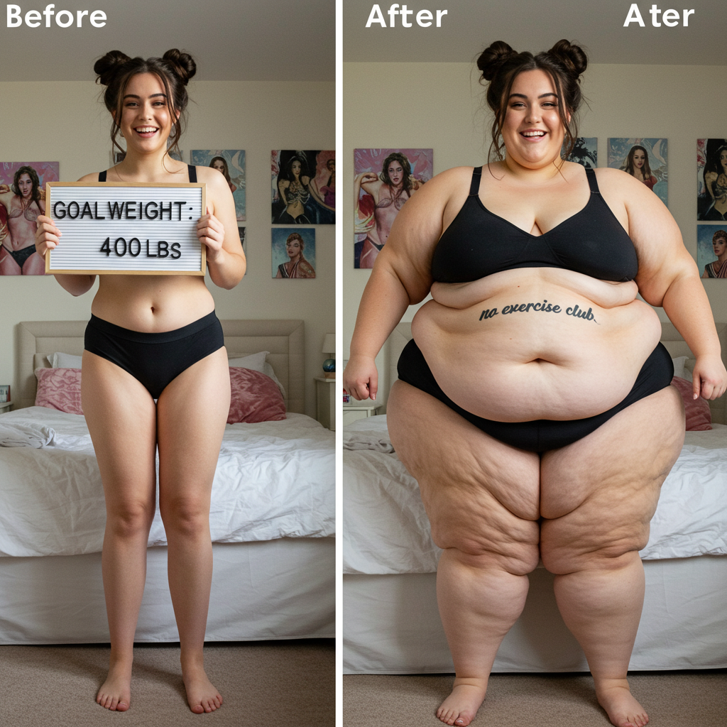 in the during picture her body got obese, held a tiny white marker board with the written sentence "DAYS LEFT: 150" with food doodles. in the after picture, she is well over 1000 lbs and monstruously obese, particular emphasis on how obese she is, monstrously blob knees, stretchy obese wide navel and obese groin hanging out, monstrously blubbery round face, monstrously obese humongous waist, she has obese pillowy arms and fat rolls on her upper arms. humongous knees, blushed cheeks, cute smile. festive numbers balloons "400lb",