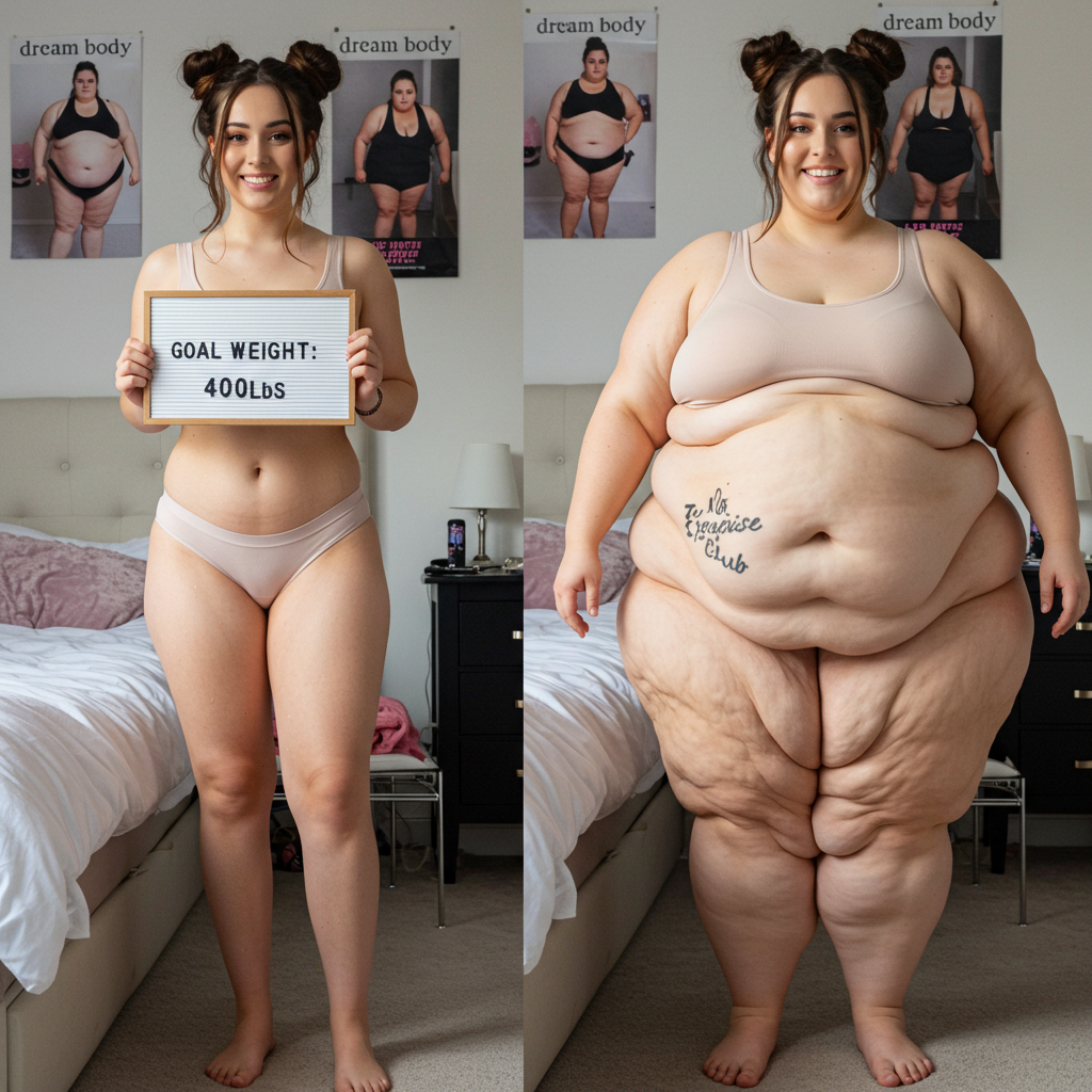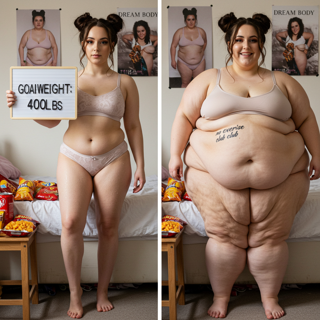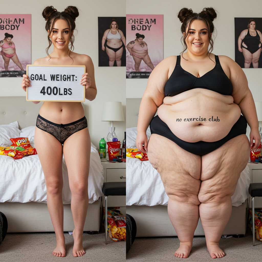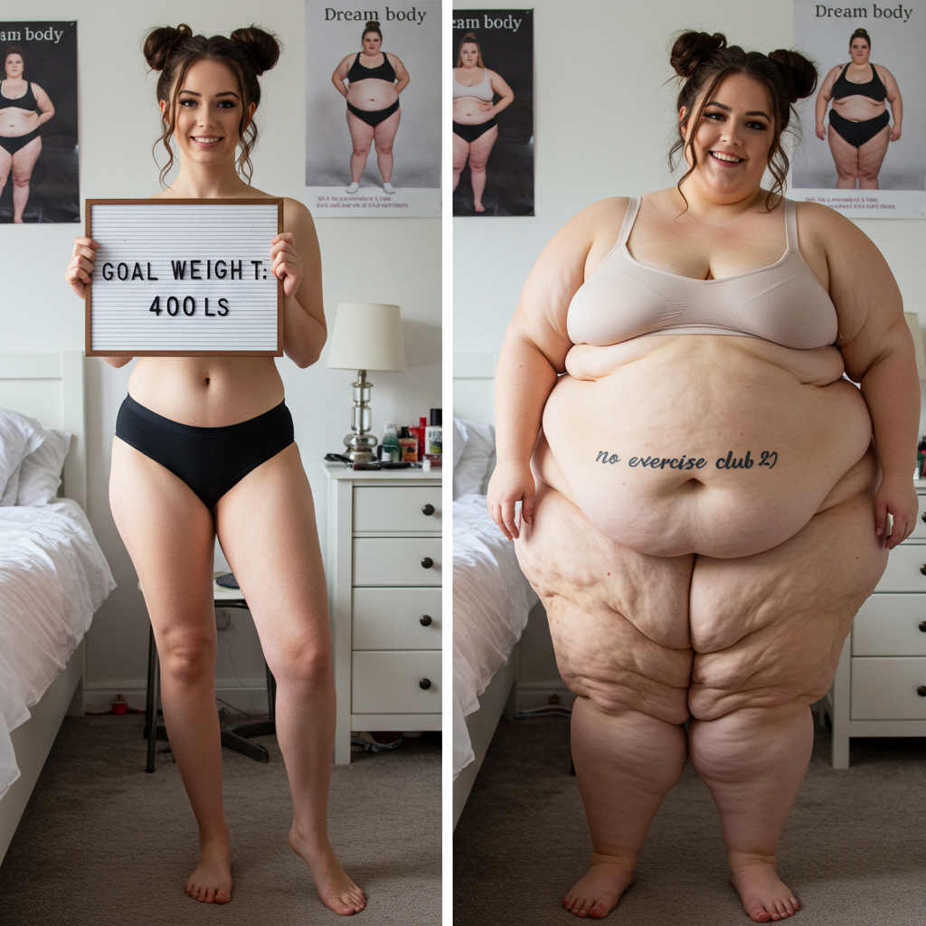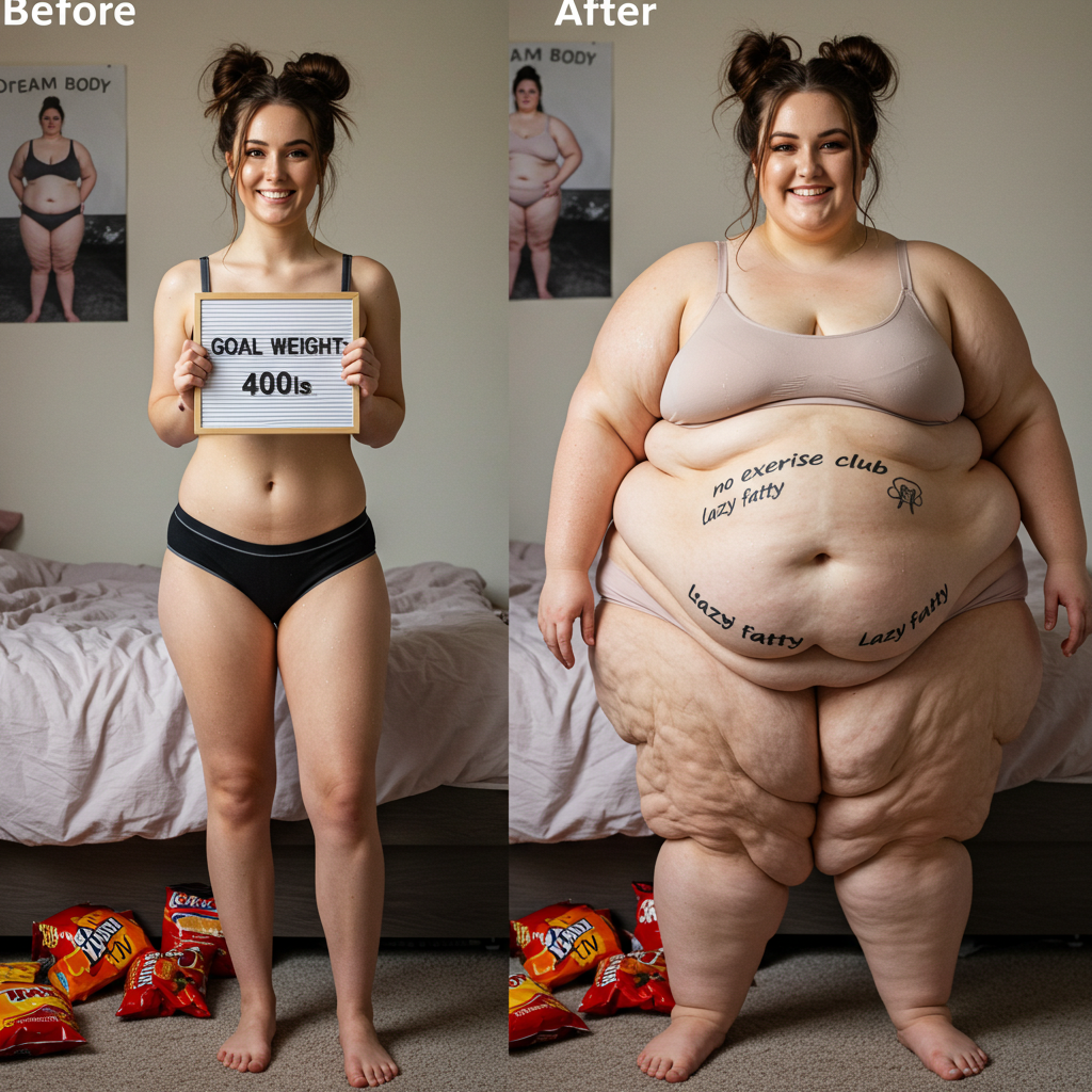 in the during picture her body got obese, held a tiny white marker board with the written sentence "DAYS LEFT: 150" with food doodles. in the after picture, she is well over 1000 lbs and monstruously obese, particular emphasis on how obese she is, monstrously blob knees, stretchy obese wide navel and obese groin hanging out, monstrously blubbery round face, monstrously obese humongous waist, she has obese pillowy arms and fat rolls on her upper arms. humongous knees, blushed cheeks, cute smile. festive numbers balloons "400lb",