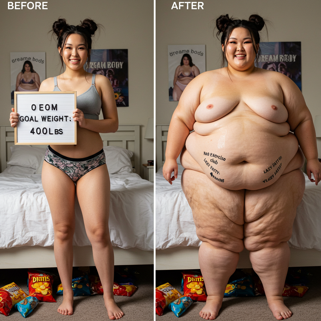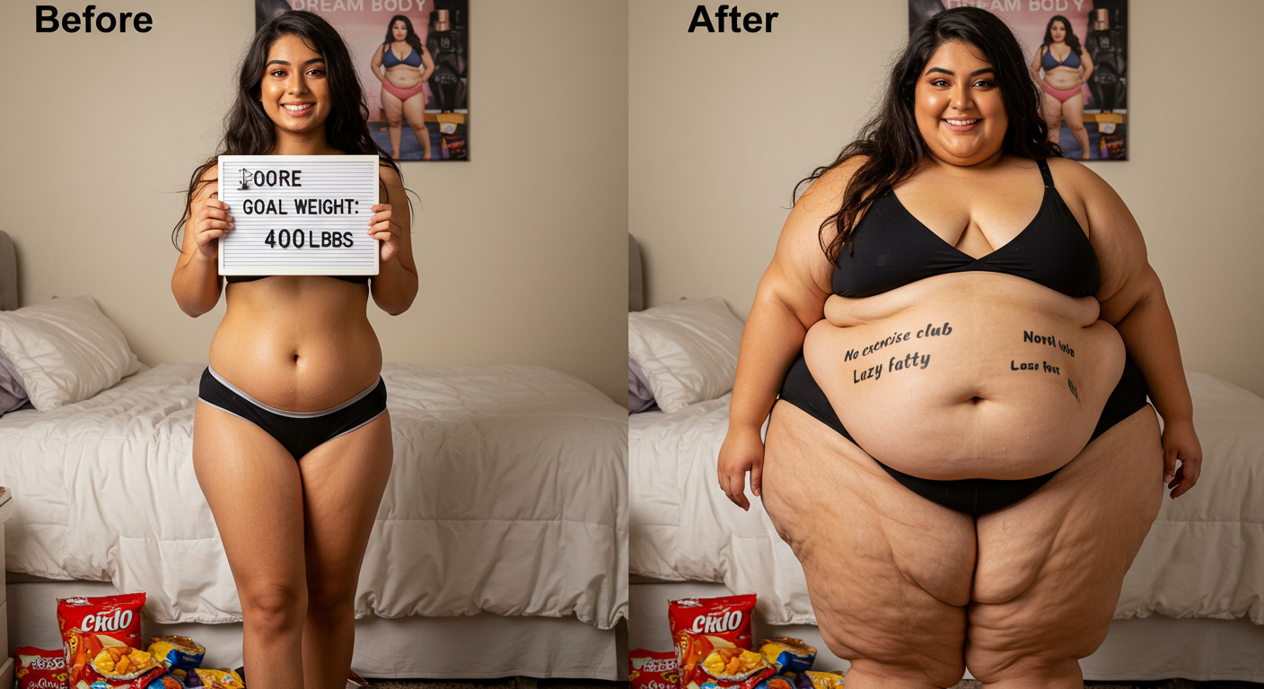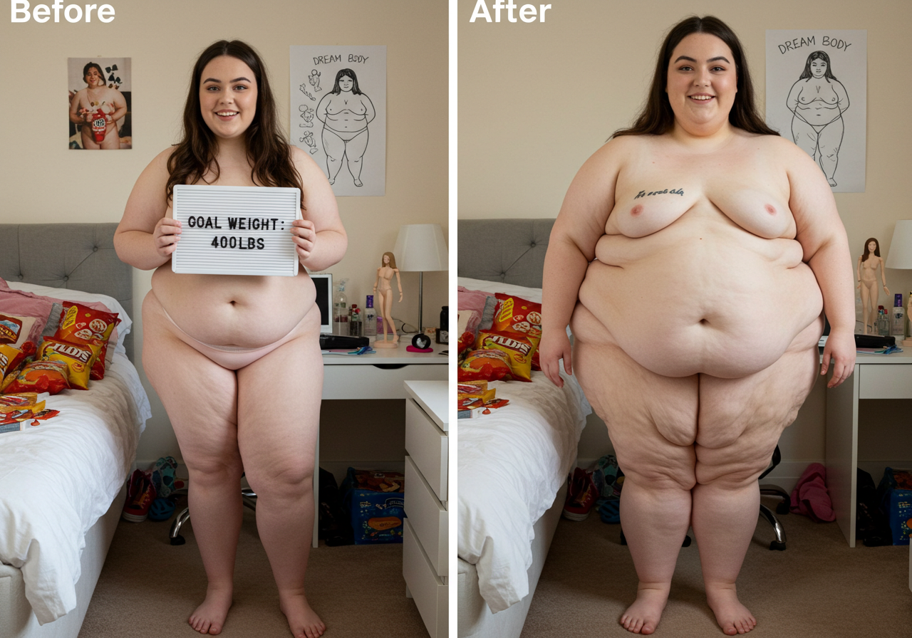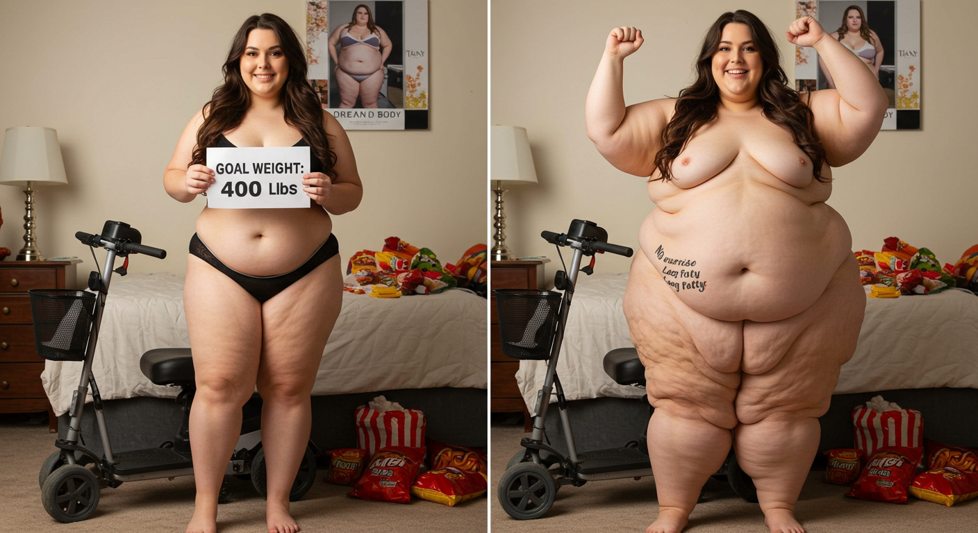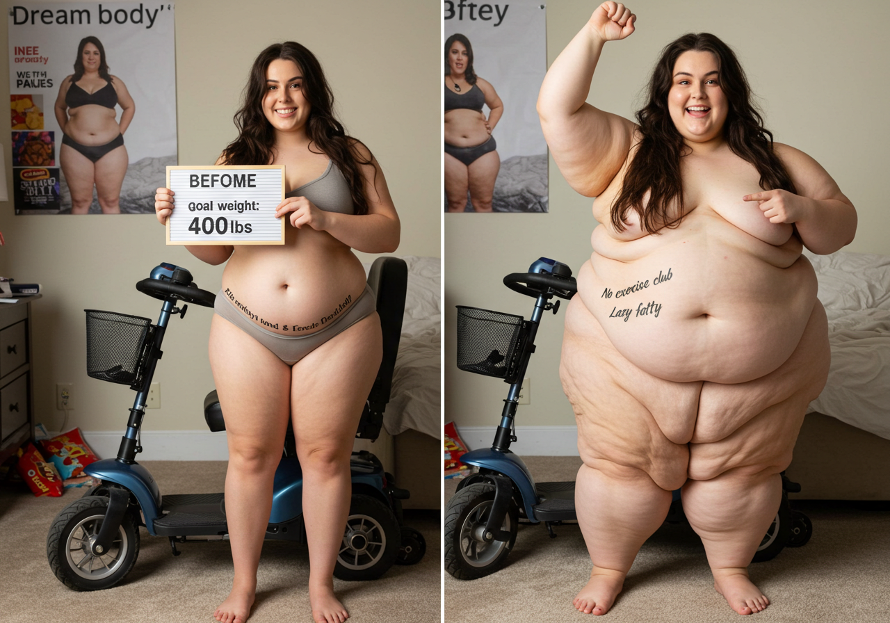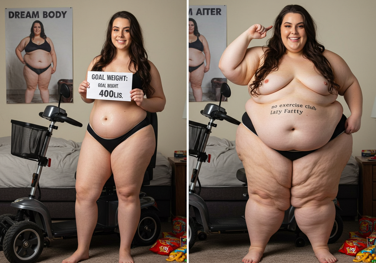 in the during picture her body got obese, held a tiny white marker board with the written sentence "DAYS LEFT: 150" with food doodles. in the after picture, she is well over 1000 lbs and monstruously obese, particular emphasis on how obese she is, monstrously blob knees, stretchy obese wide navel and obese groin hanging out, monstrously blubbery round face, monstrously obese humongous waist, she has obese pillowy arms and fat rolls on her upper arms. humongous knees, blushed cheeks, cute smile. festive numbers balloons "400lb",