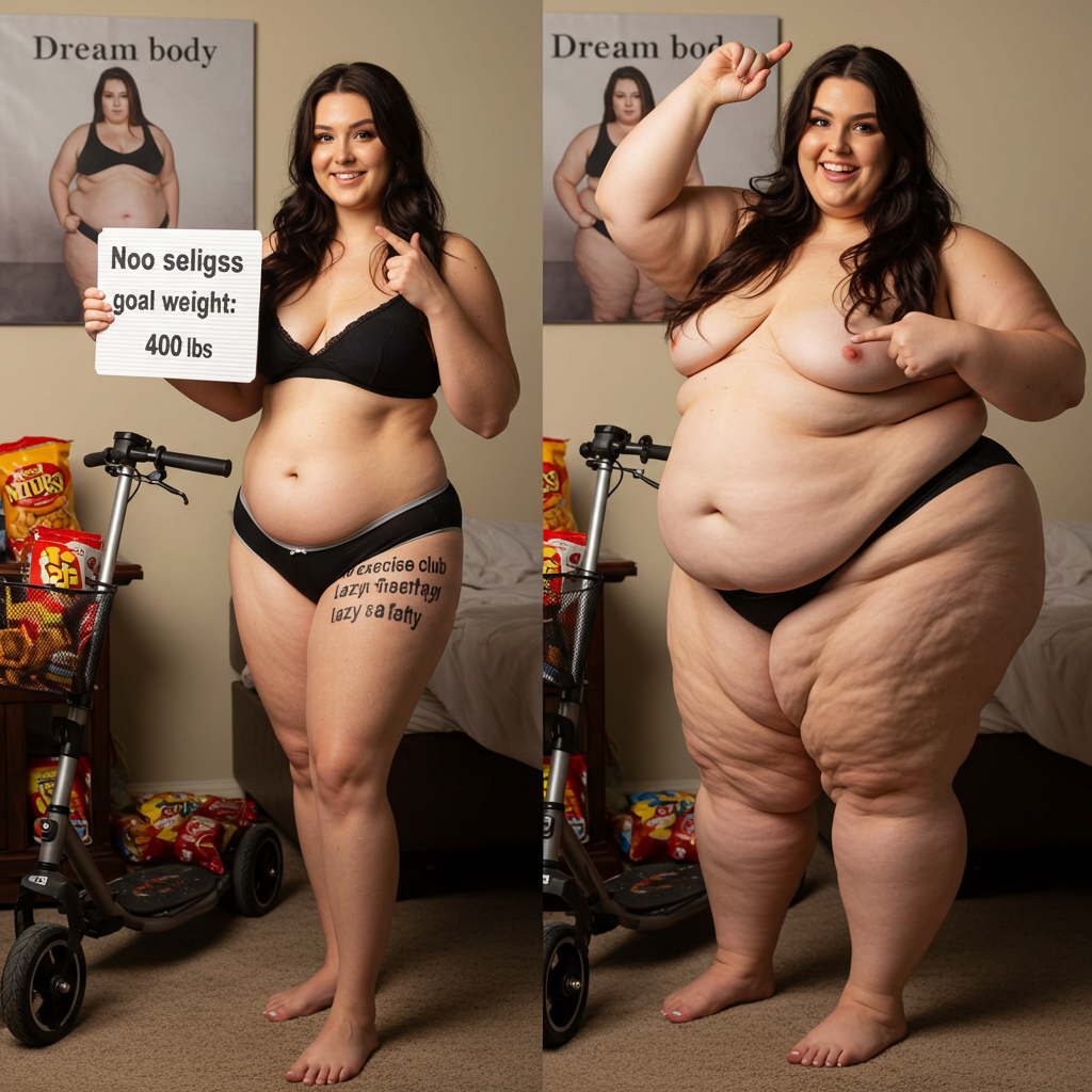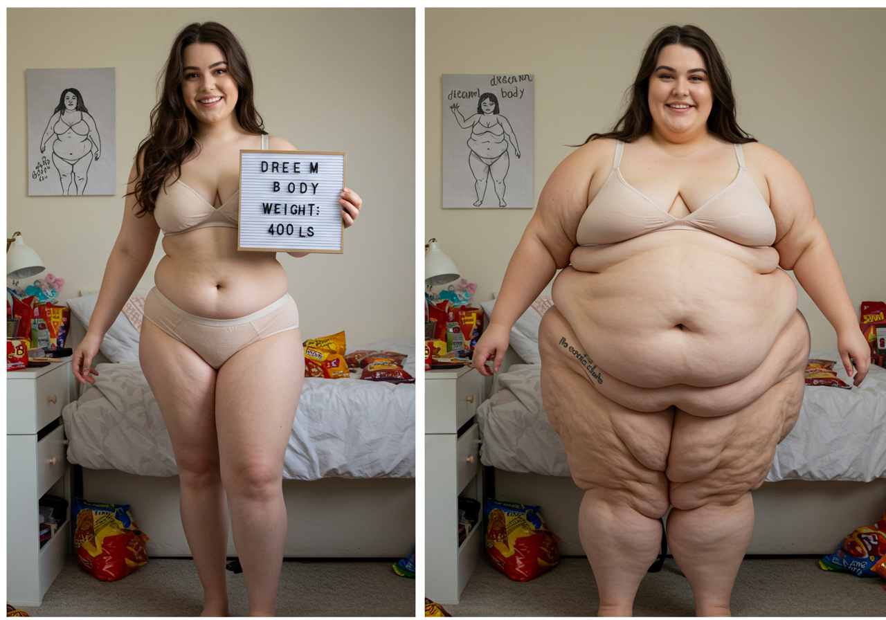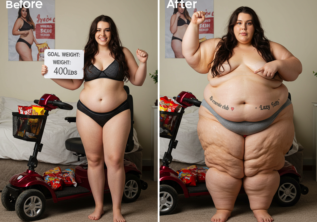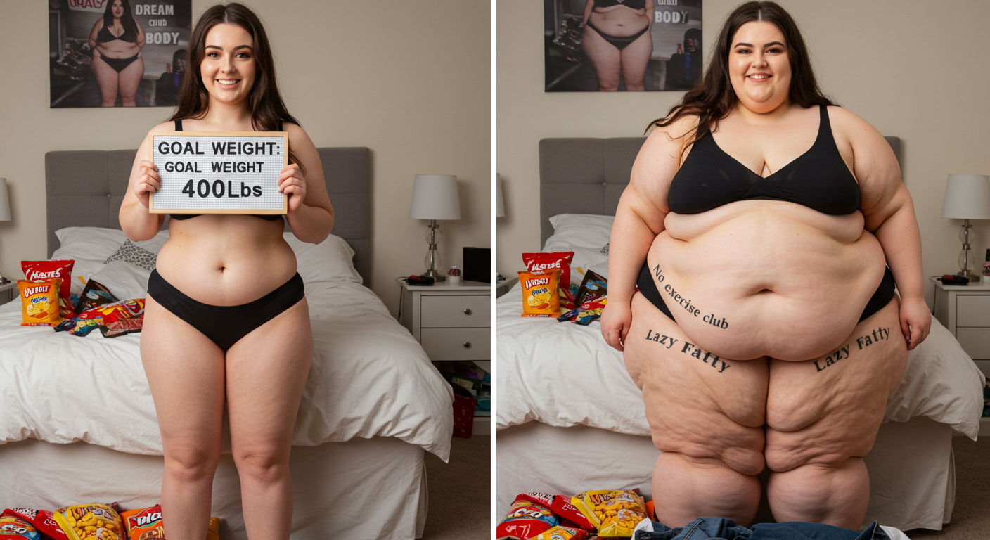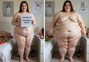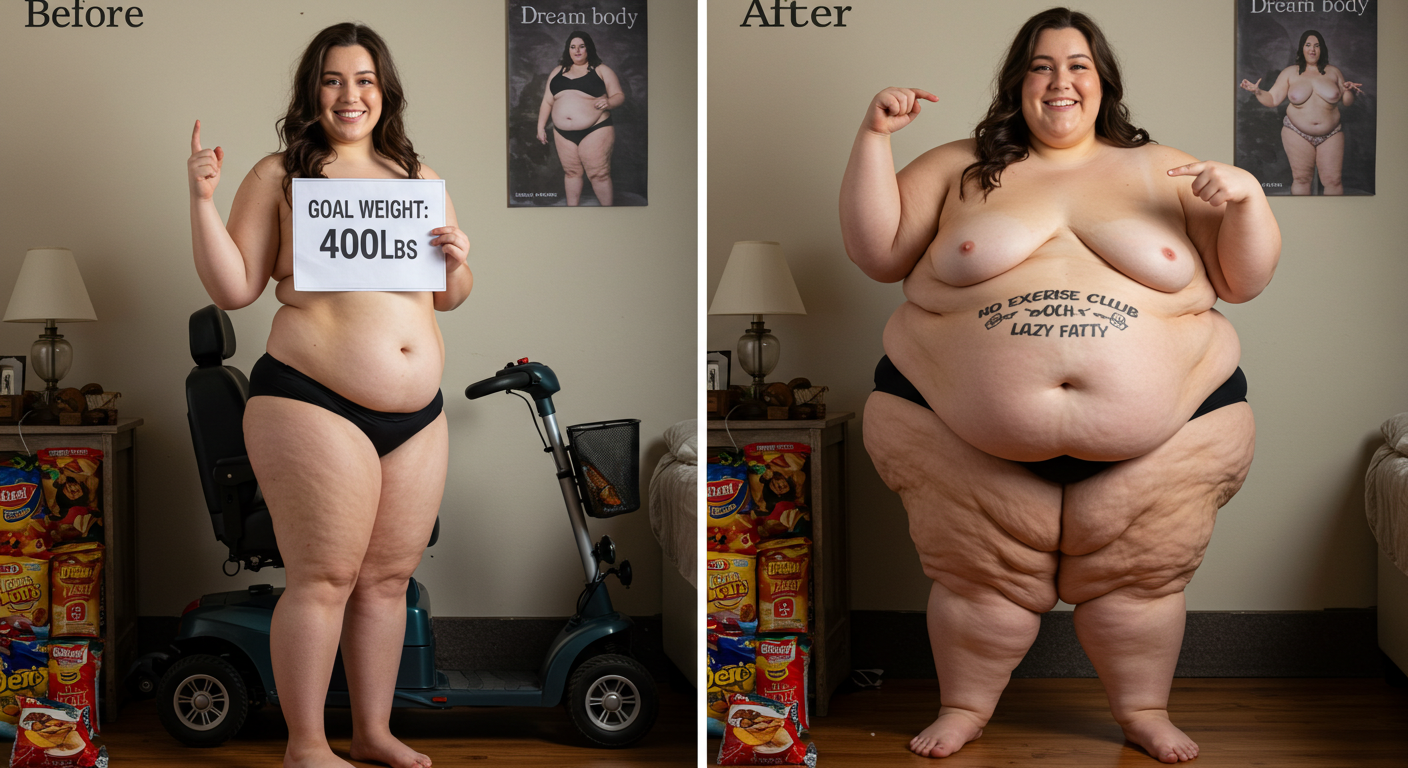 in the during picture her body got obese, held a tiny white marker board with the written sentence "DAYS LEFT: 150" with food doodles. in the after picture, she is well over 1000 lbs and monstruously obese, particular emphasis on how obese she is, monstrously blob knees, stretchy obese wide navel and obese groin hanging out, monstrously blubbery round face, monstrously obese humongous waist, she has obese pillowy arms and fat rolls on her upper arms. humongous knees, blushed cheeks, cute smile. festive numbers balloons "400lb",