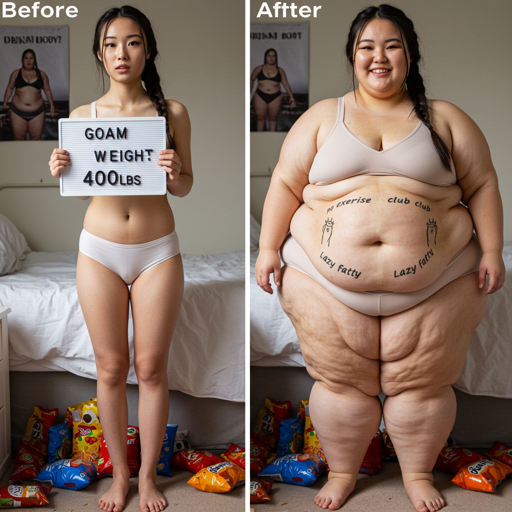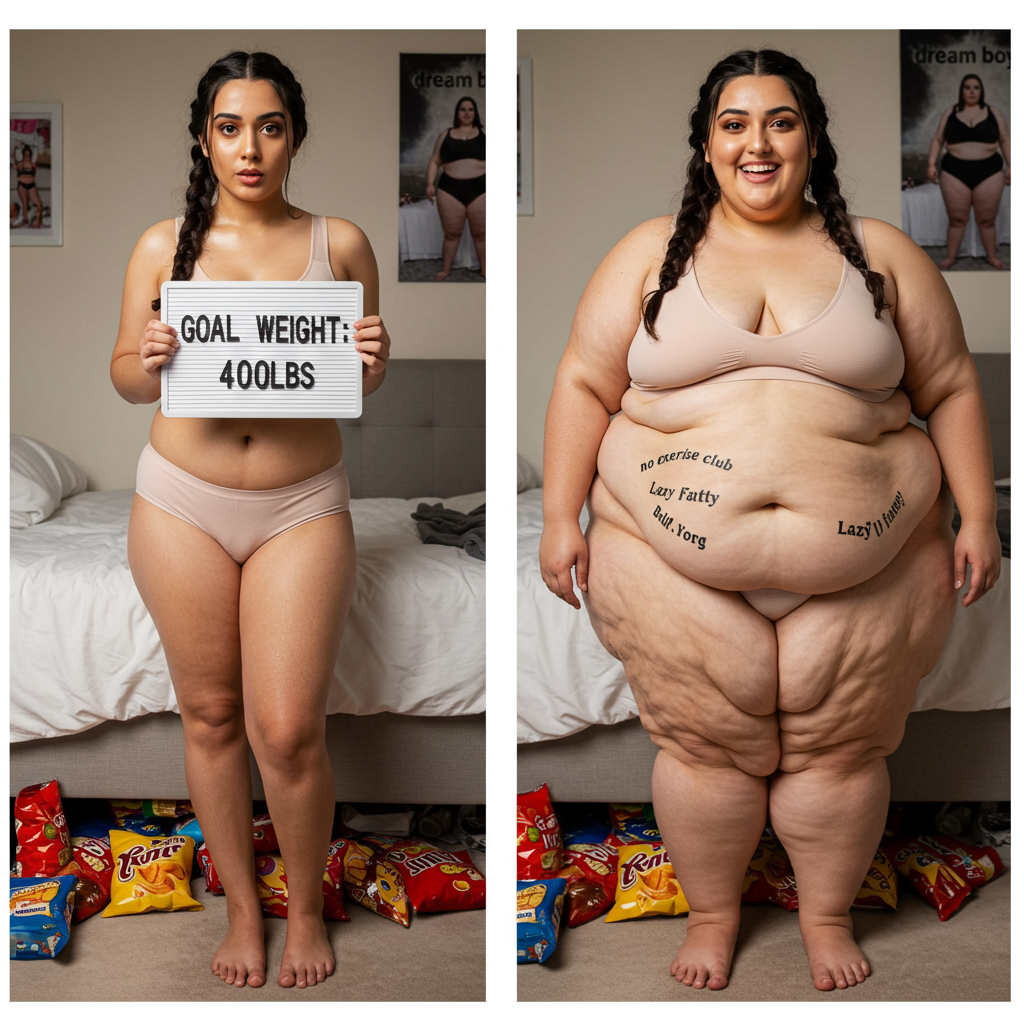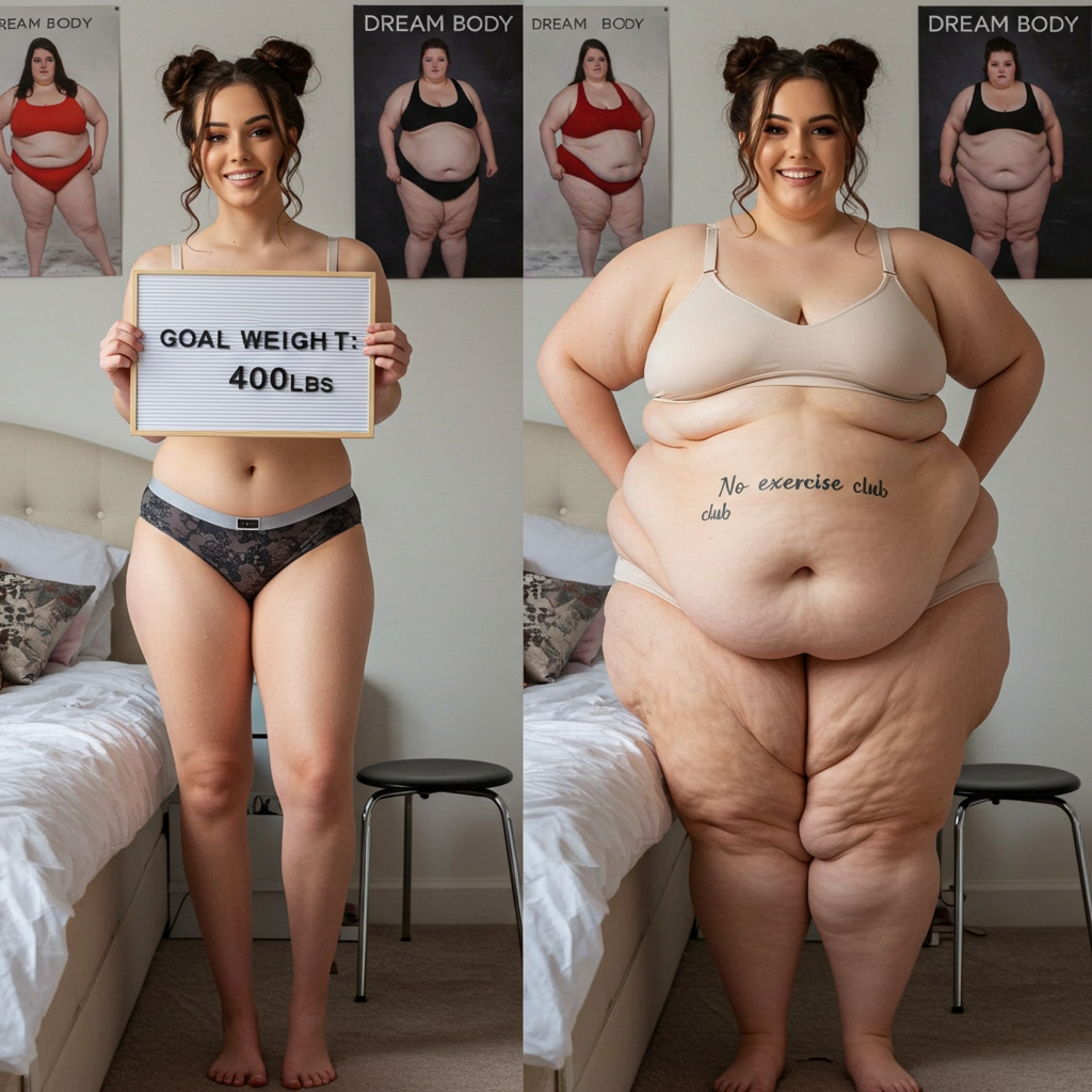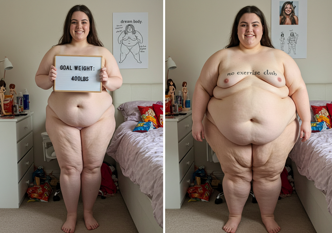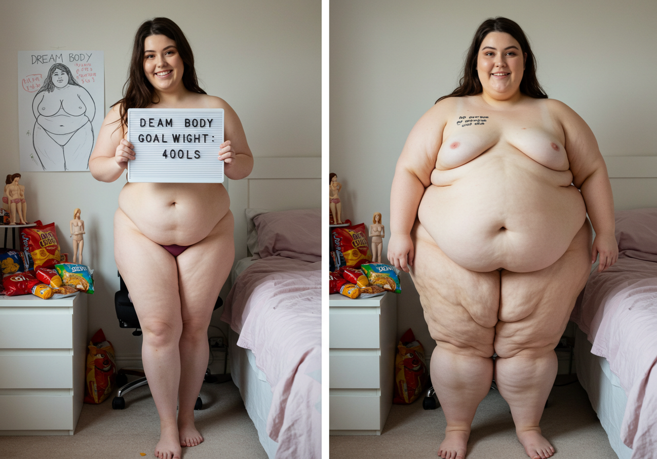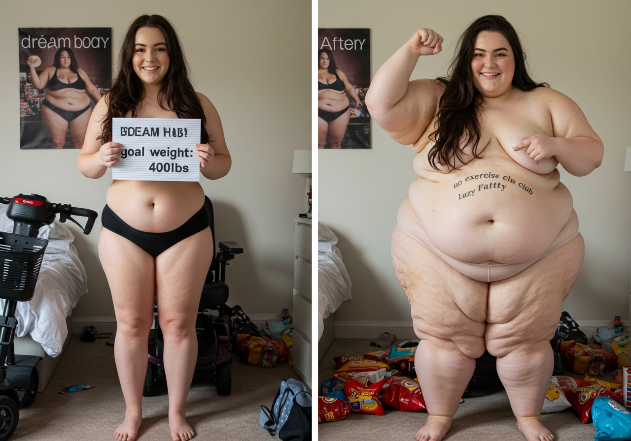 in the during picture her body got obese, held a tiny white marker board with the written sentence "DAYS LEFT: 150" with food doodles. in the after picture, she is well over 1000 lbs and monstruously obese, particular emphasis on how obese she is, monstrously blob knees, stretchy obese wide navel and obese groin hanging out, monstrously blubbery round face, monstrously obese humongous waist, she has obese pillowy arms and fat rolls on her upper arms. humongous knees, blushed cheeks, cute smile. festive numbers balloons "400lb",