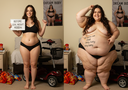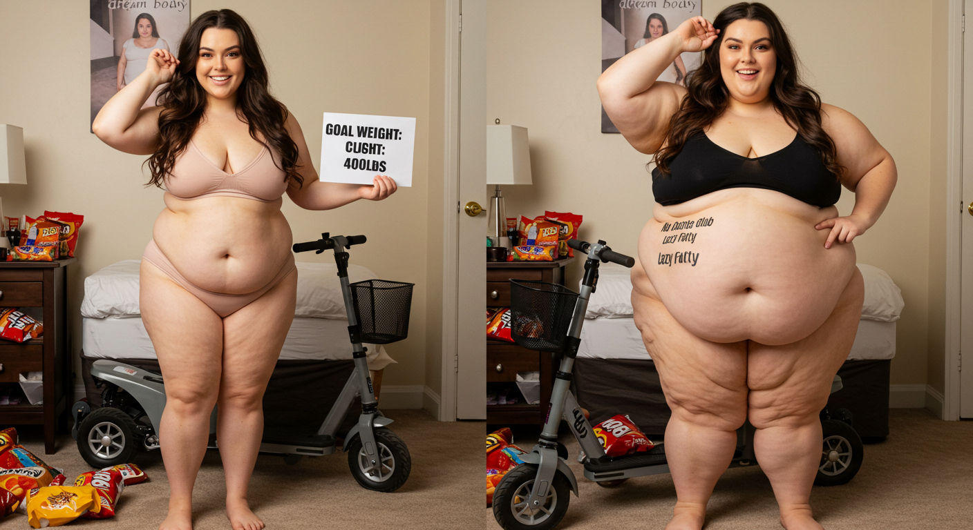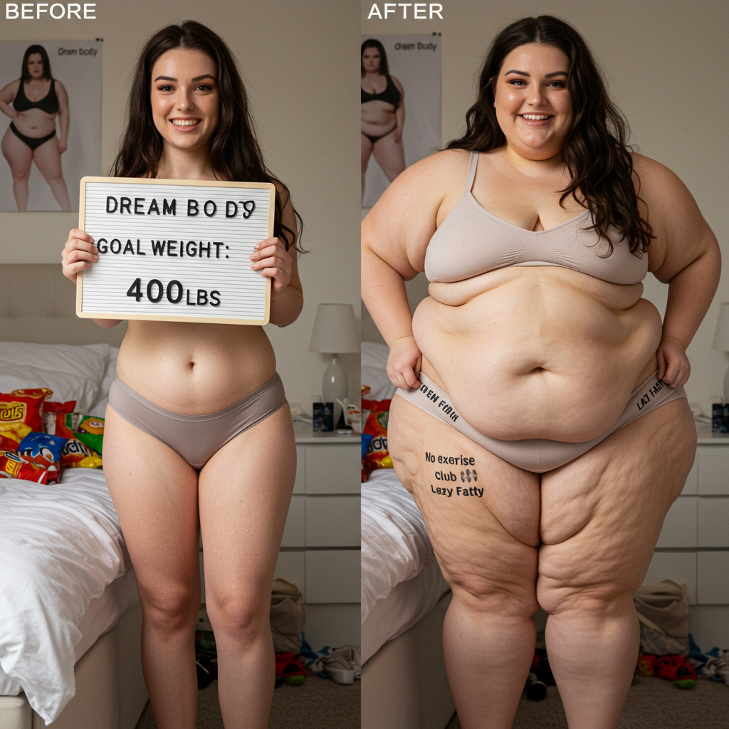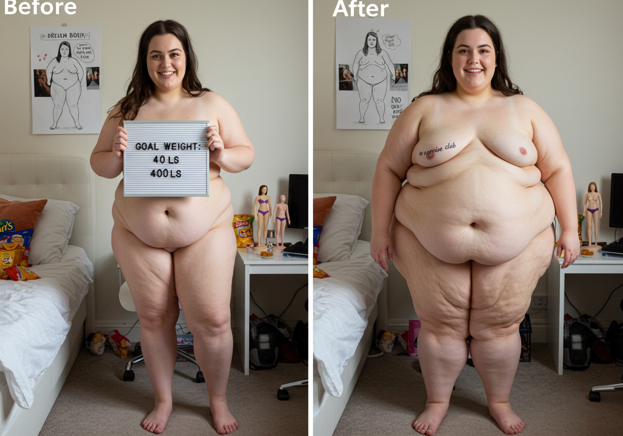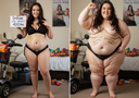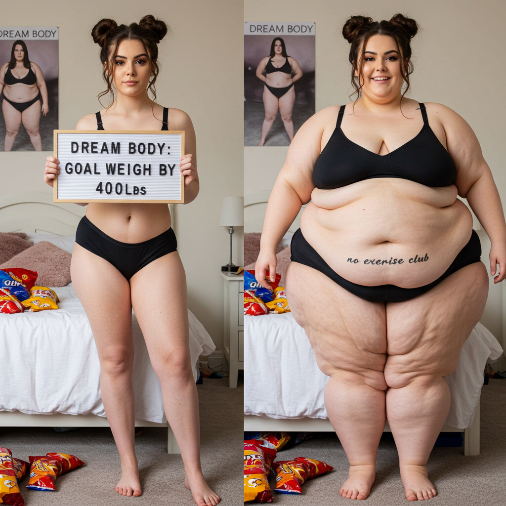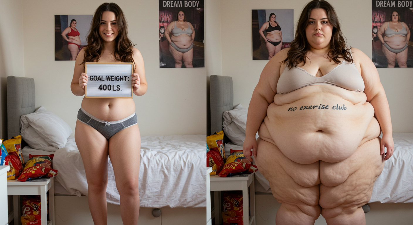 in the during picture her body got obese, held a tiny white marker board with the written sentence "DAYS LEFT: 150" with food doodles. in the after picture, she is well over 1000 lbs and monstruously obese, particular emphasis on how obese she is, monstrously blob knees, stretchy obese wide navel and obese groin hanging out, monstrously blubbery round face, monstrously obese humongous waist, she has obese pillowy arms and fat rolls on her upper arms. humongous knees, blushed cheeks, cute smile. festive numbers balloons "400lb",