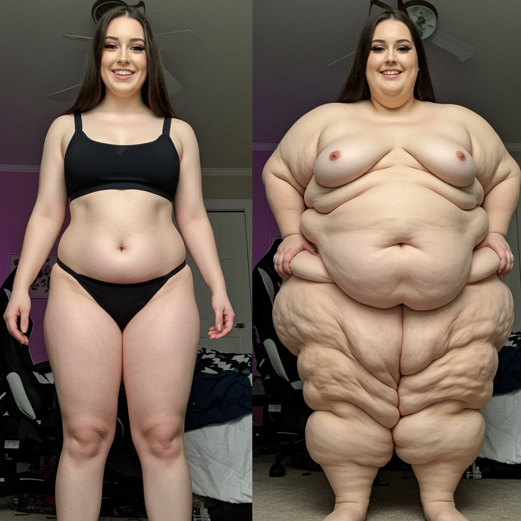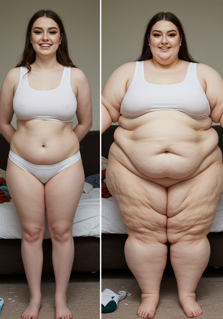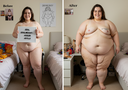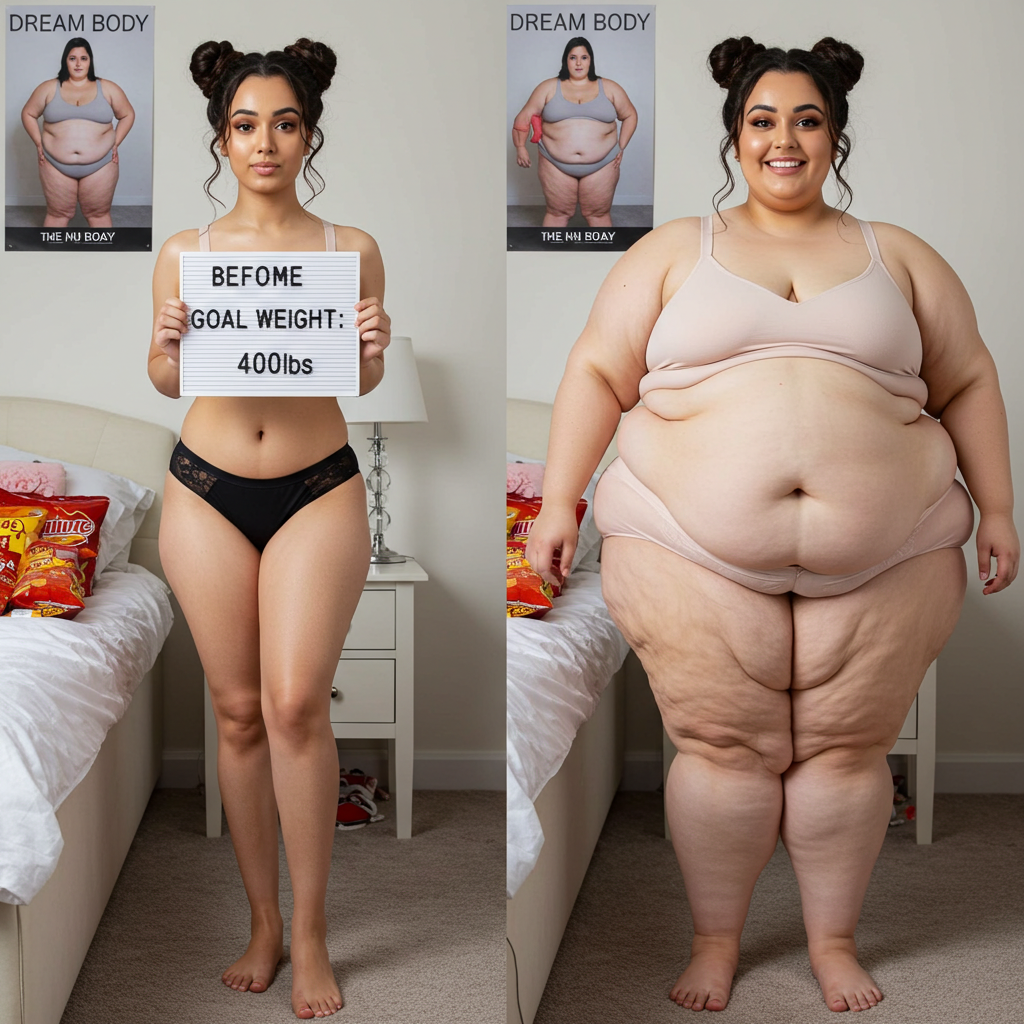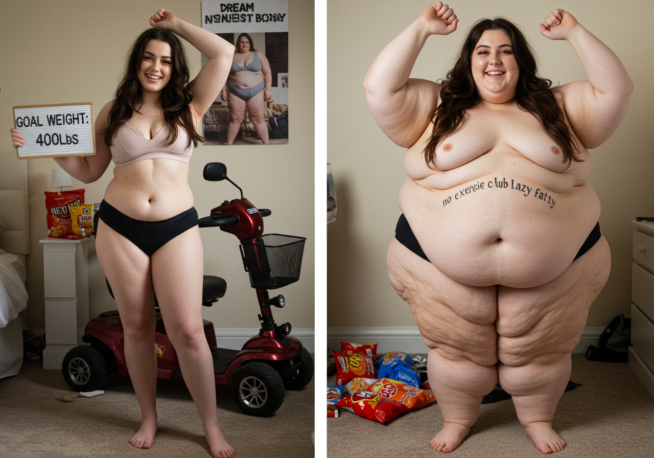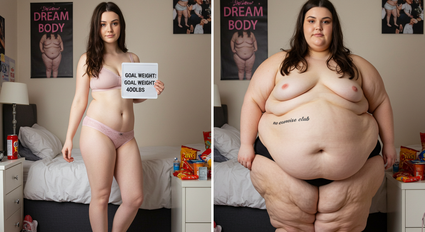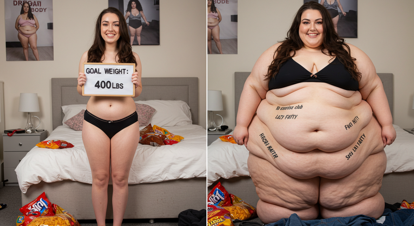 in the during picture her body got obese, held a tiny white marker board with the written sentence "DAYS LEFT: 150" with food doodles. in the after picture, she is well over 1000 lbs and monstruously obese, particular emphasis on how obese she is, monstrously blob knees, stretchy obese wide navel and obese groin hanging out, monstrously blubbery round face, monstrously obese humongous waist, she has obese pillowy arms and fat rolls on her upper arms. humongous knees, blushed cheeks, cute smile. festive numbers balloons "400lb",