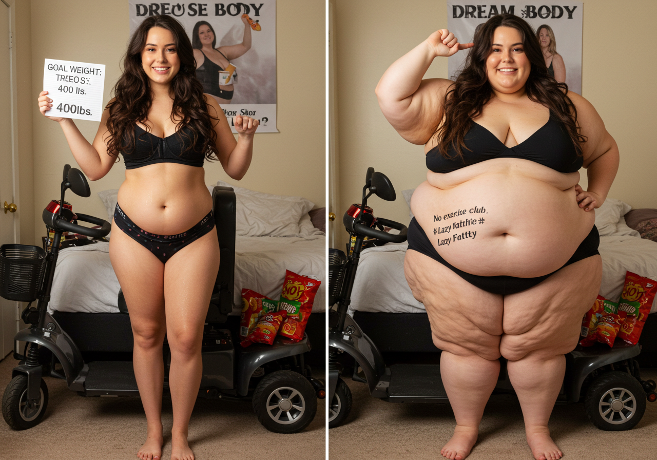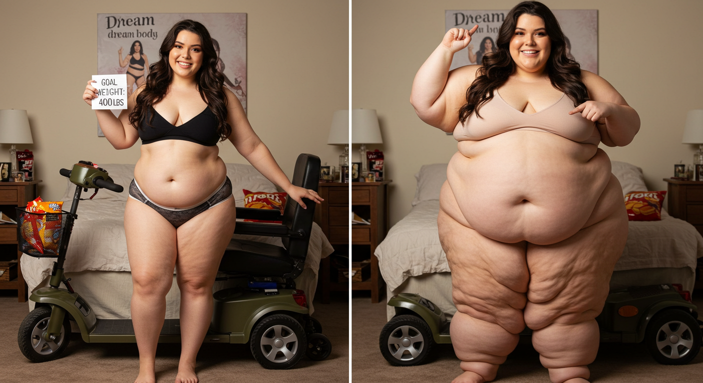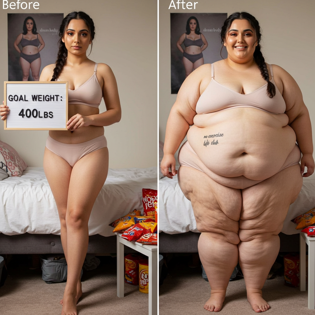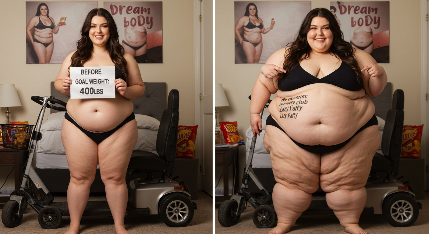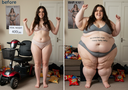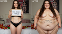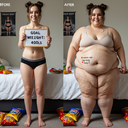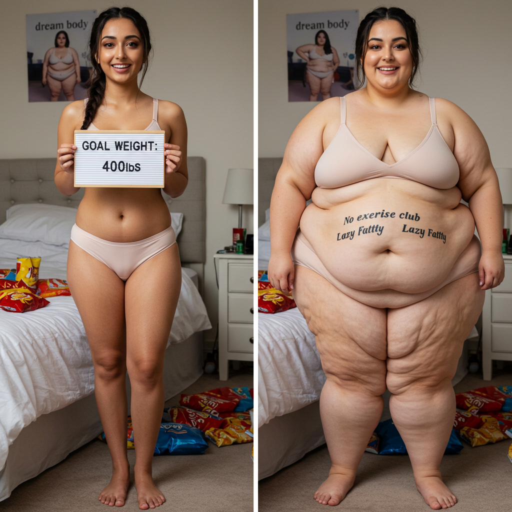in the during picture her body got obese, held a tiny white marker board with the written sentence "DAYS LEFT: 150" with food doodles. in the after picture, she is well over 1000 lbs and monstruously obese, particular emphasis on how obese she is, monstrously blob knees, stretchy obese wide navel and obese groin hanging out, monstrously blubbery round face, monstrously obese humongous waist, she has obese pillowy arms and fat rolls on her upper arms. humongous knees, blushed cheeks, cute smile. festive numbers balloons "400lb",