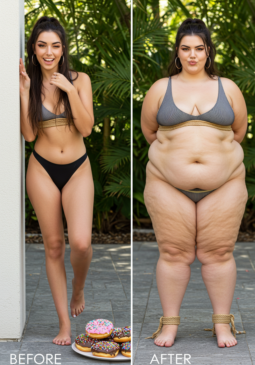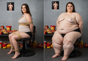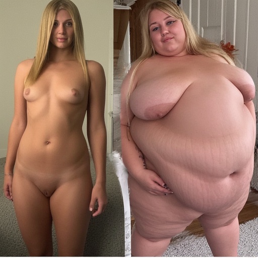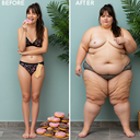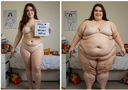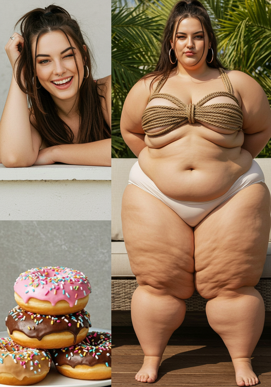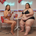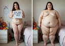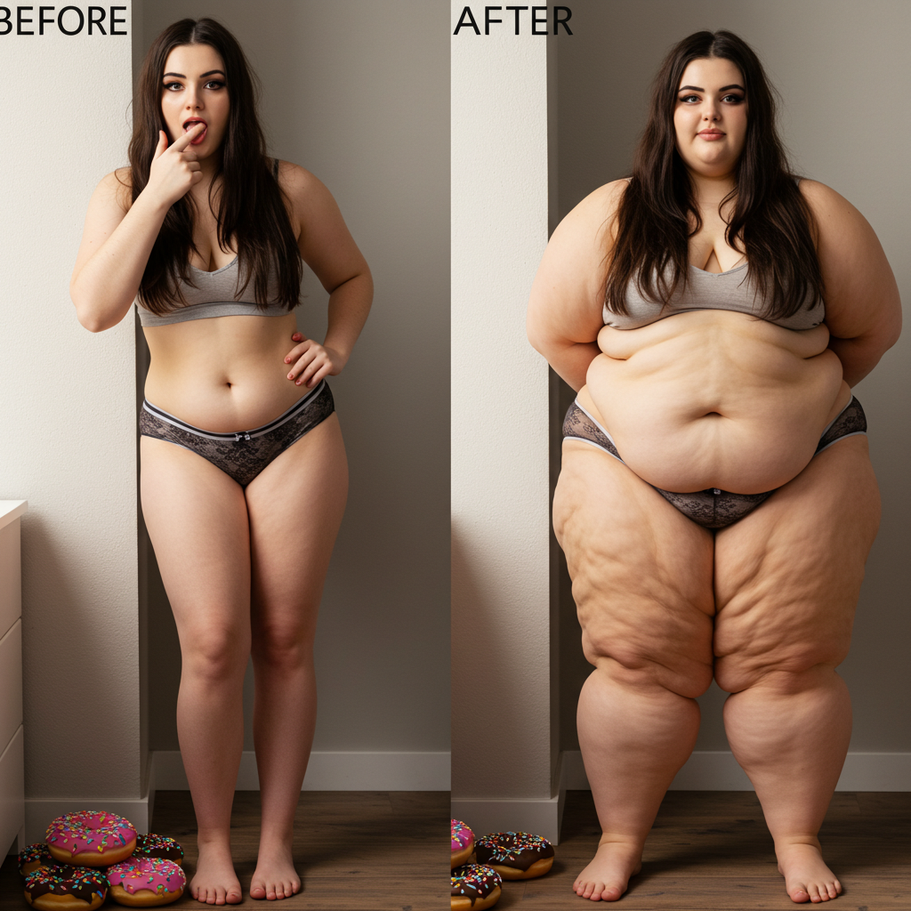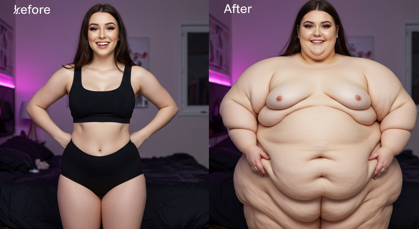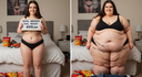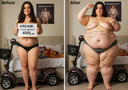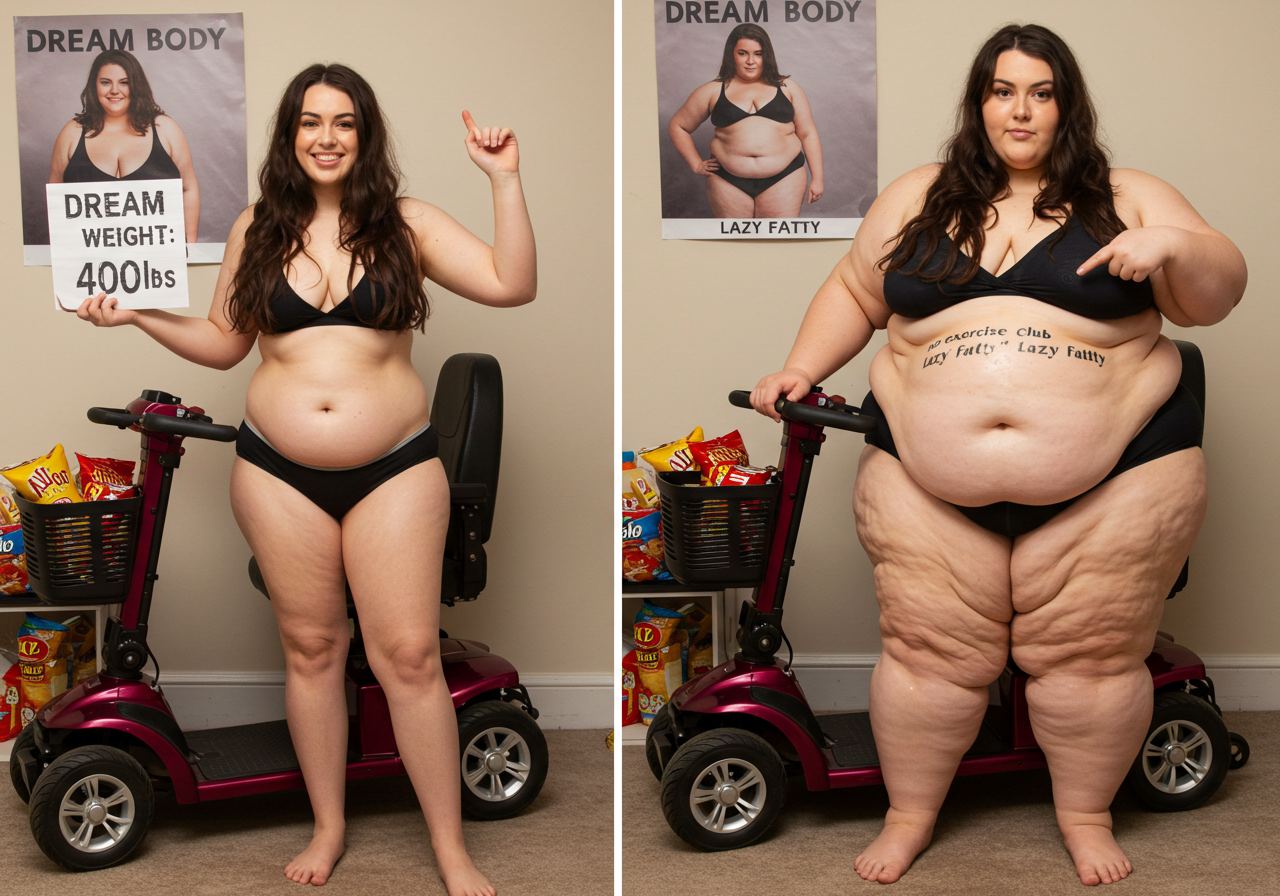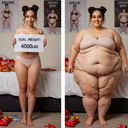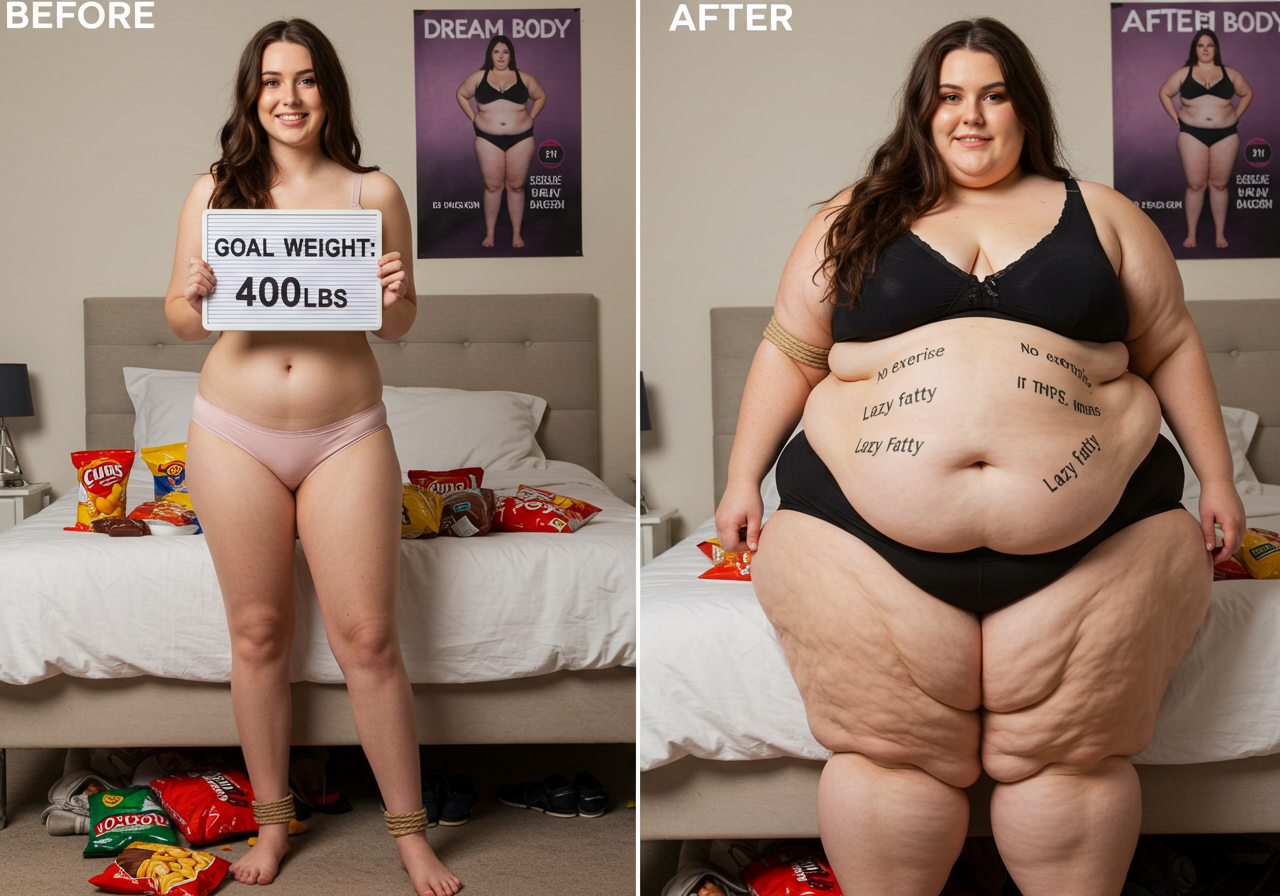 in the during picture her body got obese, held a tiny white marker board with the written sentence "DAYS LEFT: 150" with food doodles. in the after picture, she is well over 1000 lbs and monstruously obese, particular emphasis on how obese she is, monstrously blob knees, stretchy obese wide navel and obese groin hanging out, monstrously blubbery round face, monstrously obese humongous waist, she has obese pillowy arms and fat rolls on her upper arms. humongous knees, blushed cheeks, cute smile. festive numbers balloons "400lb",