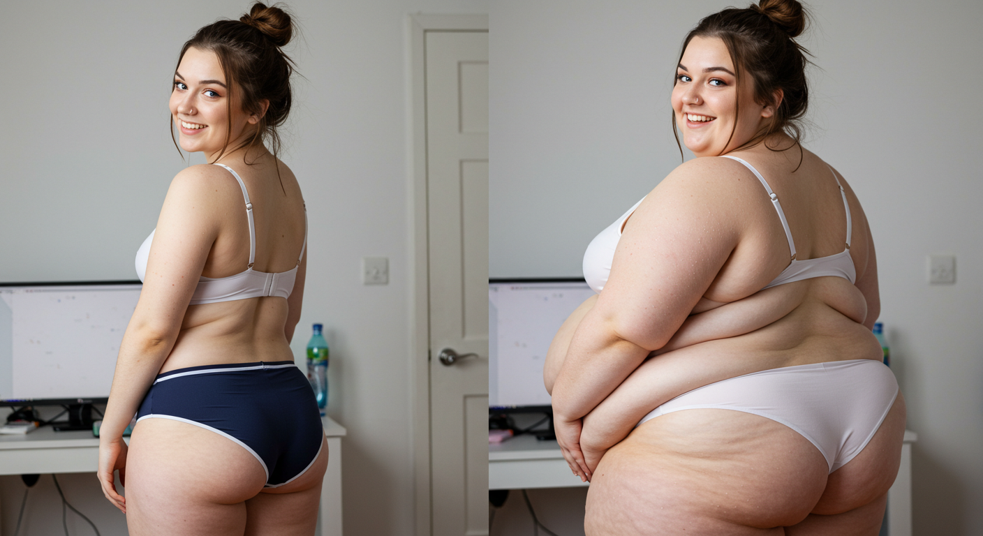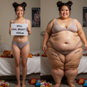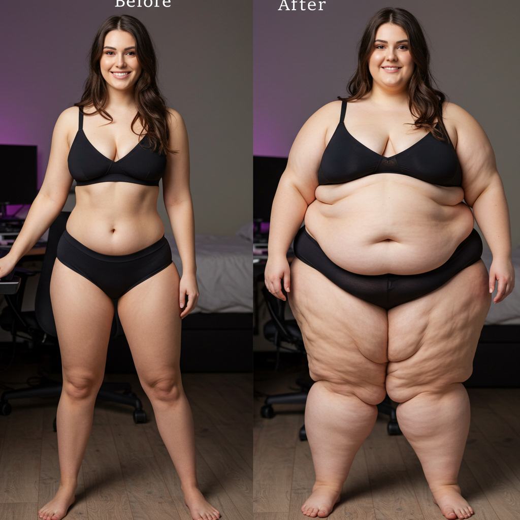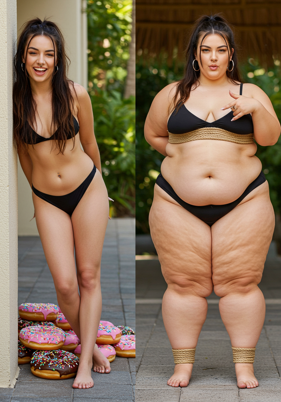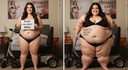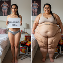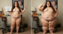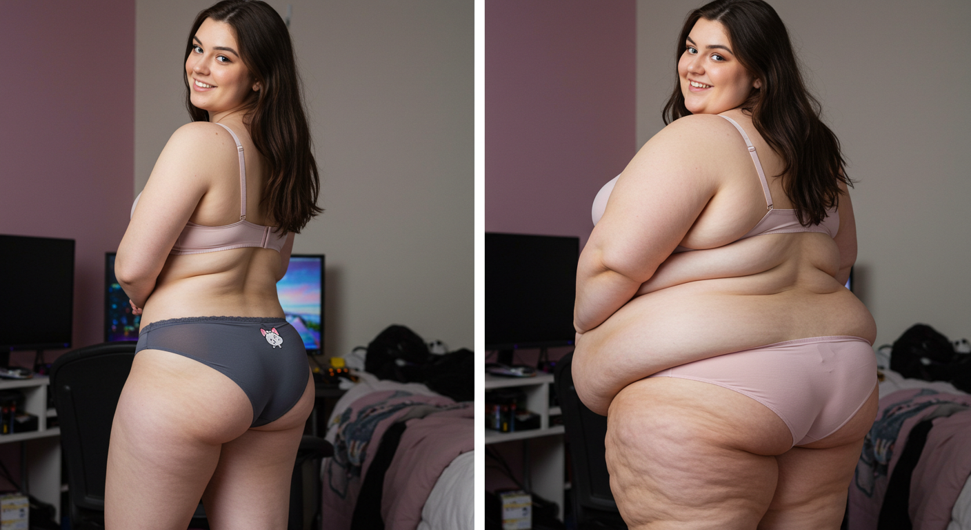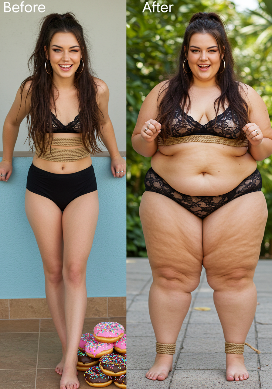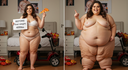 in the during picture her body got obese, held a tiny white marker board with the written sentence "DAYS LEFT: 150" with food doodles. in the after picture, she is well over 1000 lbs and monstruously obese, particular emphasis on how obese she is, monstrously blob knees, stretchy obese wide navel and obese groin hanging out, monstrously blubbery round face, monstrously obese humongous waist, she has obese pillowy arms and fat rolls on her upper arms. humongous knees, blushed cheeks, cute smile. festive numbers balloons "400lb",