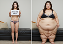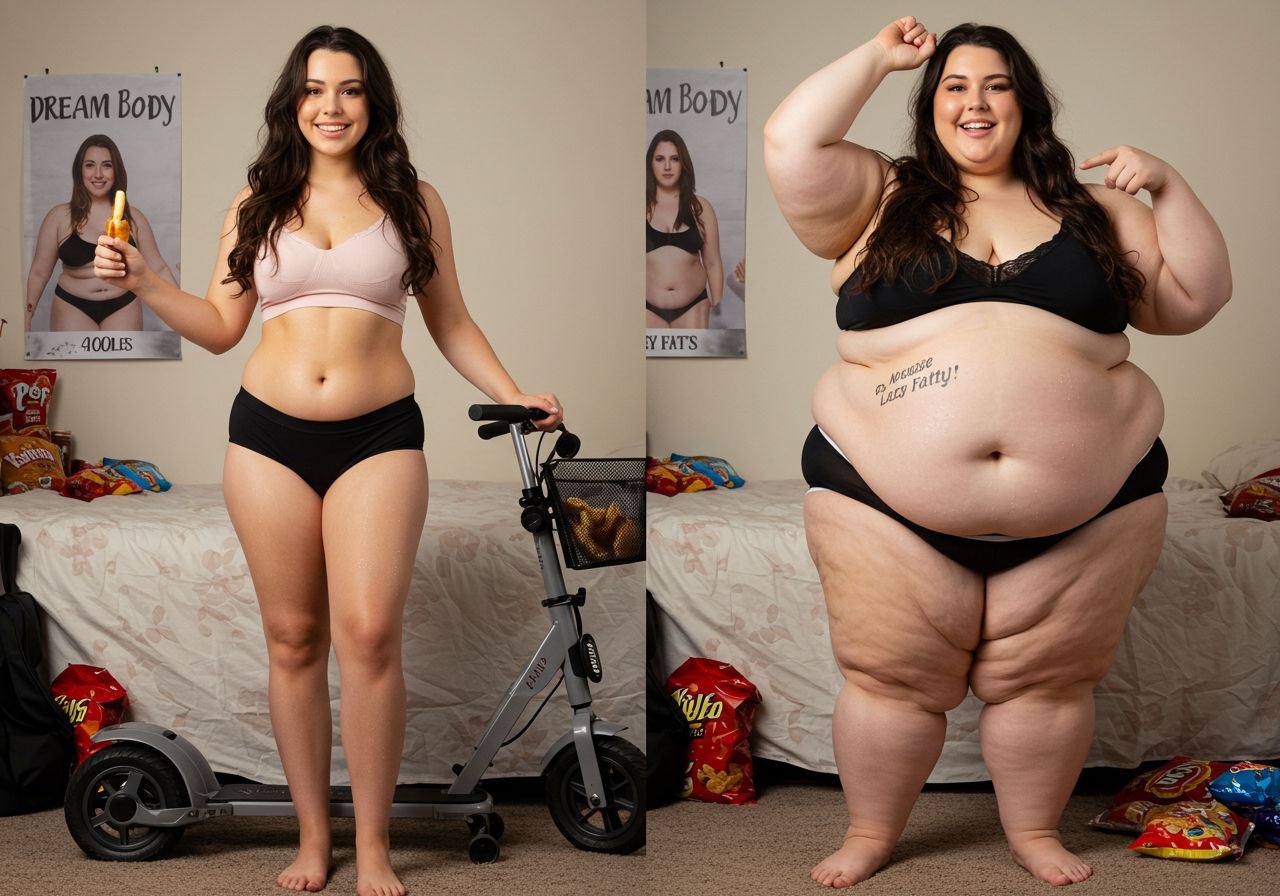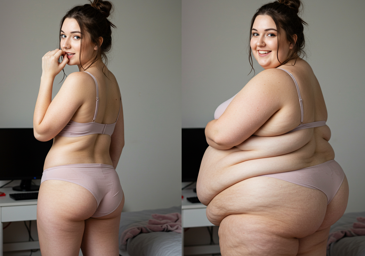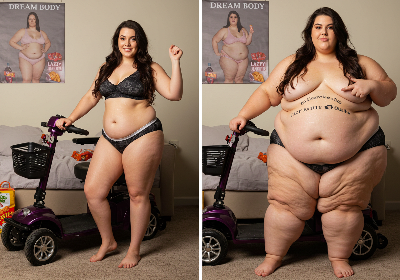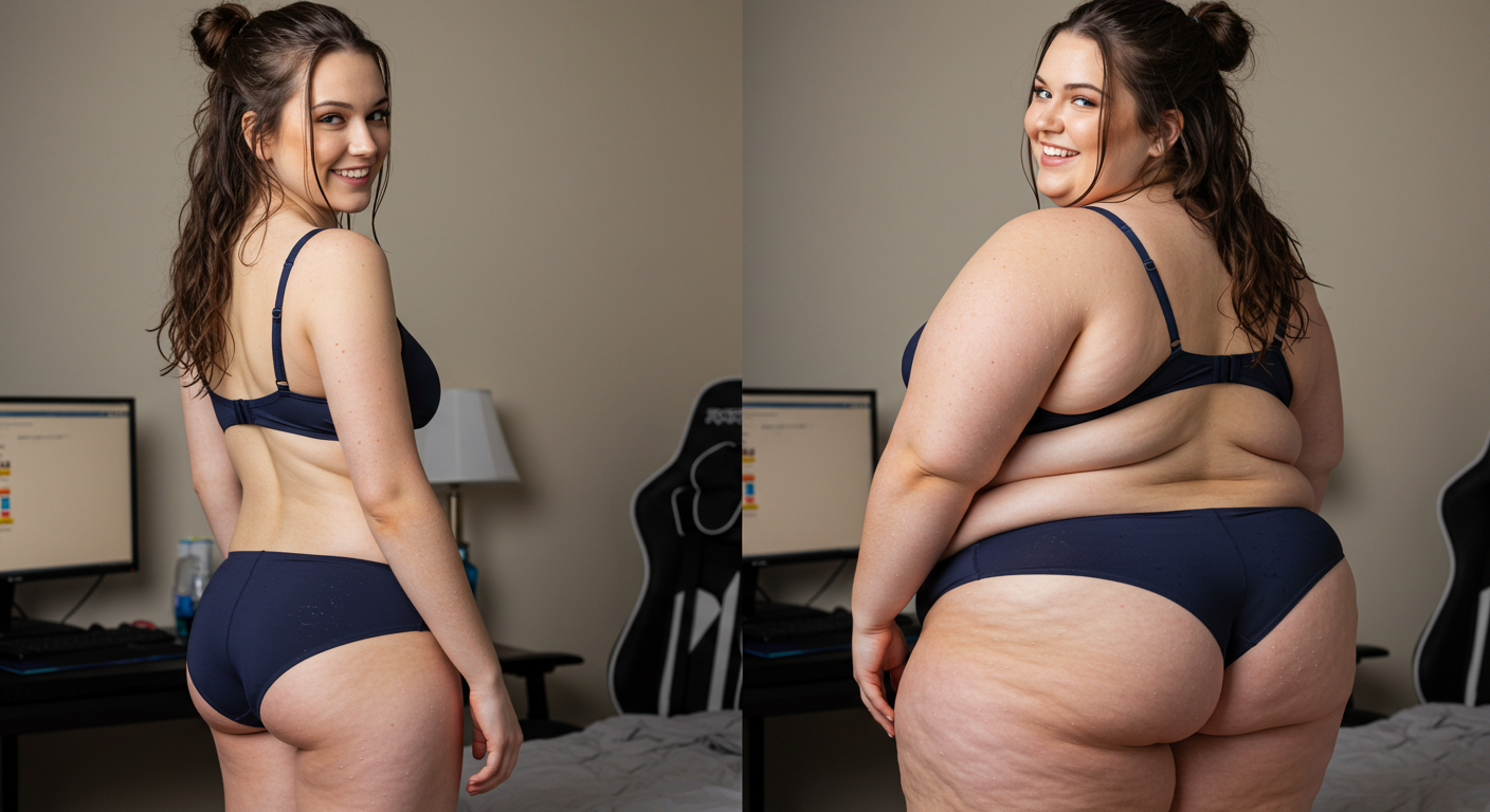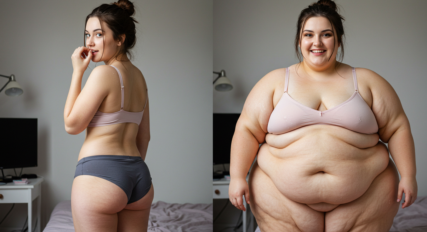 in the during picture her body got obese, held a tiny white marker board with the written sentence "DAYS LEFT: 150" with food doodles. in the after picture, she is well over 1000 lbs and monstruously obese, particular emphasis on how obese she is, monstrously blob knees, stretchy obese wide navel and obese groin hanging out, monstrously blubbery round face, monstrously obese humongous waist, she has obese pillowy arms and fat rolls on her upper arms. humongous knees, blushed cheeks, cute smile. festive numbers balloons "400lb",