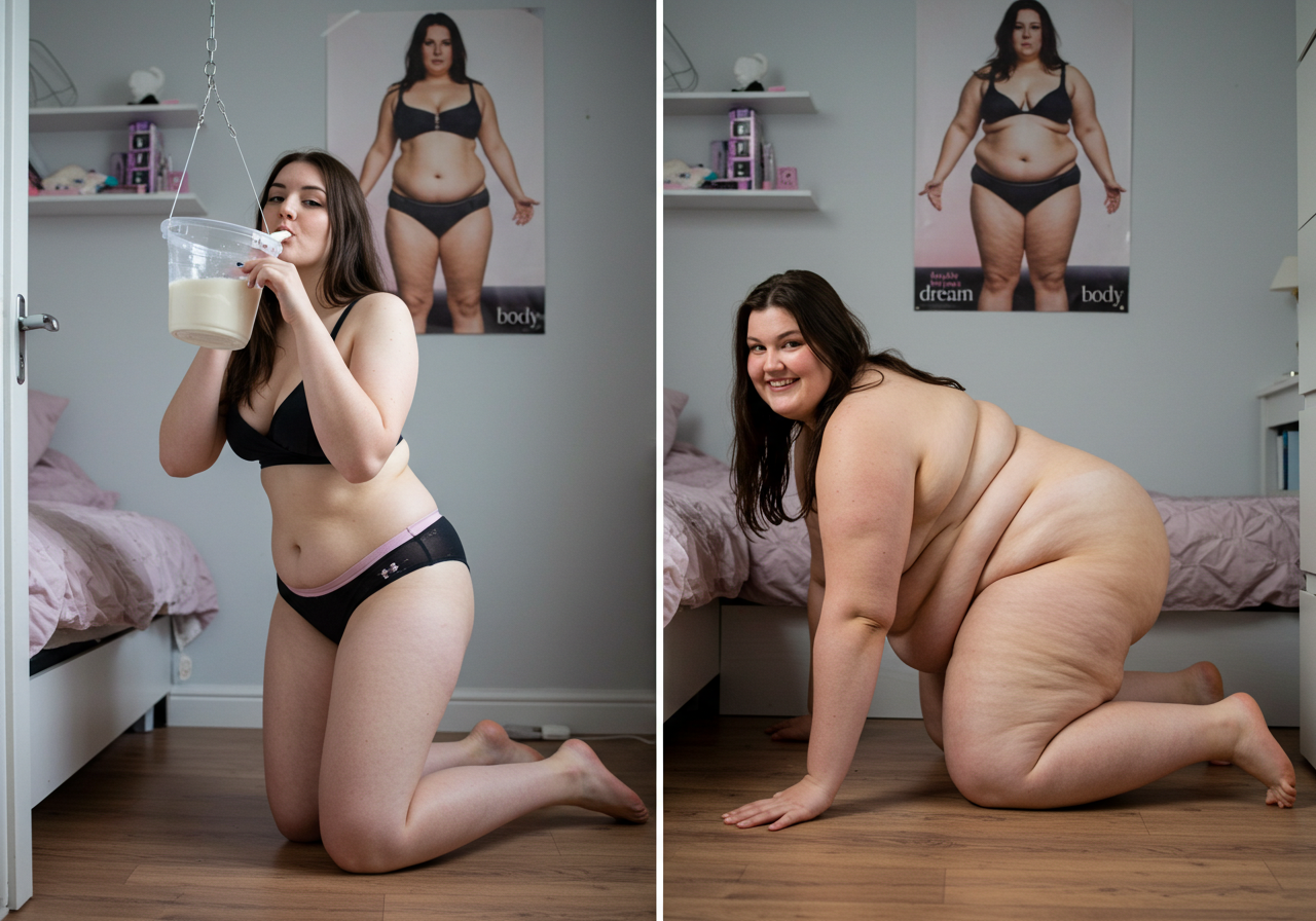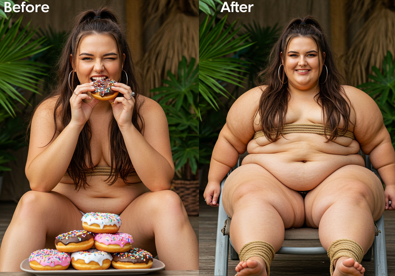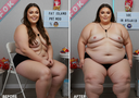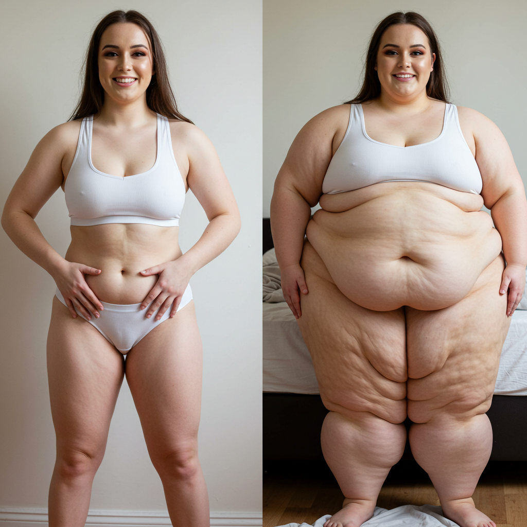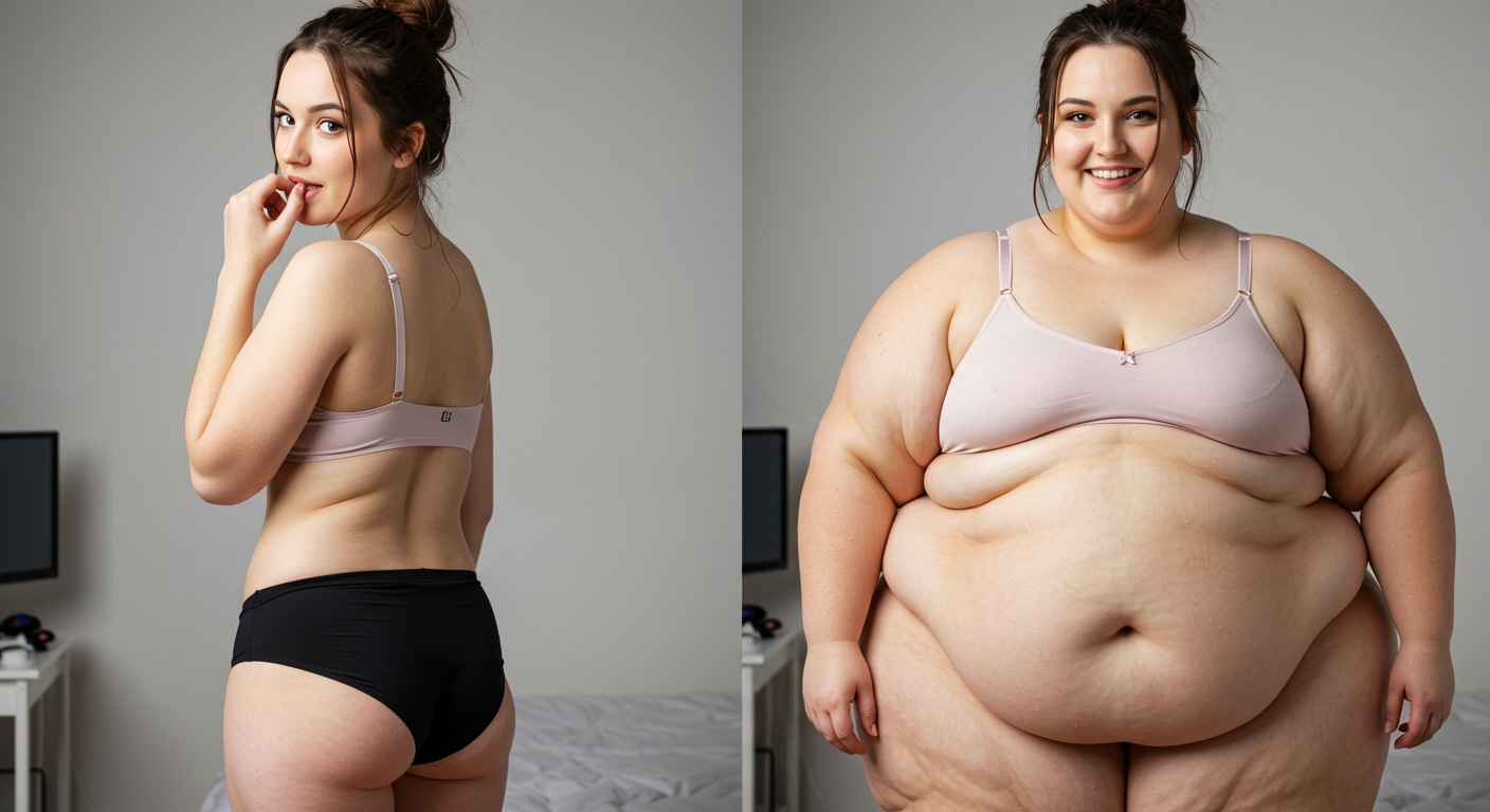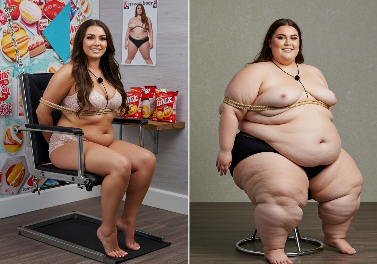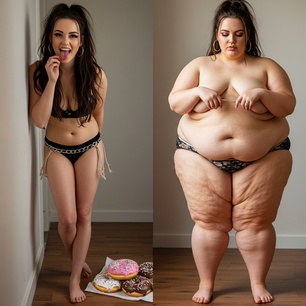 in the during picture her body got obese, held a tiny white marker board with the written sentence "DAYS LEFT: 150" with food doodles. in the after picture, she is well over 1000 lbs and monstruously obese, particular emphasis on how obese she is, monstrously blob knees, stretchy obese wide navel and obese groin hanging out, monstrously blubbery round face, monstrously obese humongous waist, she has obese pillowy arms and fat rolls on her upper arms. humongous knees, blushed cheeks, cute smile. festive numbers balloons "400lb",