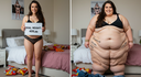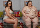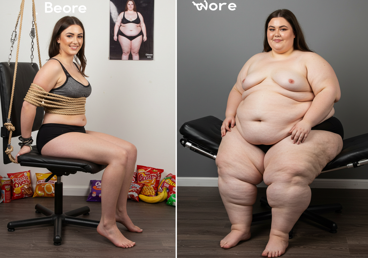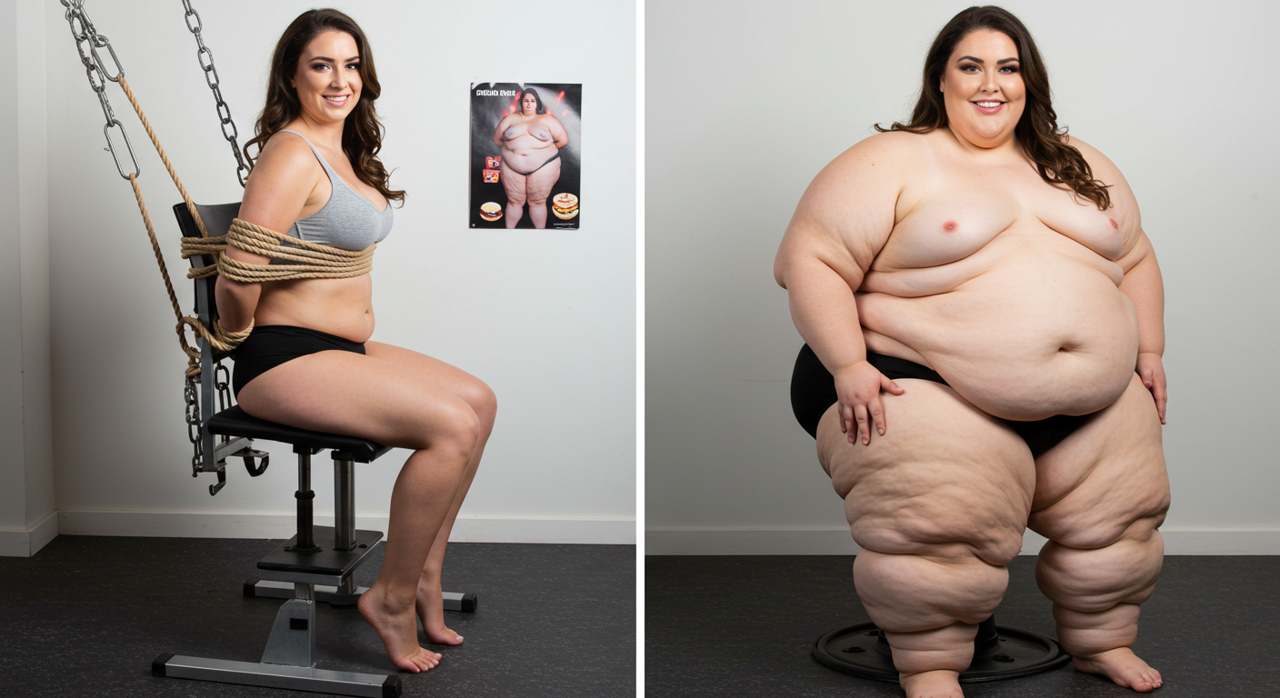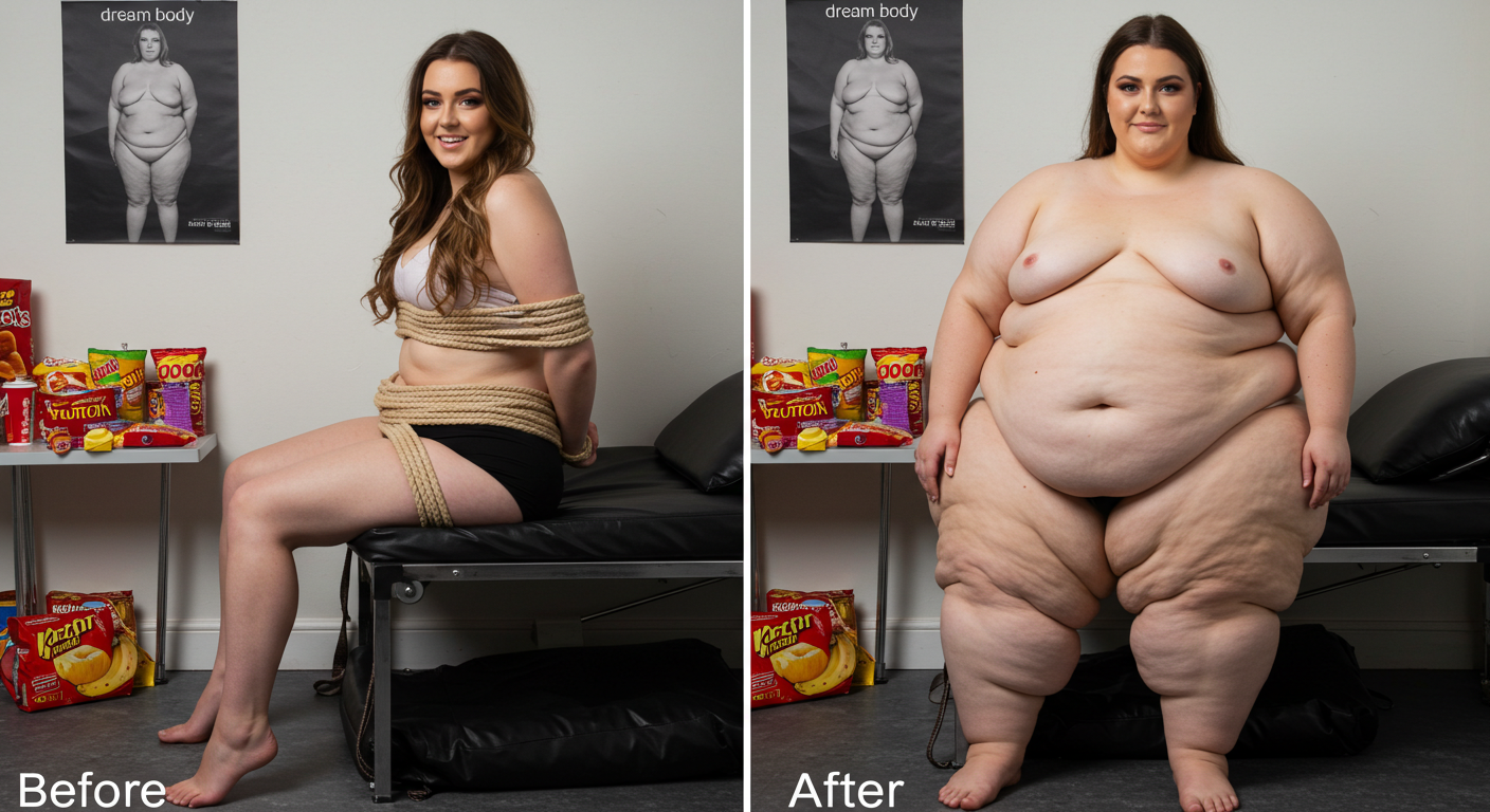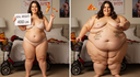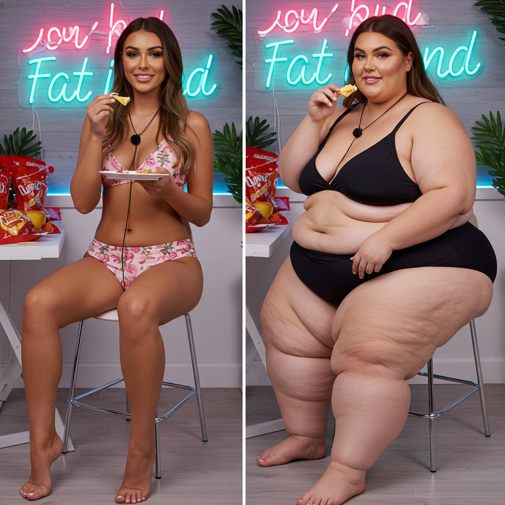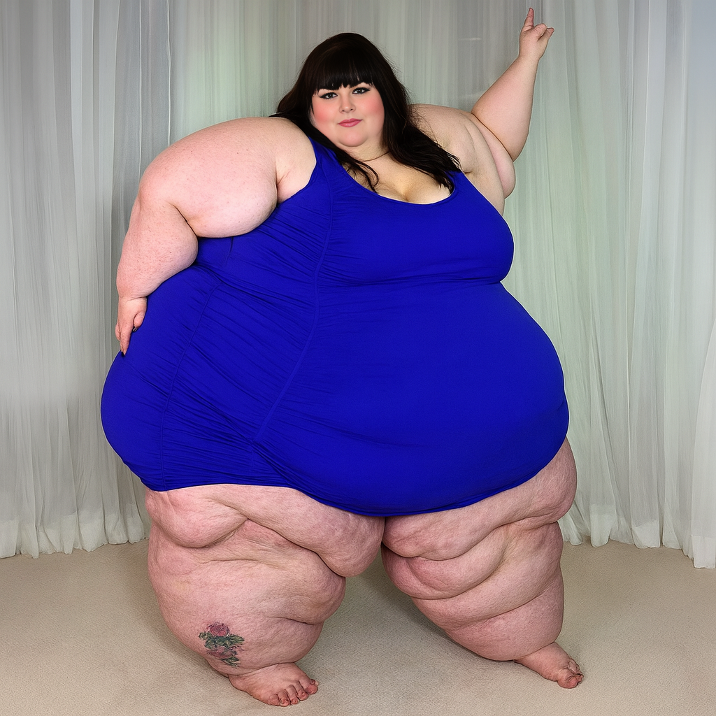 in the during picture her body got obese, held a tiny white marker board with the written sentence "DAYS LEFT: 150" with food doodles. in the after picture, she is well over 1000 lbs and monstruously obese, particular emphasis on how obese she is, monstrously blob knees, stretchy obese wide navel and obese groin hanging out, monstrously blubbery round face, monstrously obese humongous waist, she has obese pillowy arms and fat rolls on her upper arms. humongous knees, blushed cheeks, cute smile. festive numbers balloons "400lb",