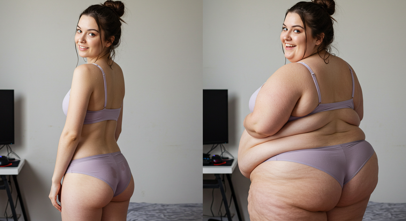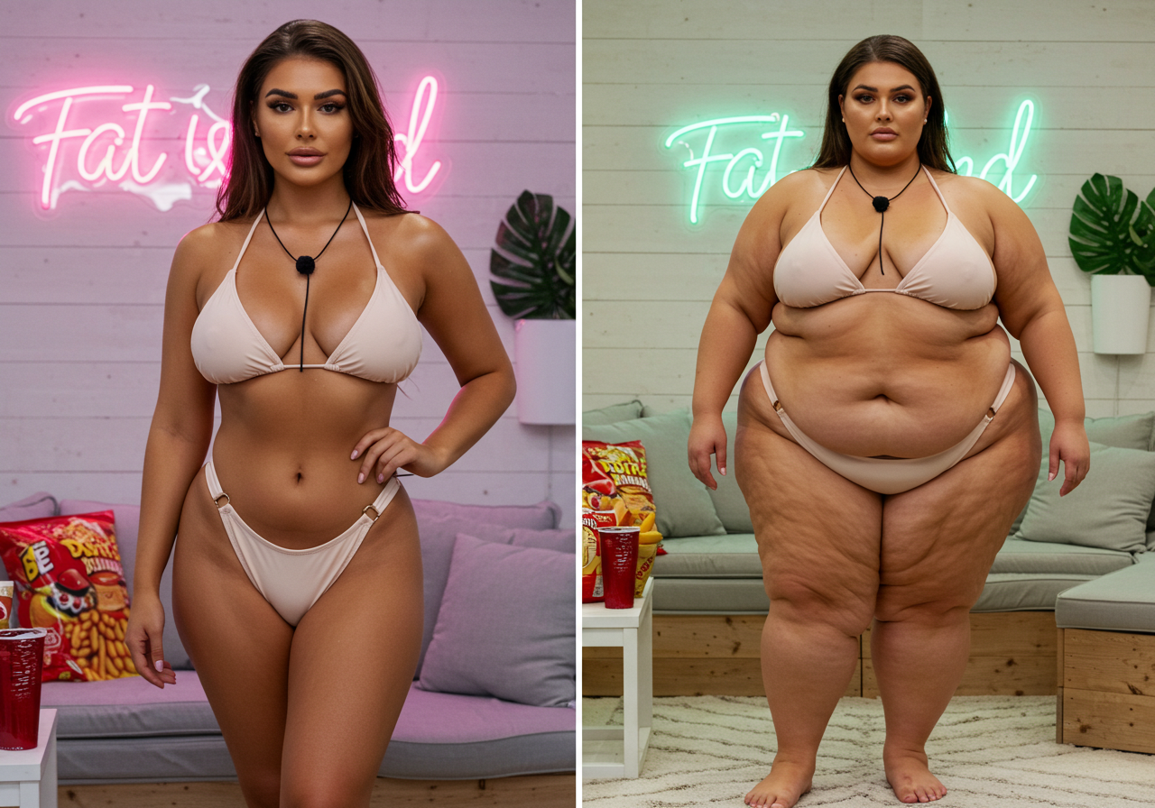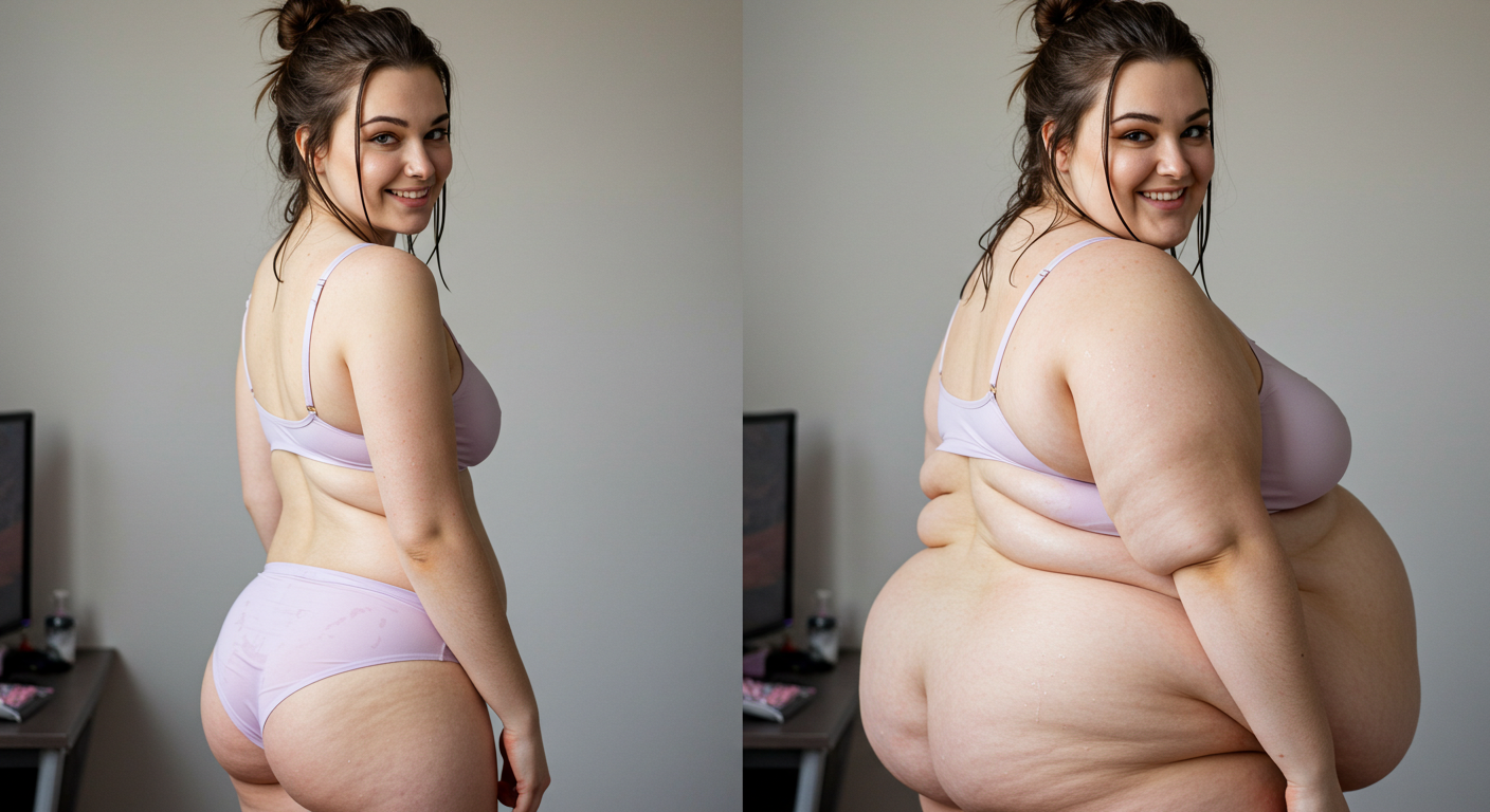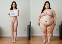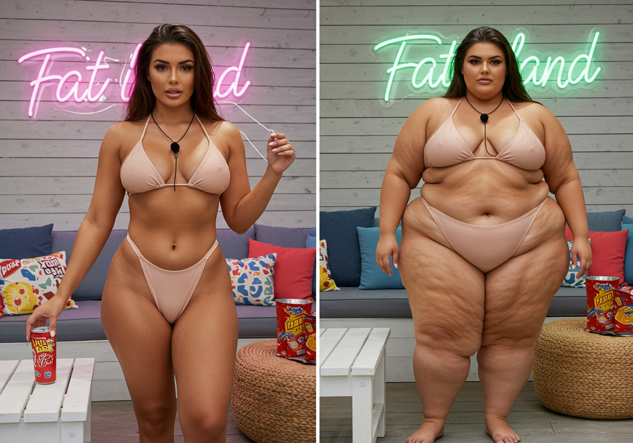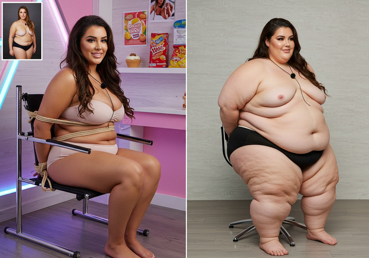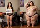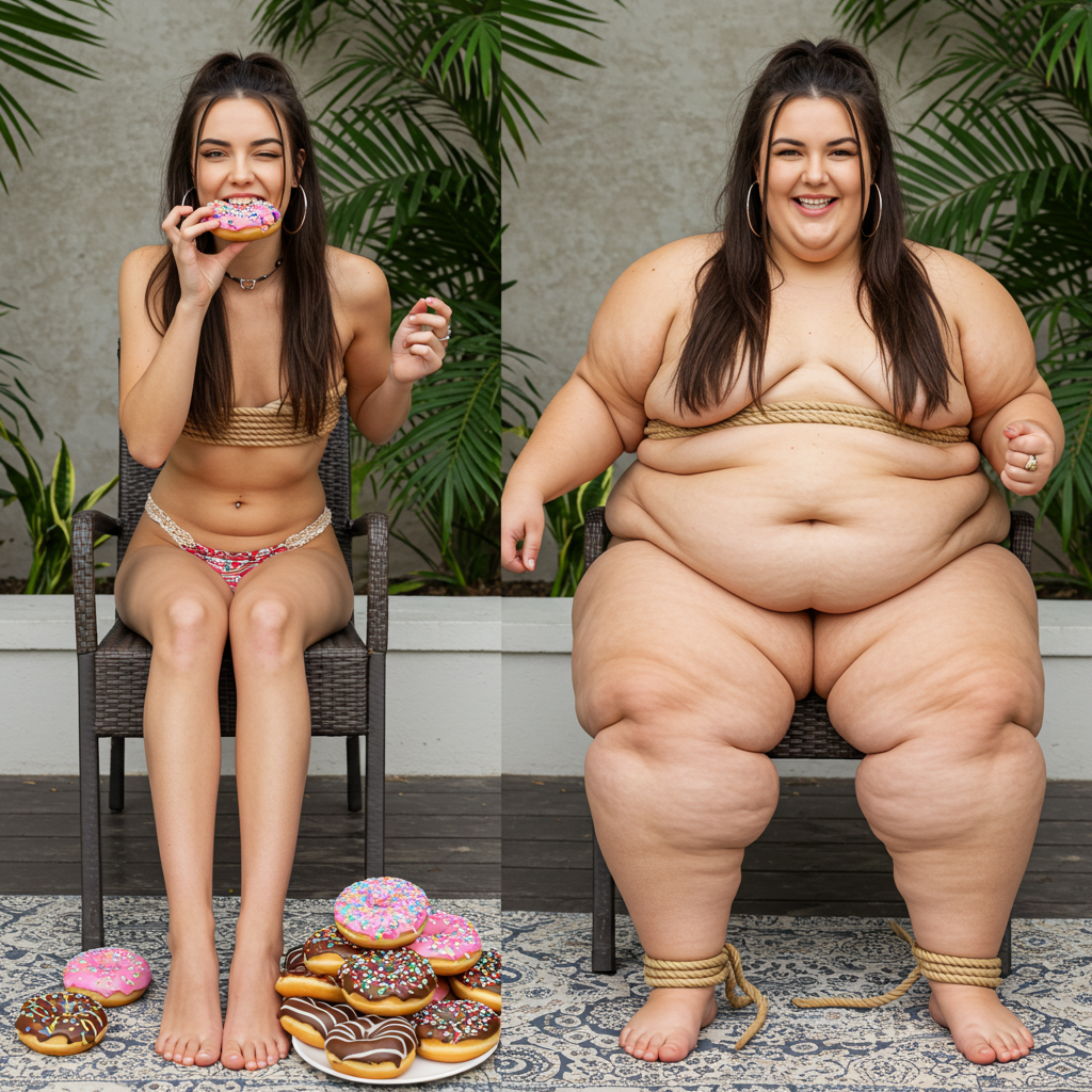 in the during picture her body got obese, held a tiny white marker board with the written sentence "DAYS LEFT: 150" with food doodles. in the after picture, she is well over 1000 lbs and monstruously obese, particular emphasis on how obese she is, monstrously blob knees, stretchy obese wide navel and obese groin hanging out, monstrously blubbery round face, monstrously obese humongous waist, she has obese pillowy arms and fat rolls on her upper arms. humongous knees, blushed cheeks, cute smile. festive numbers balloons "400lb",