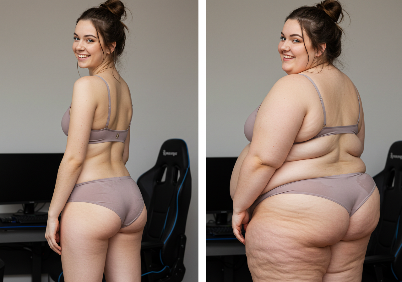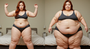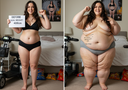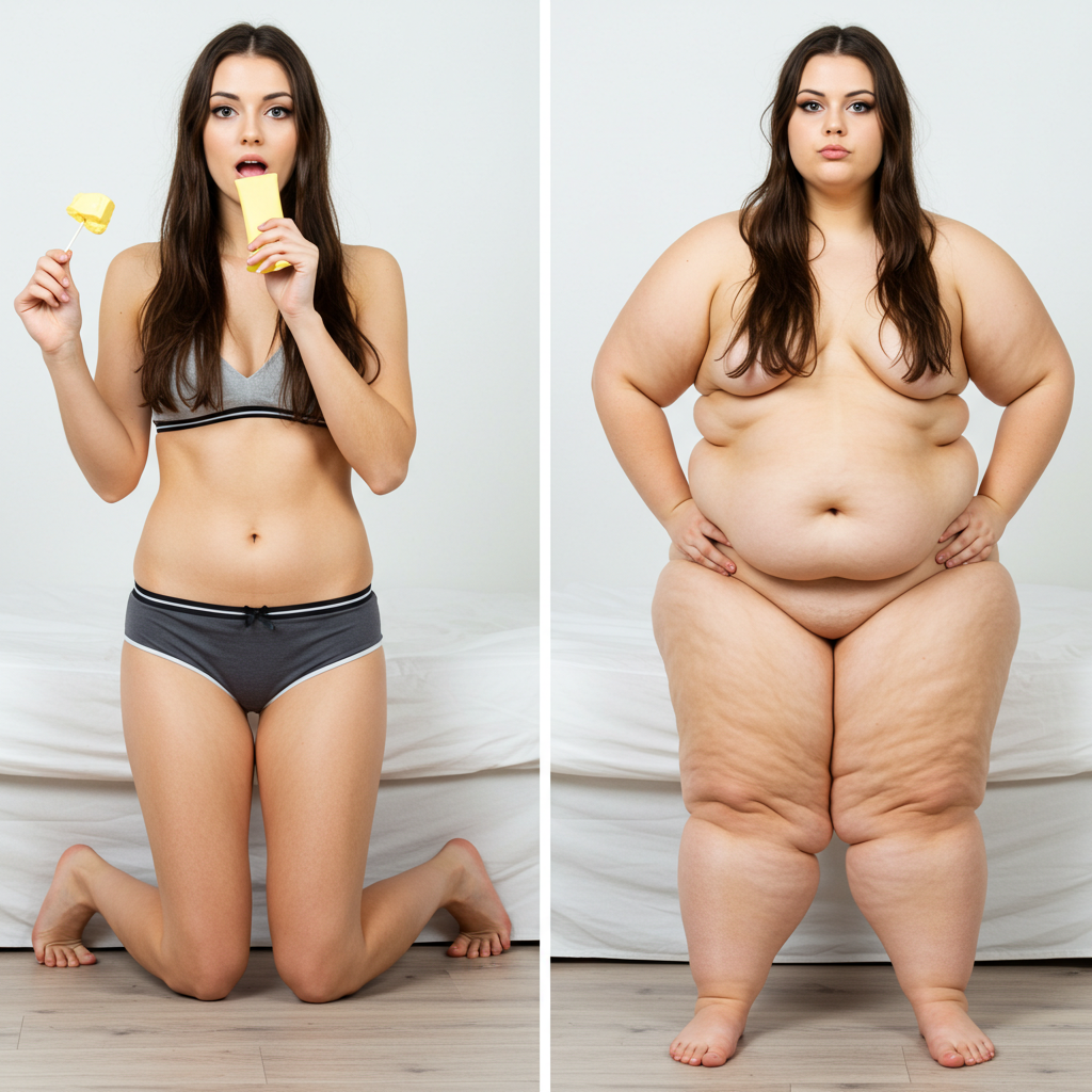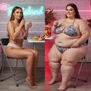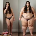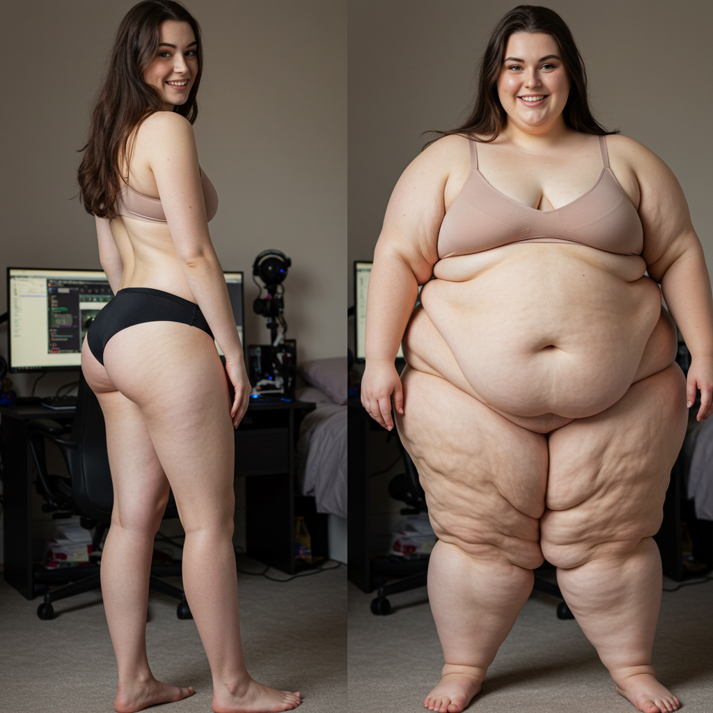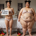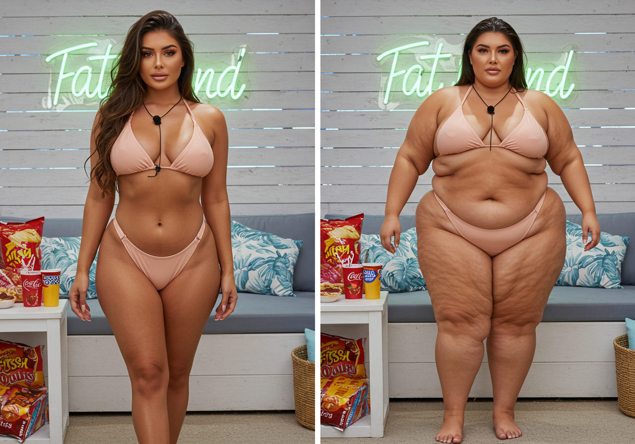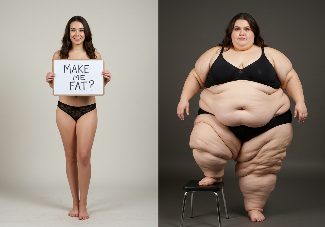 in the during picture her body got obese, held a tiny white marker board with the written sentence "DAYS LEFT: 150" with food doodles. in the after picture, she is well over 1000 lbs and monstruously obese, particular emphasis on how obese she is, monstrously blob knees, stretchy obese wide navel and obese groin hanging out, monstrously blubbery round face, monstrously obese humongous waist, she has obese pillowy arms and fat rolls on her upper arms. humongous knees, blushed cheeks, cute smile. festive numbers balloons "400lb",