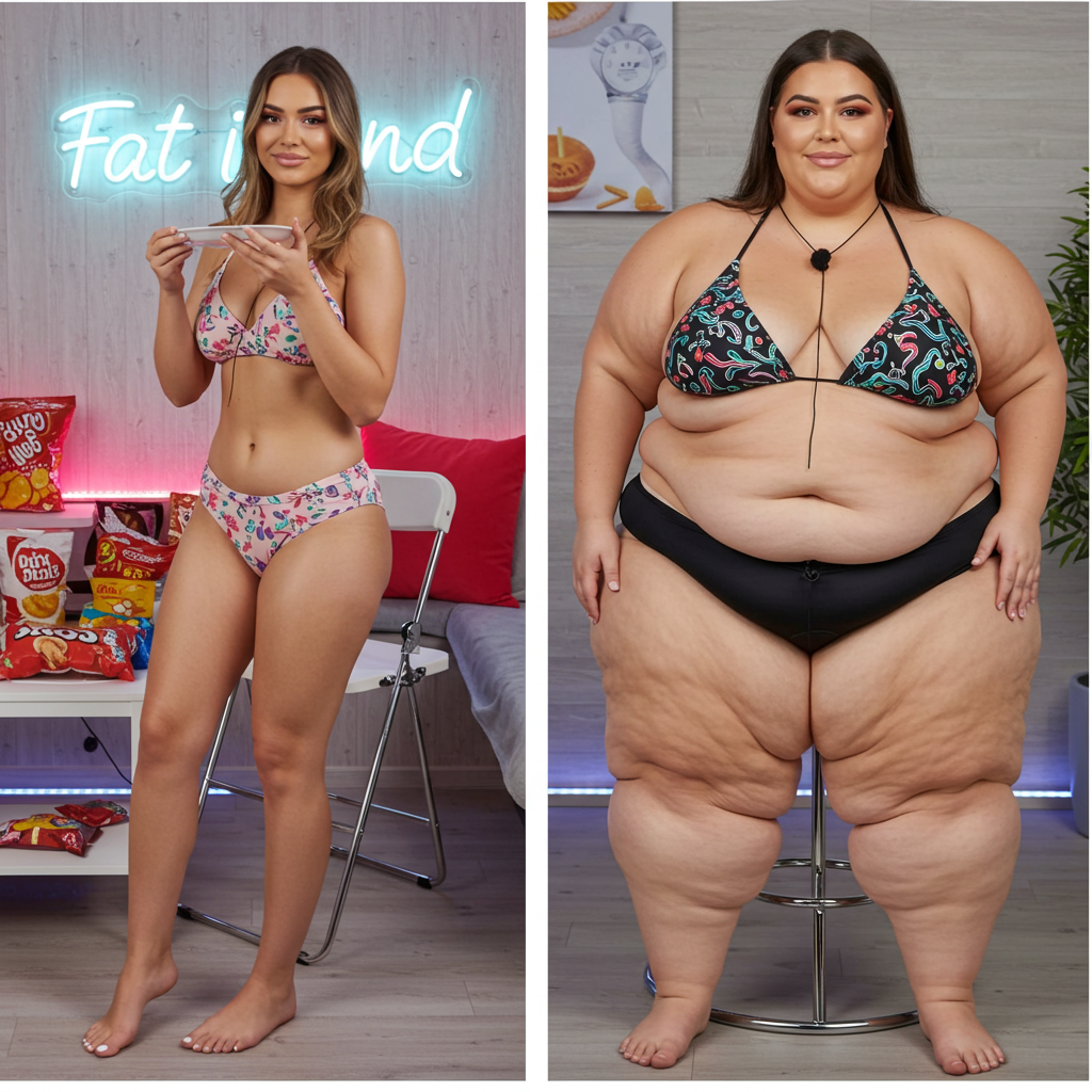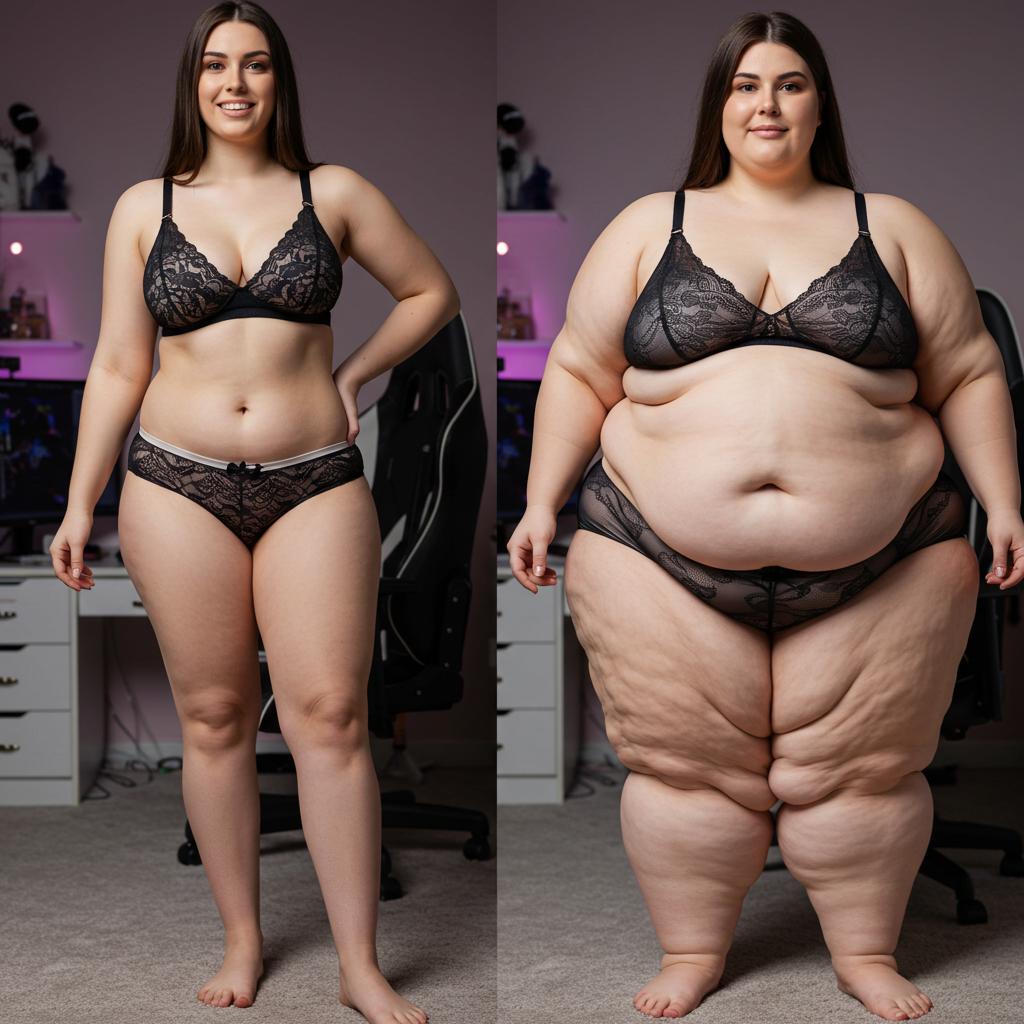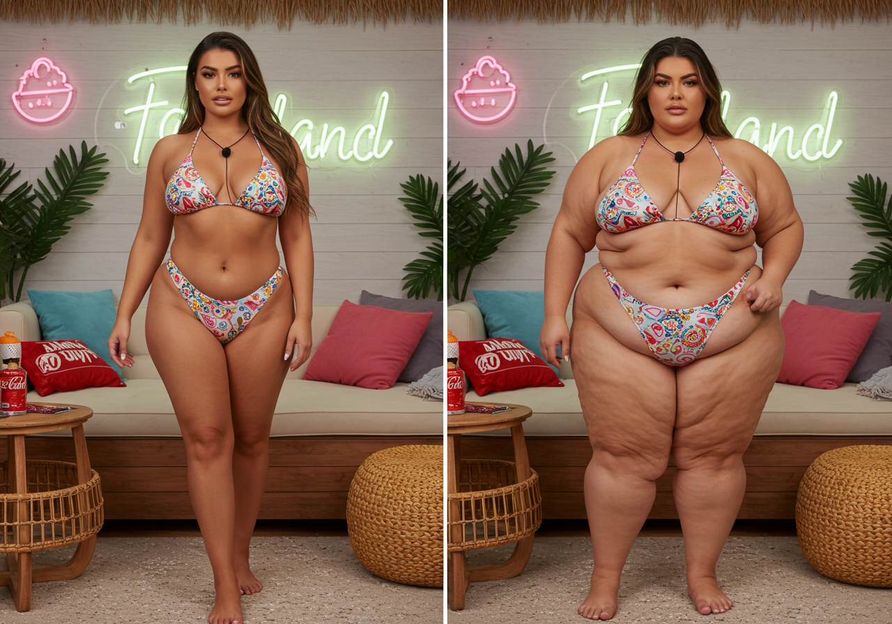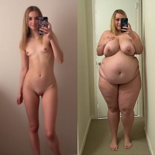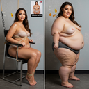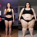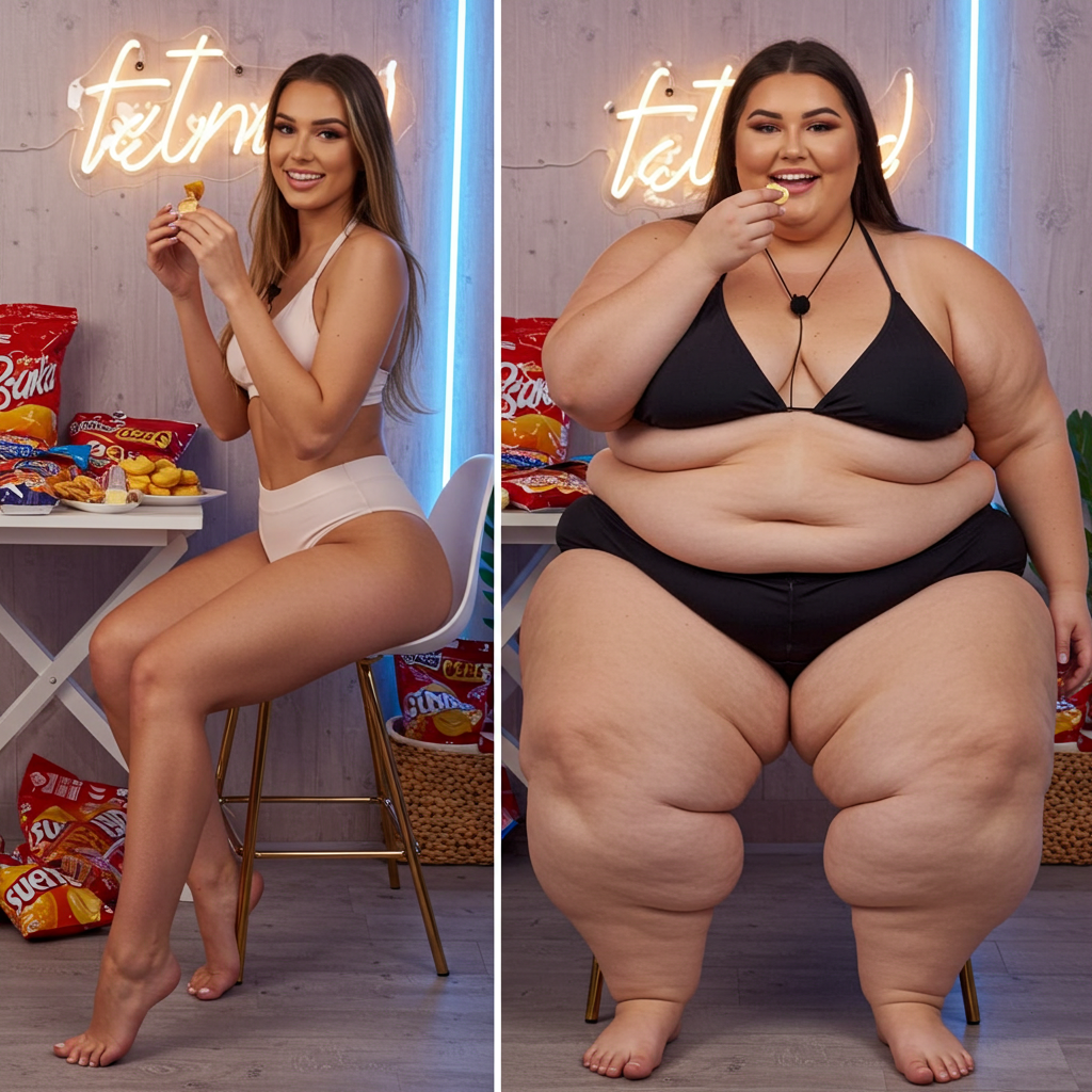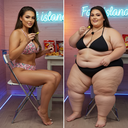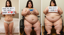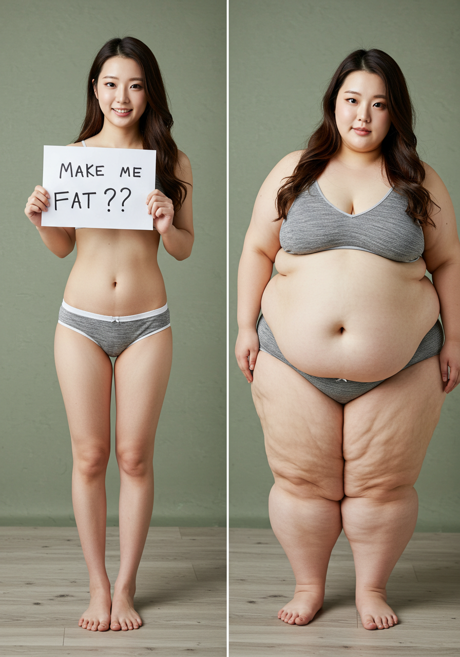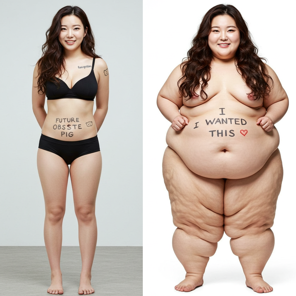 in the during picture her body got obese, held a tiny white marker board with the written sentence "DAYS LEFT: 150" with food doodles. in the after picture, she is well over 1000 lbs and monstruously obese, particular emphasis on how obese she is, monstrously blob knees, stretchy obese wide navel and obese groin hanging out, monstrously blubbery round face, monstrously obese humongous waist, she has obese pillowy arms and fat rolls on her upper arms. humongous knees, blushed cheeks, cute smile. festive numbers balloons "400lb",