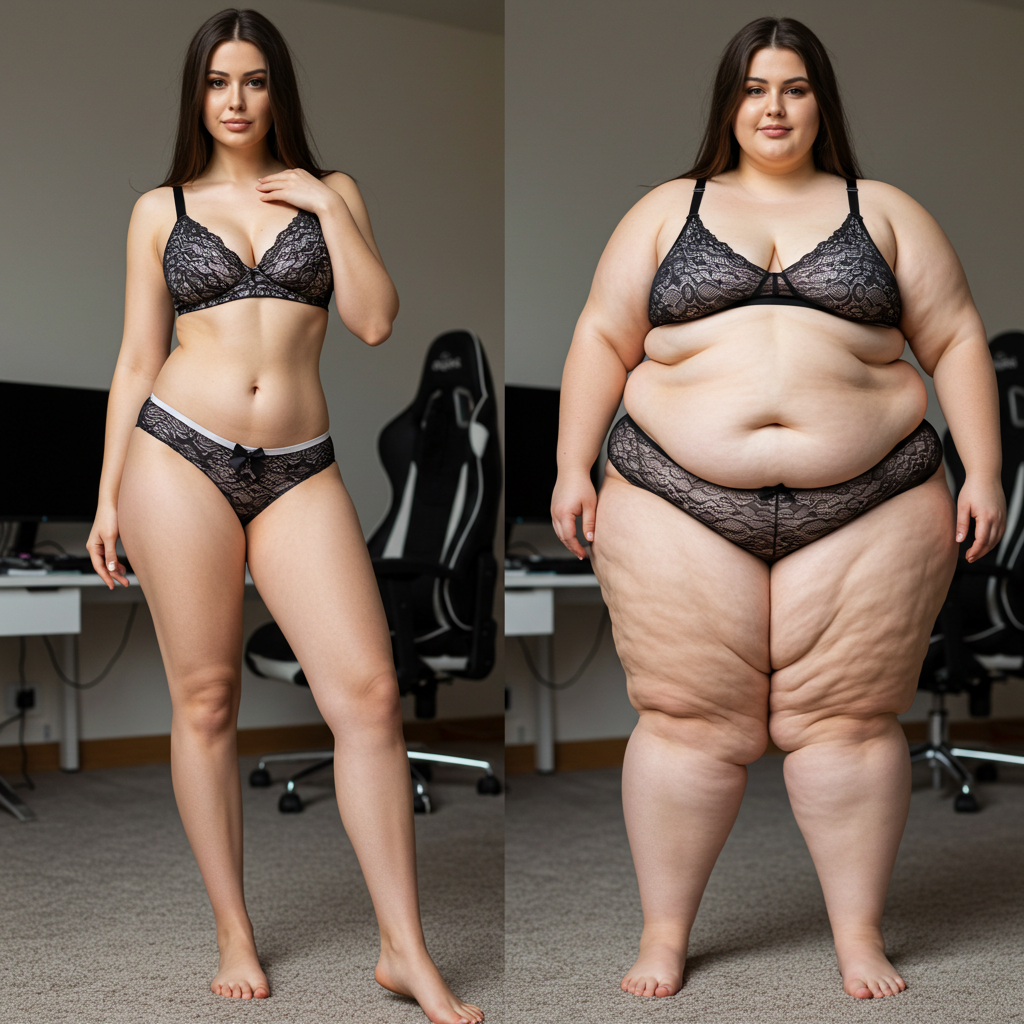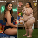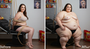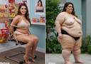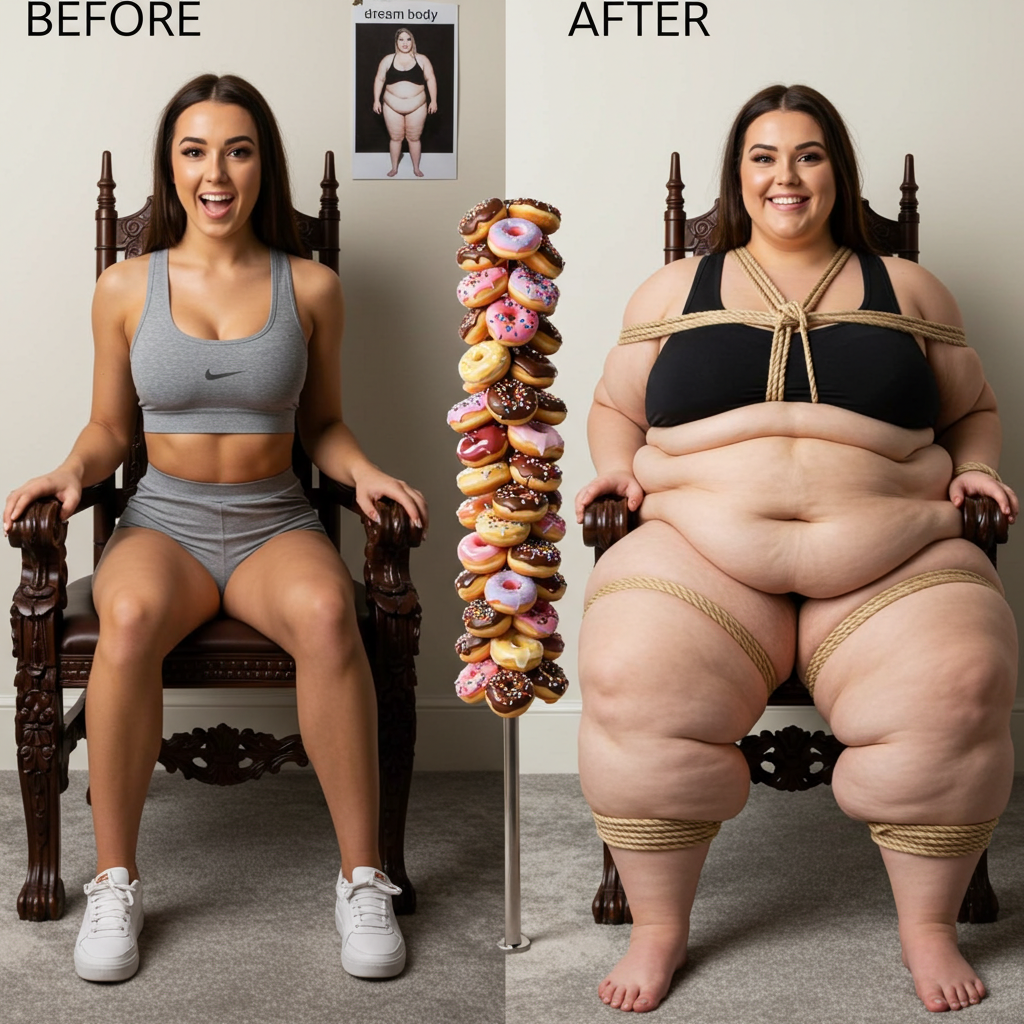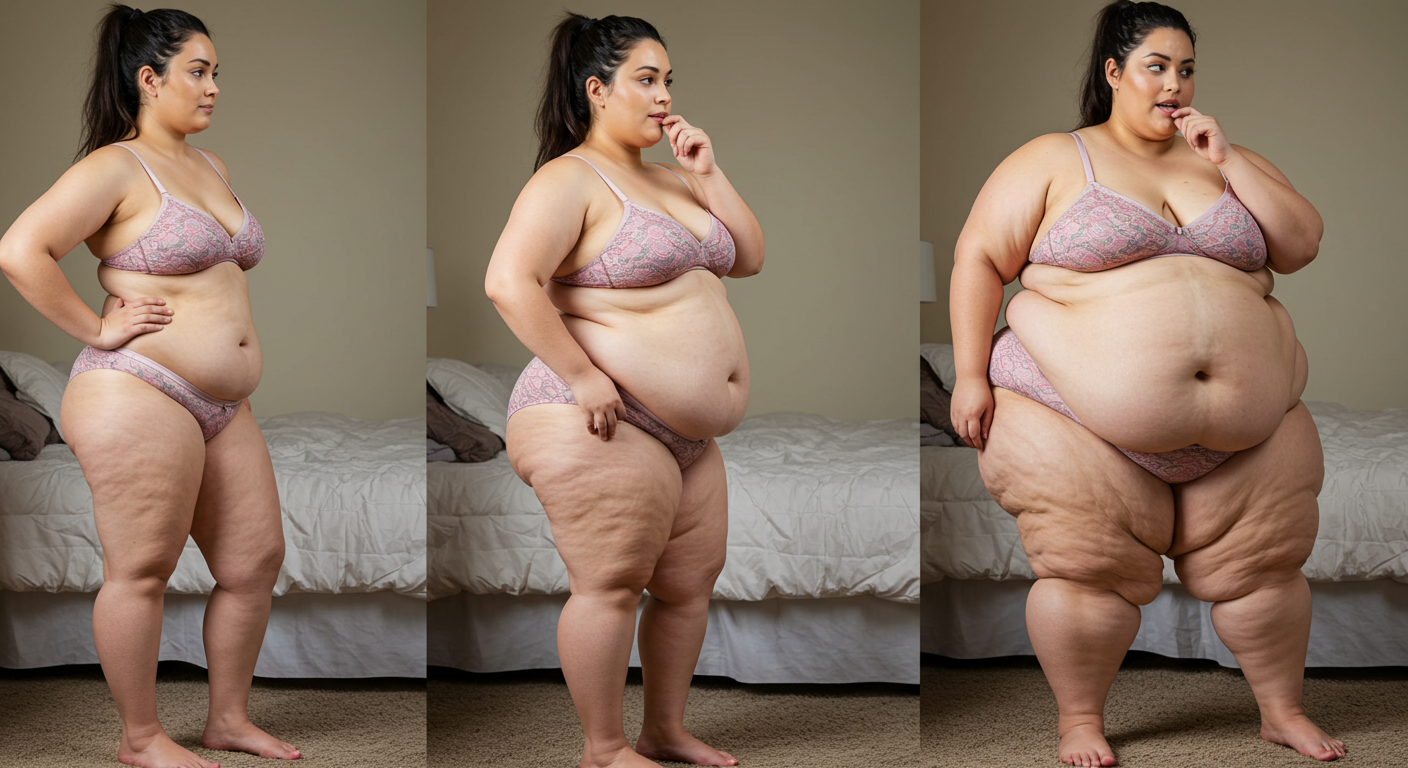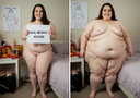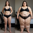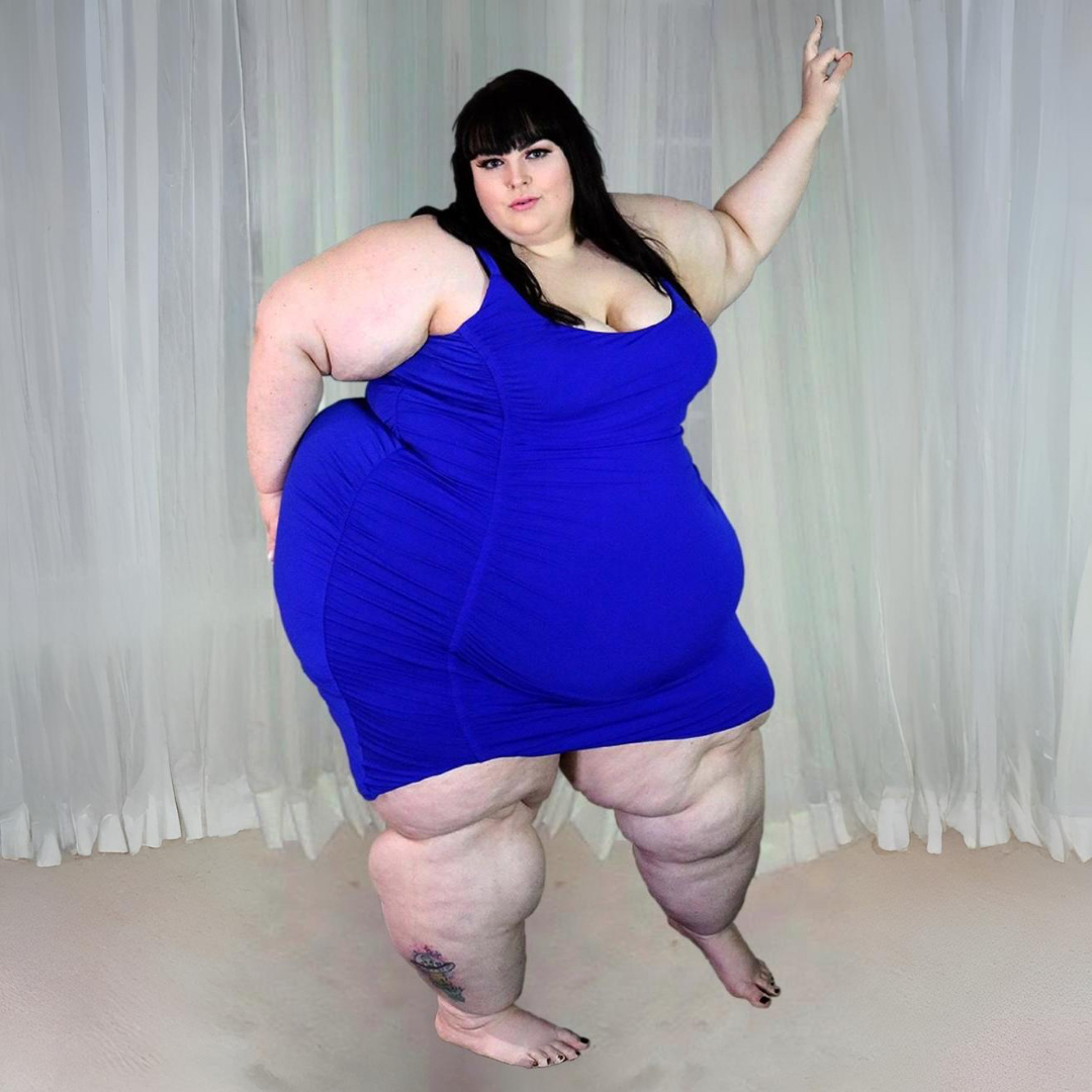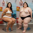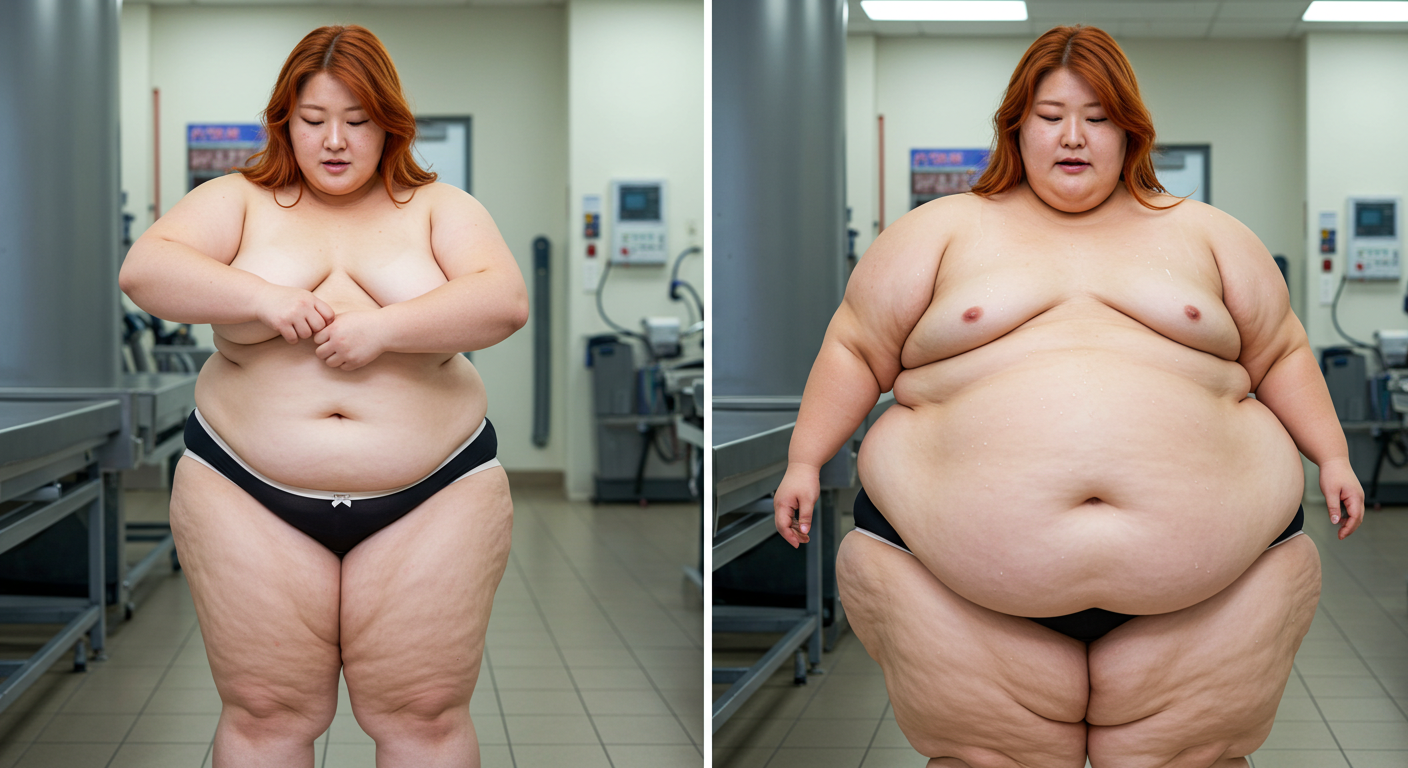 in the during picture her body got obese, held a tiny white marker board with the written sentence "DAYS LEFT: 150" with food doodles. in the after picture, she is well over 1000 lbs and monstruously obese, particular emphasis on how obese she is, monstrously blob knees, stretchy obese wide navel and obese groin hanging out, monstrously blubbery round face, monstrously obese humongous waist, she has obese pillowy arms and fat rolls on her upper arms. humongous knees, blushed cheeks, cute smile. festive numbers balloons "400lb",