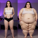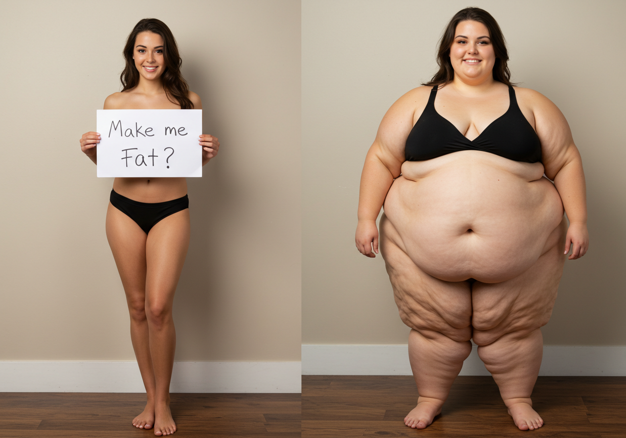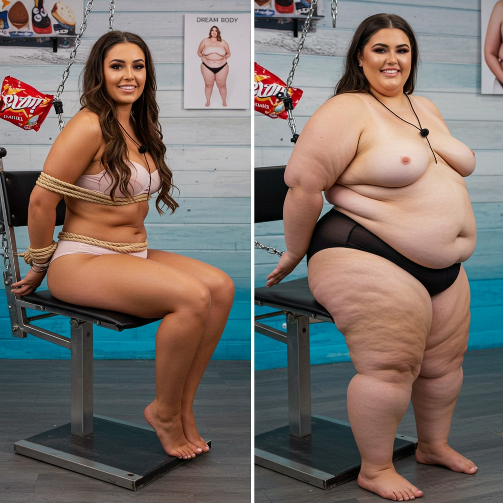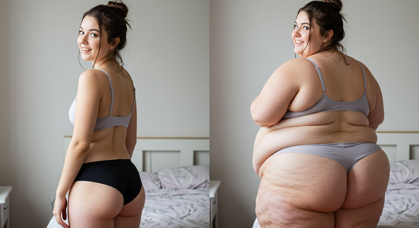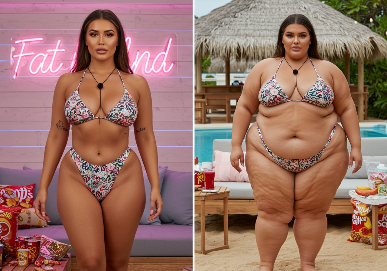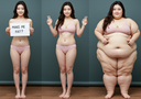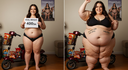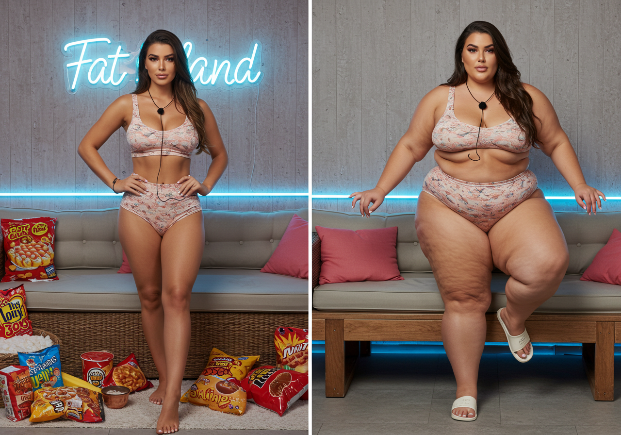 in the during picture her body got obese, held a tiny white marker board with the written sentence "DAYS LEFT: 150" with food doodles. in the after picture, she is well over 1000 lbs and monstruously obese, particular emphasis on how obese she is, monstrously blob knees, stretchy obese wide navel and obese groin hanging out, monstrously blubbery round face, monstrously obese humongous waist, she has obese pillowy arms and fat rolls on her upper arms. humongous knees, blushed cheeks, cute smile. festive numbers balloons "400lb",