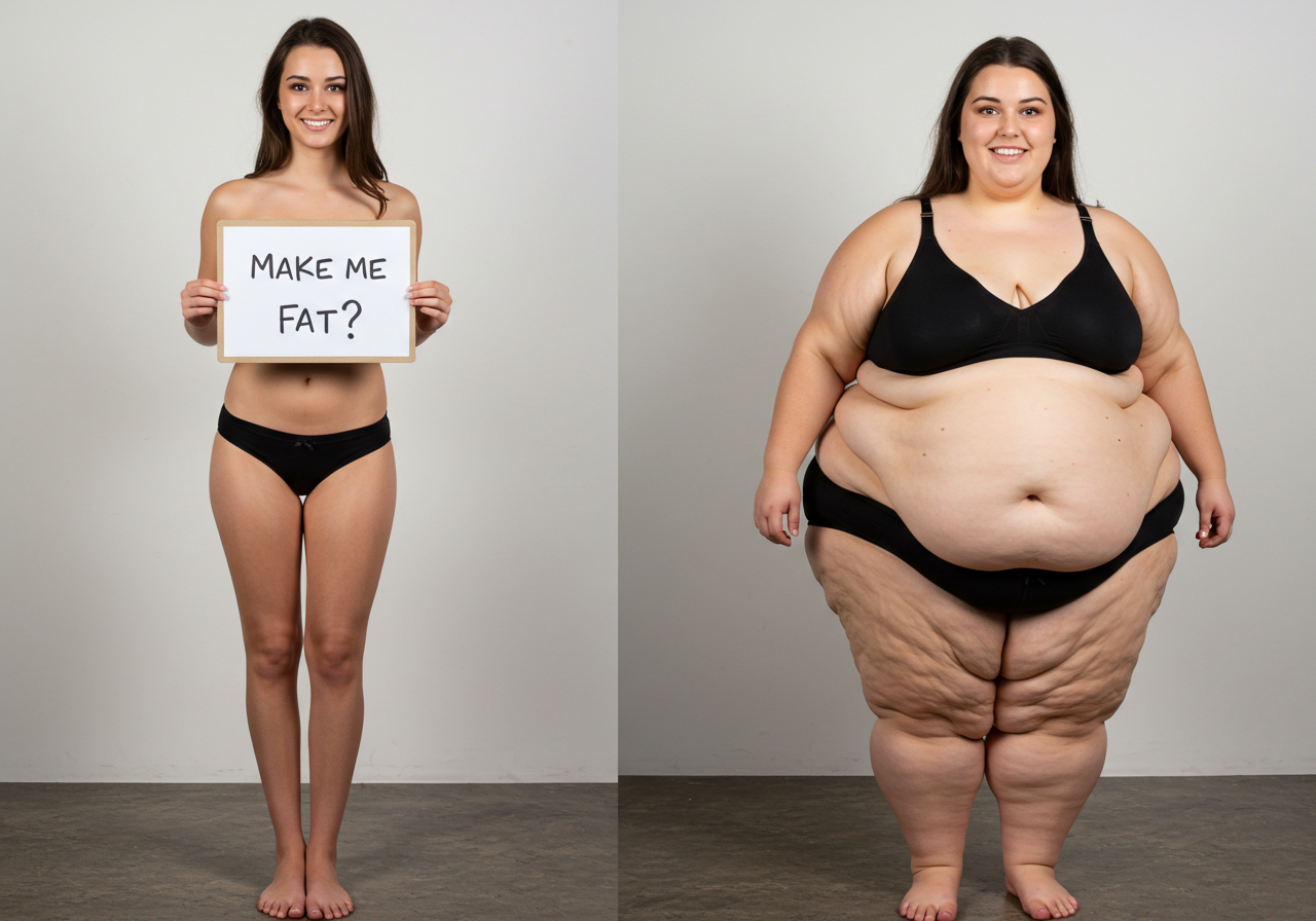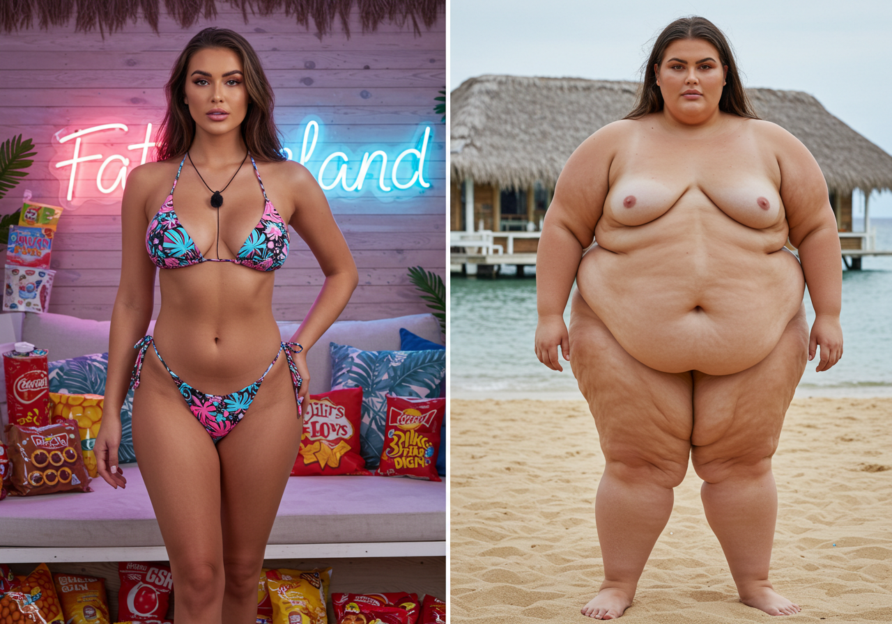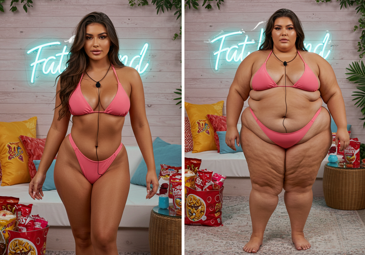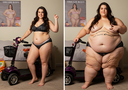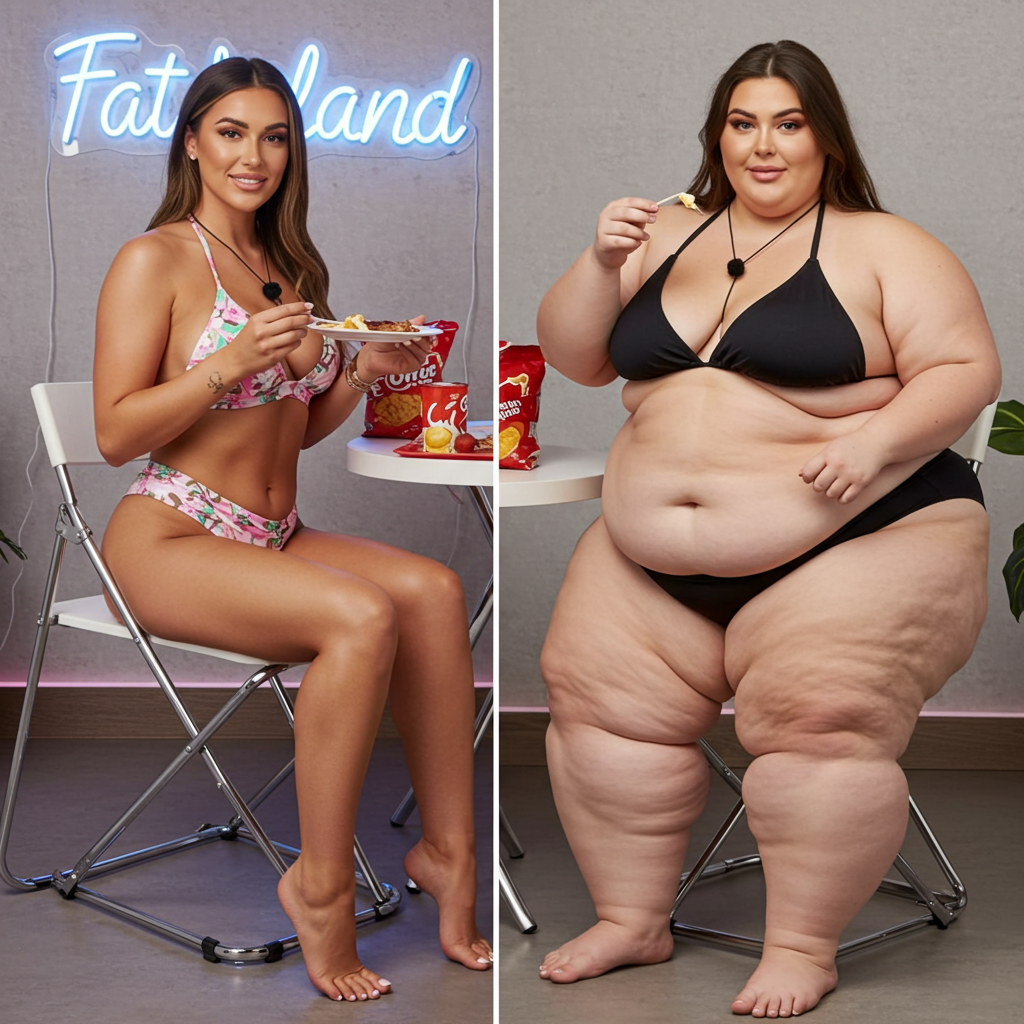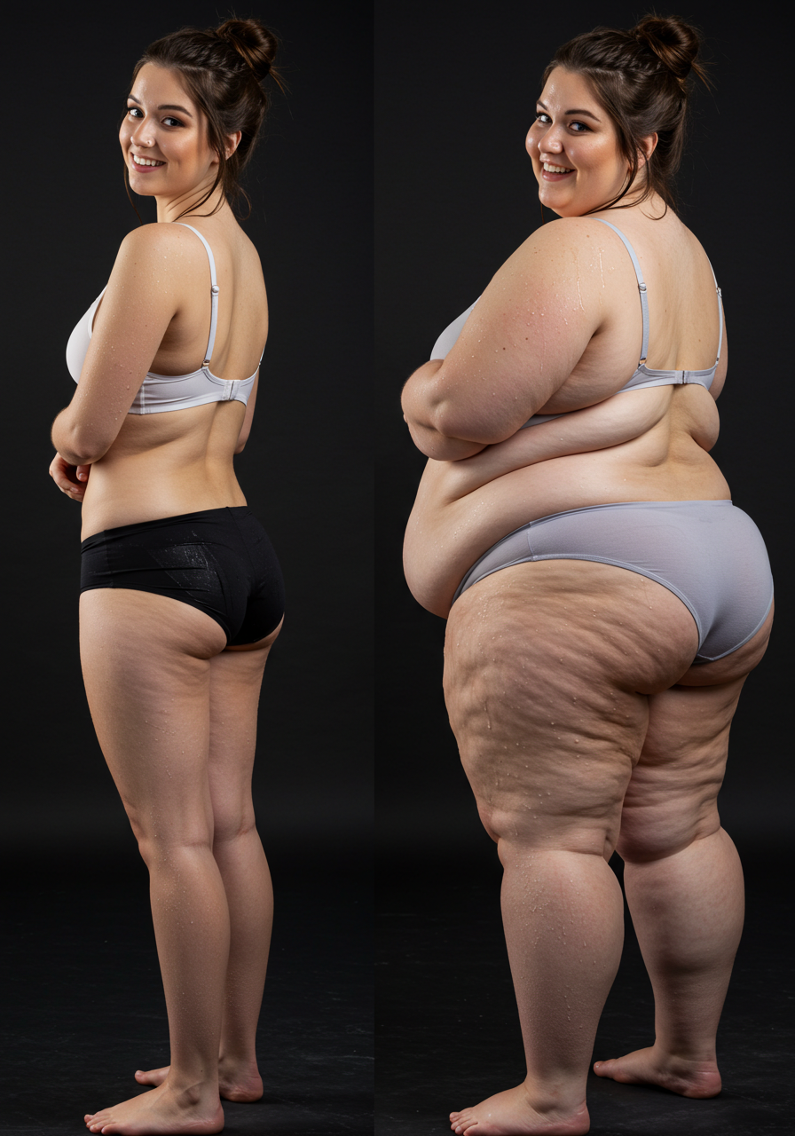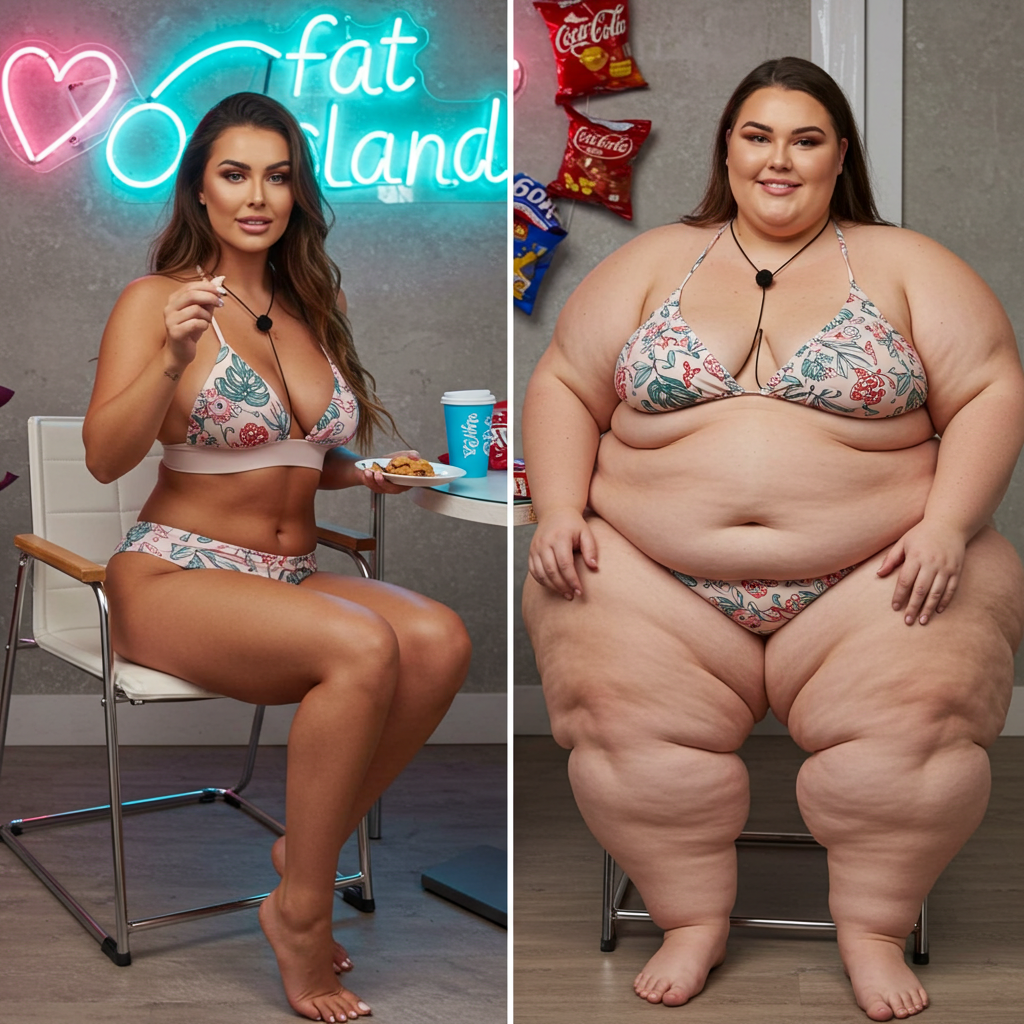 in the during picture her body got obese, held a tiny white marker board with the written sentence "DAYS LEFT: 150" with food doodles. in the after picture, she is well over 1000 lbs and monstruously obese, particular emphasis on how obese she is, monstrously blob knees, stretchy obese wide navel and obese groin hanging out, monstrously blubbery round face, monstrously obese humongous waist, she has obese pillowy arms and fat rolls on her upper arms. humongous knees, blushed cheeks, cute smile. festive numbers balloons "400lb",
