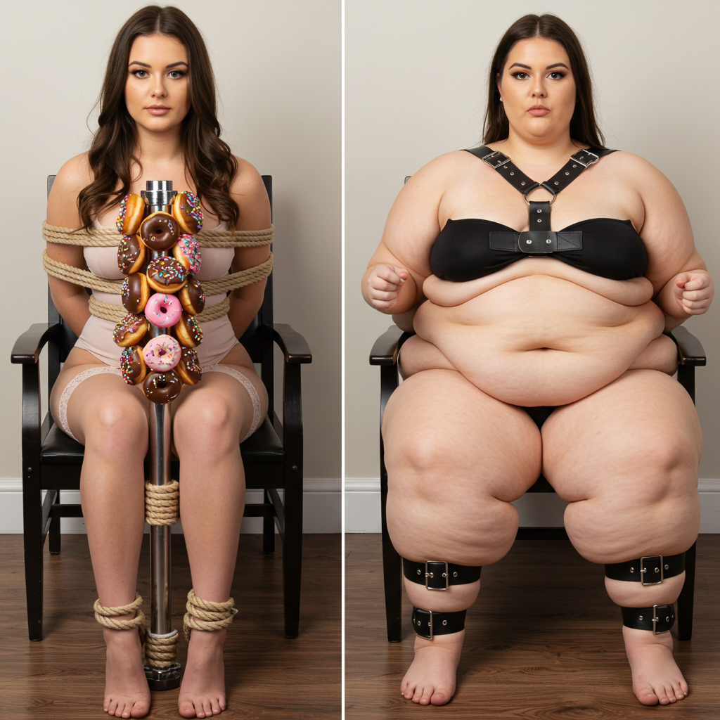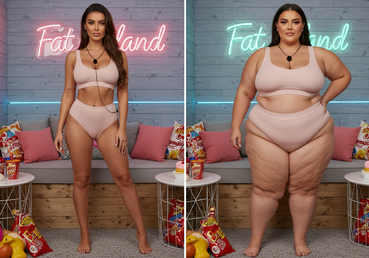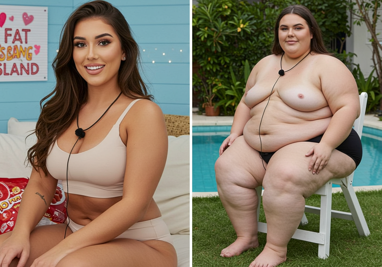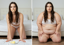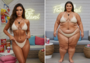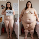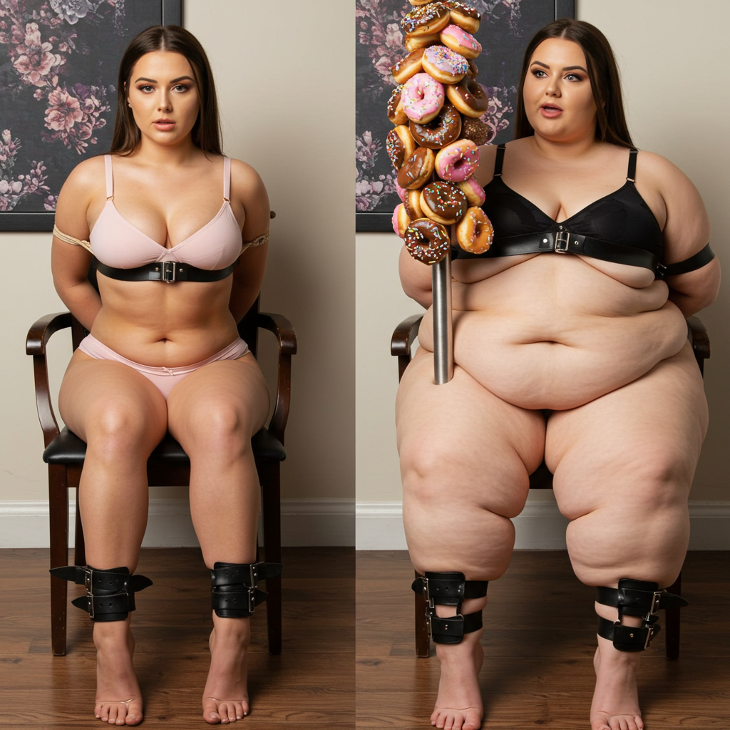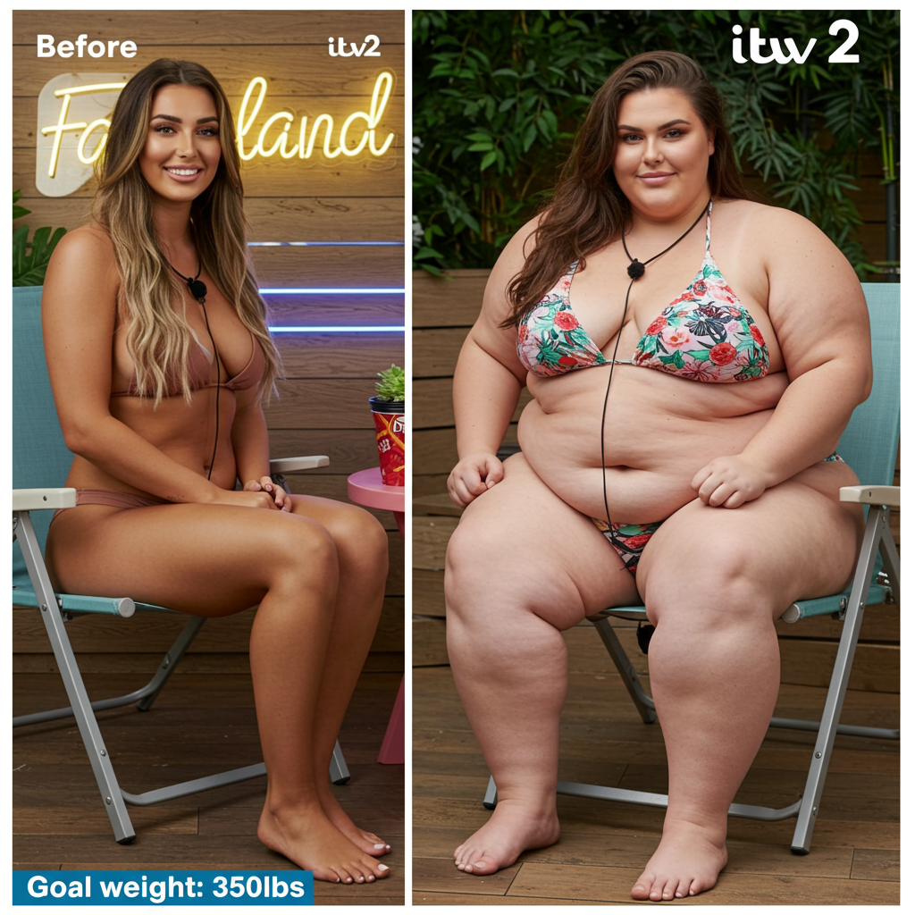 in the during picture her body got obese, held a tiny white marker board with the written sentence "DAYS LEFT: 150" with food doodles. in the after picture, she is well over 1000 lbs and monstruously obese, particular emphasis on how obese she is, monstrously blob knees, stretchy obese wide navel and obese groin hanging out, monstrously blubbery round face, monstrously obese humongous waist, she has obese pillowy arms and fat rolls on her upper arms. humongous knees, blushed cheeks, cute smile. festive numbers balloons "400lb",