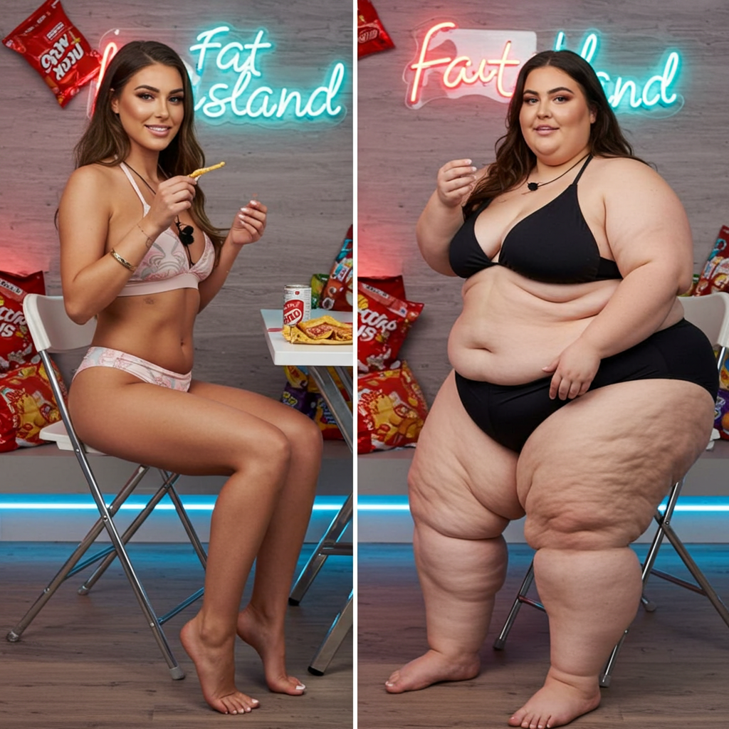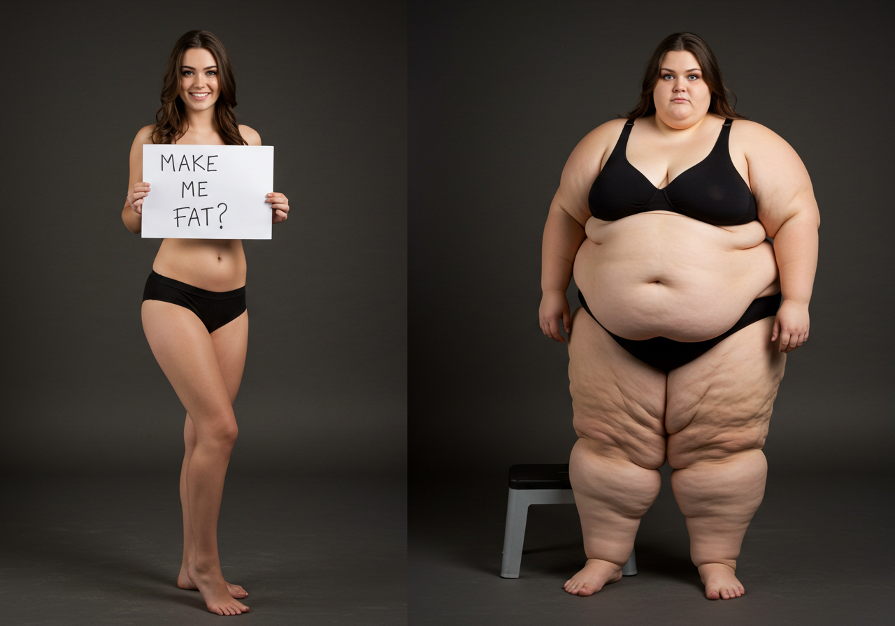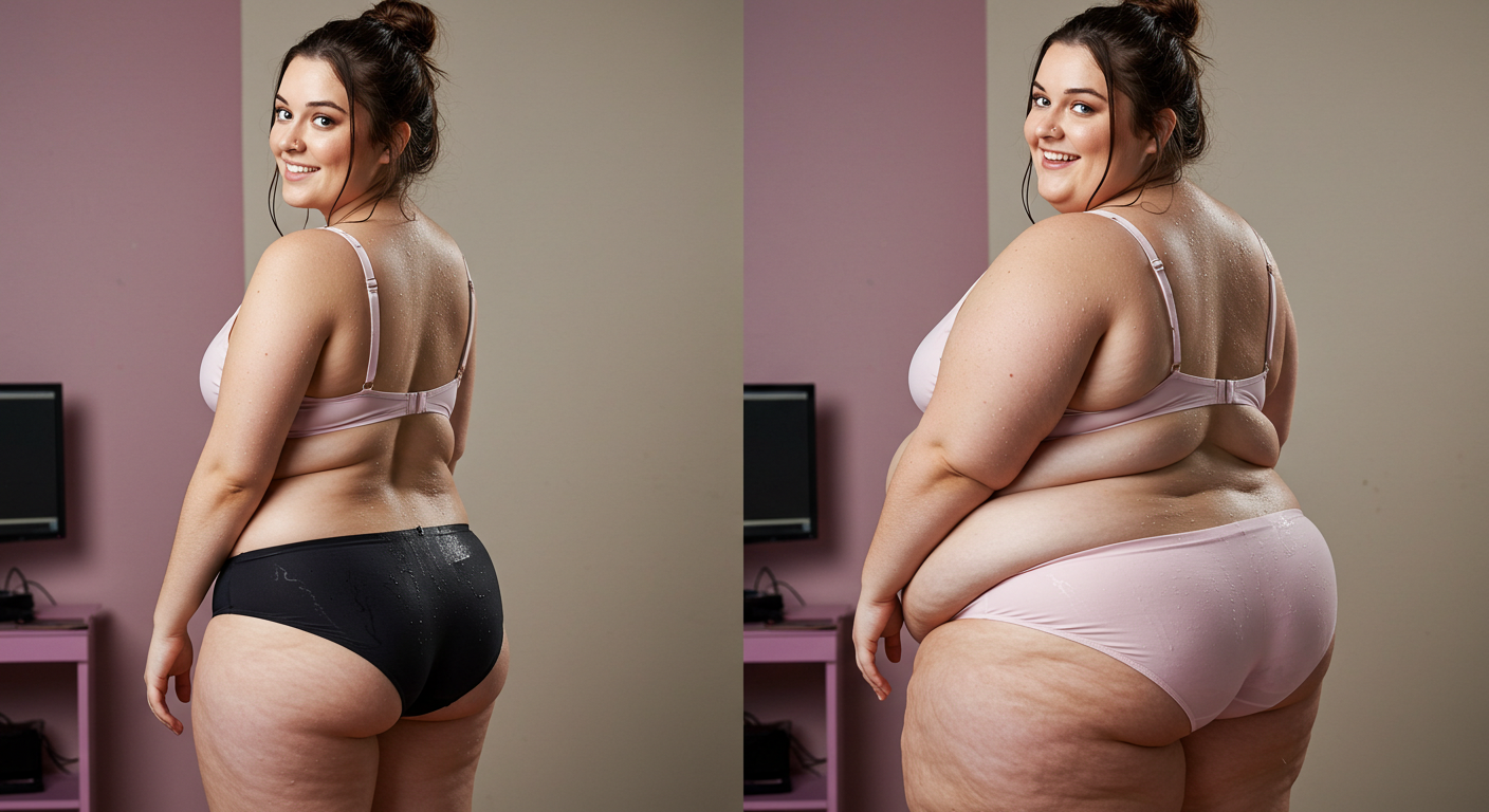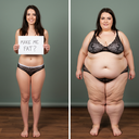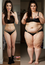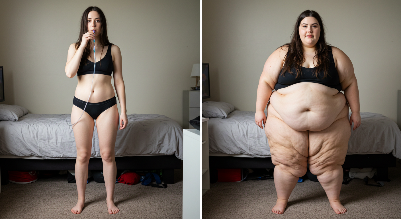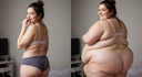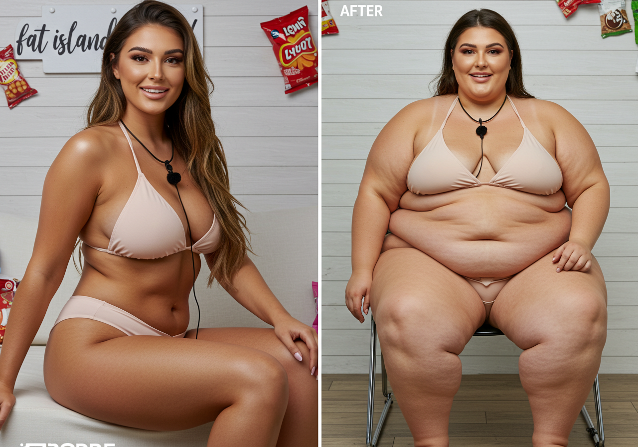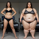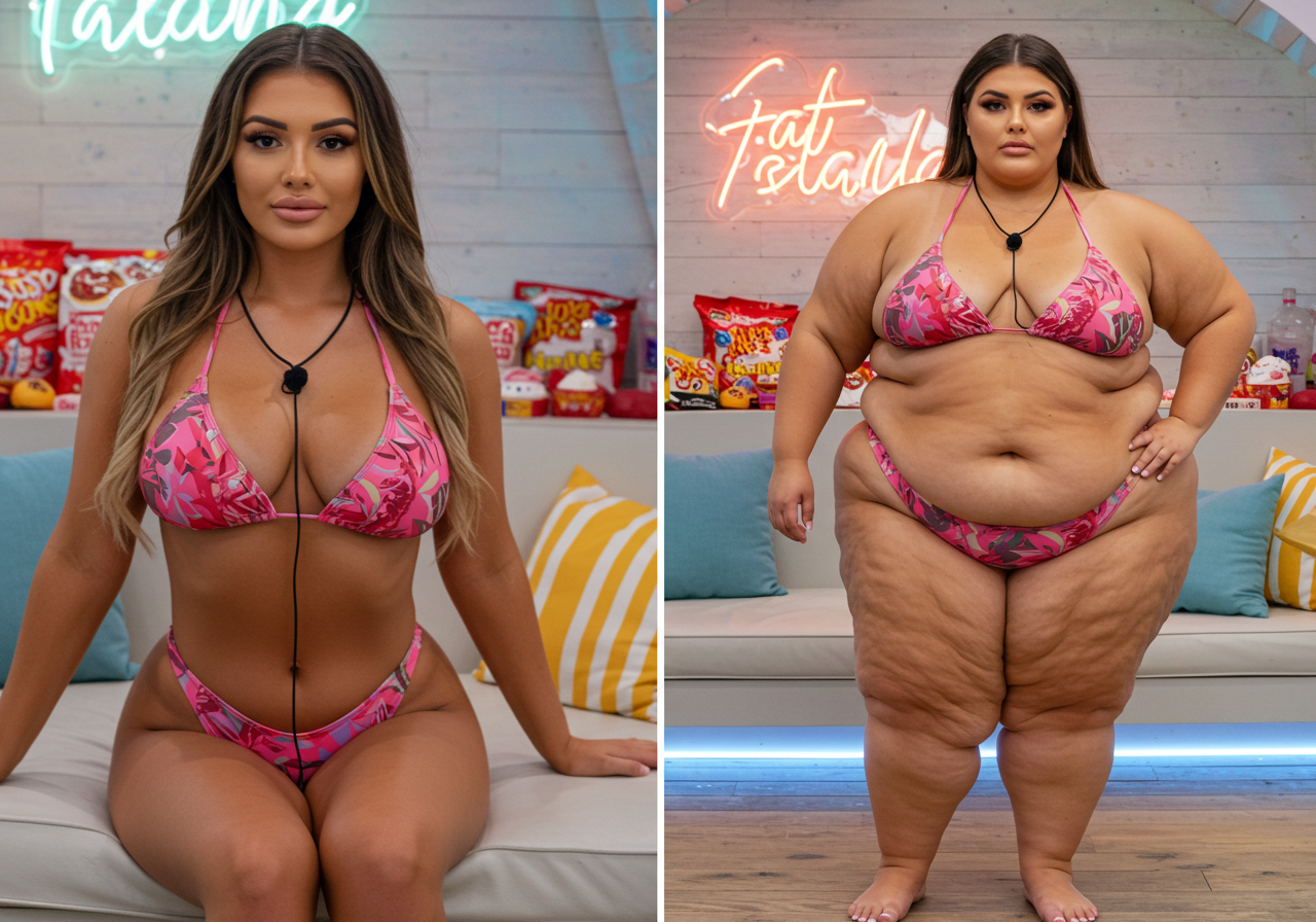 in the during picture her body got obese, held a tiny white marker board with the written sentence "DAYS LEFT: 150" with food doodles. in the after picture, she is well over 1000 lbs and monstruously obese, particular emphasis on how obese she is, monstrously blob knees, stretchy obese wide navel and obese groin hanging out, monstrously blubbery round face, monstrously obese humongous waist, she has obese pillowy arms and fat rolls on her upper arms. humongous knees, blushed cheeks, cute smile. festive numbers balloons "400lb",