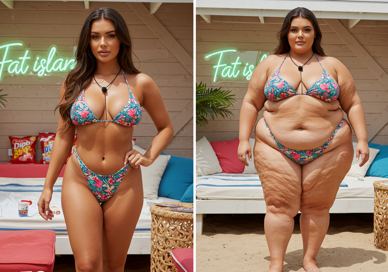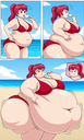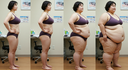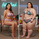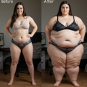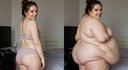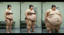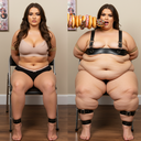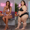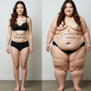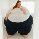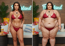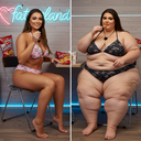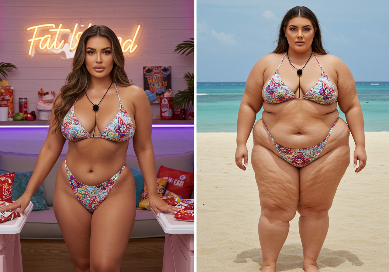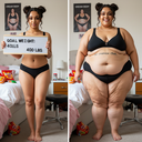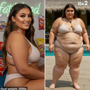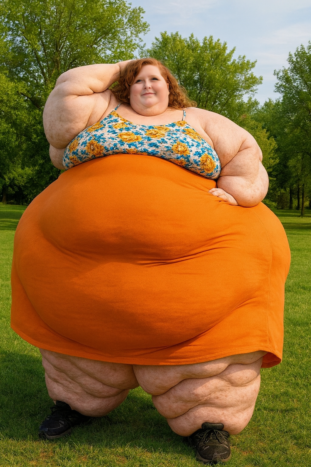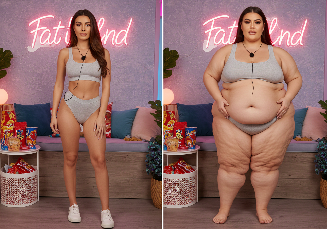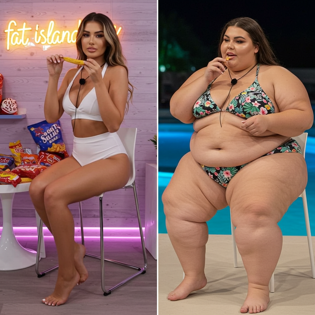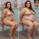in the during picture her body got obese, held a tiny white marker board with the written sentence "DAYS LEFT: 150" with food doodles. in the after picture, she is well over 1000 lbs and monstruously obese, particular emphasis on how obese she is, monstrously blob knees, stretchy obese wide navel and obese groin hanging out, monstrously blubbery round face, monstrously obese humongous waist, she has obese pillowy arms and fat rolls on her upper arms. humongous knees, blushed cheeks, cute smile. festive numbers balloons "400lb",
