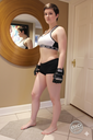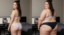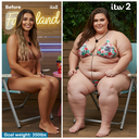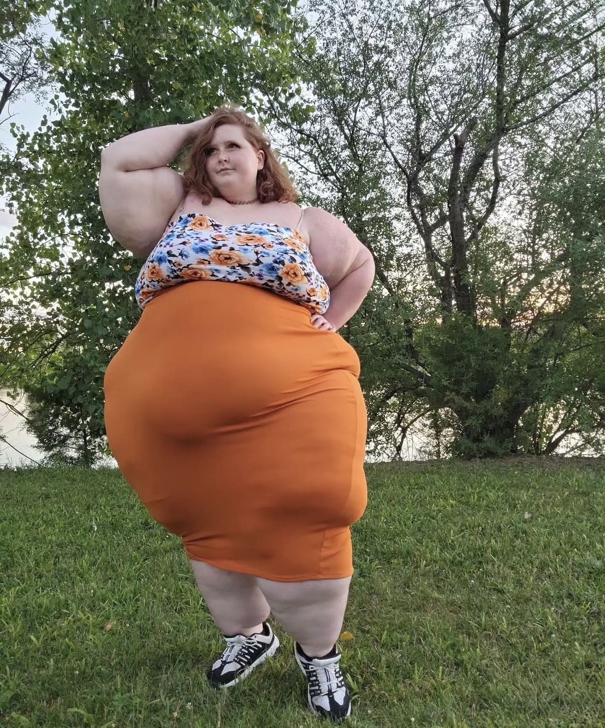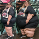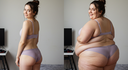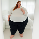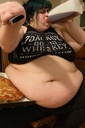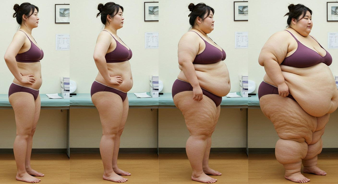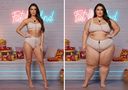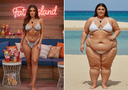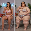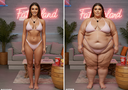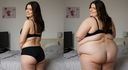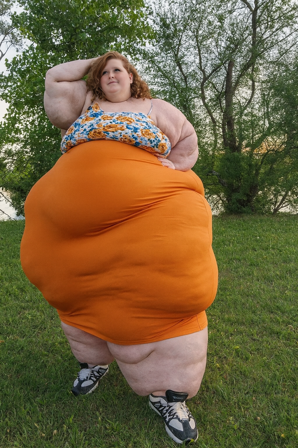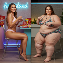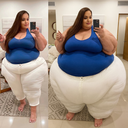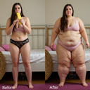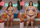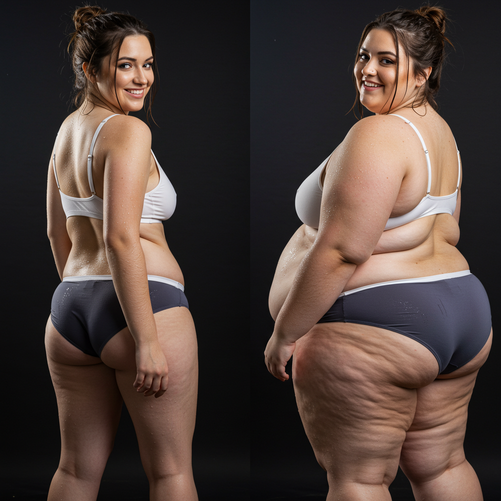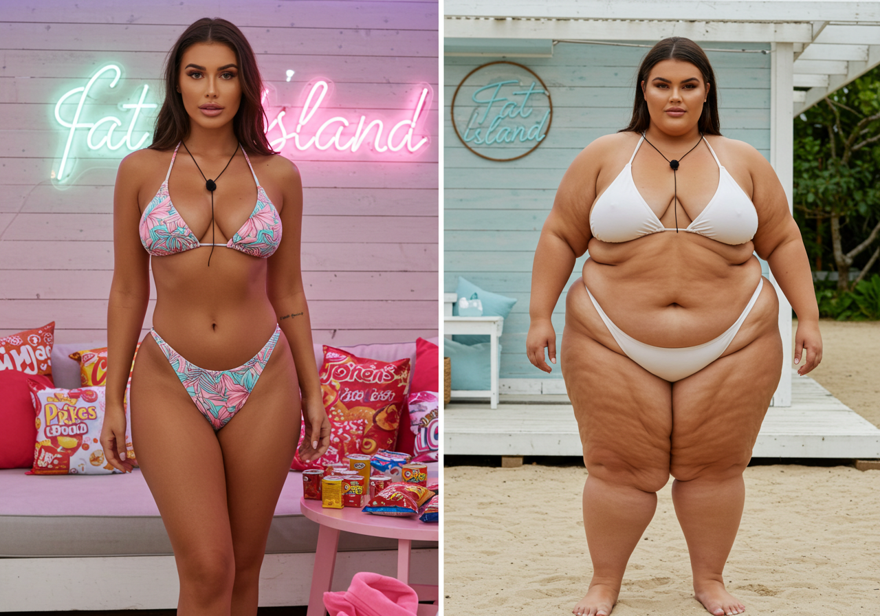 in the during picture her body got obese, held a tiny white marker board with the written sentence "DAYS LEFT: 150" with food doodles. in the after picture, she is well over 1000 lbs and monstruously obese, particular emphasis on how obese she is, monstrously blob knees, stretchy obese wide navel and obese groin hanging out, monstrously blubbery round face, monstrously obese humongous waist, she has obese pillowy arms and fat rolls on her upper arms. humongous knees, blushed cheeks, cute smile. festive numbers balloons "400lb",