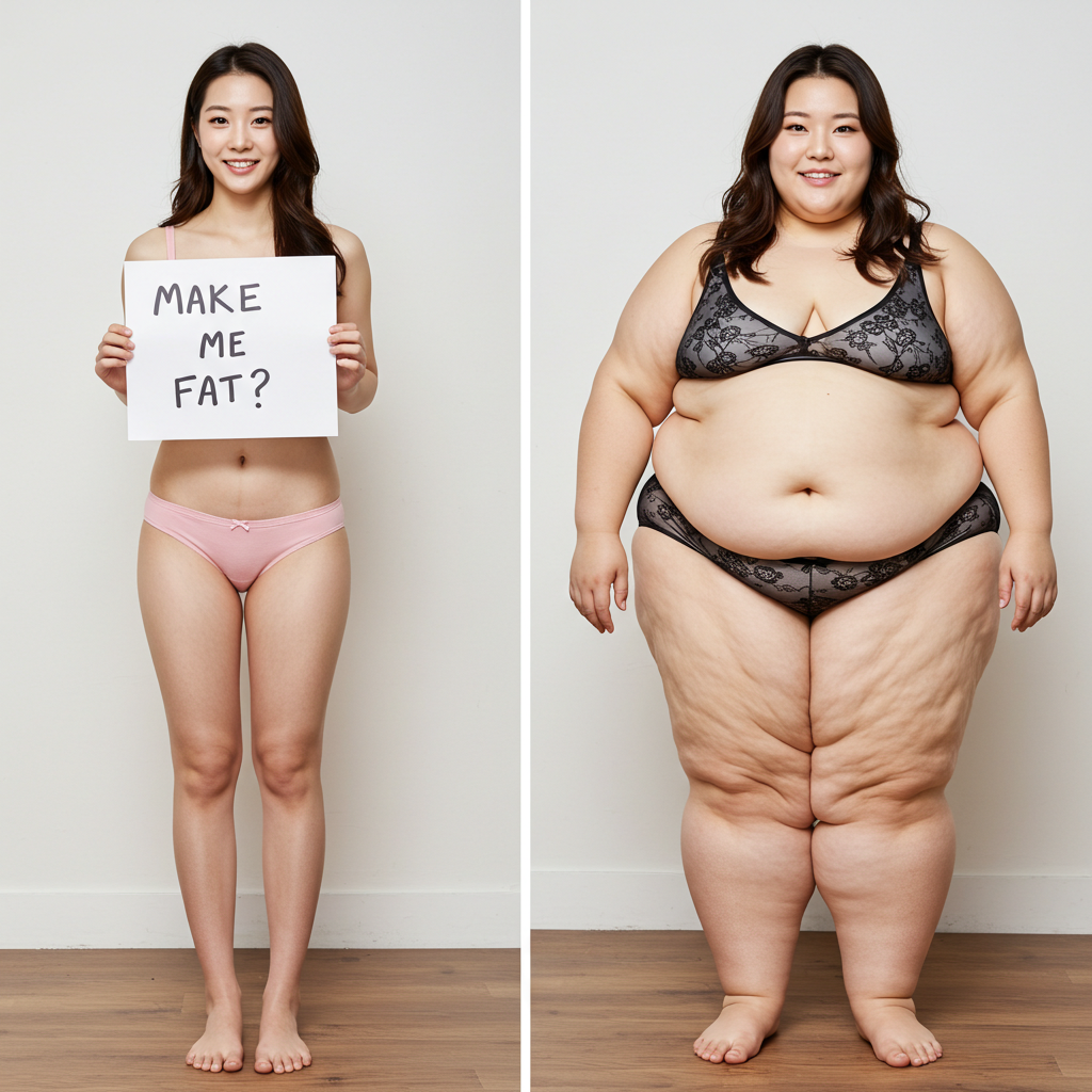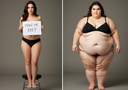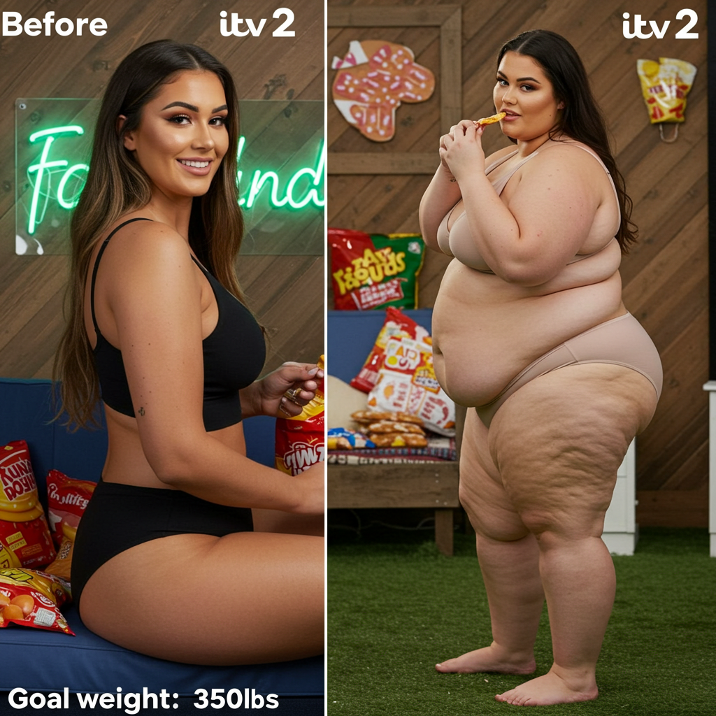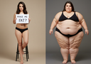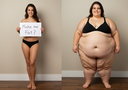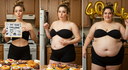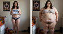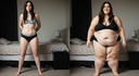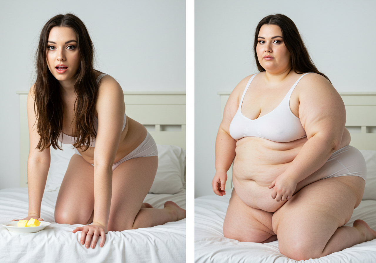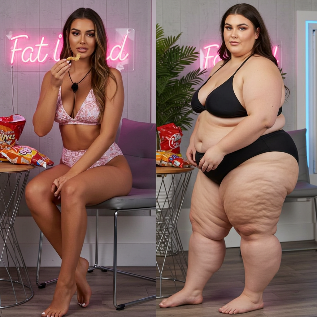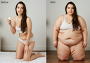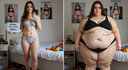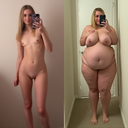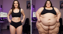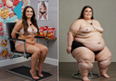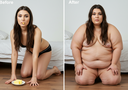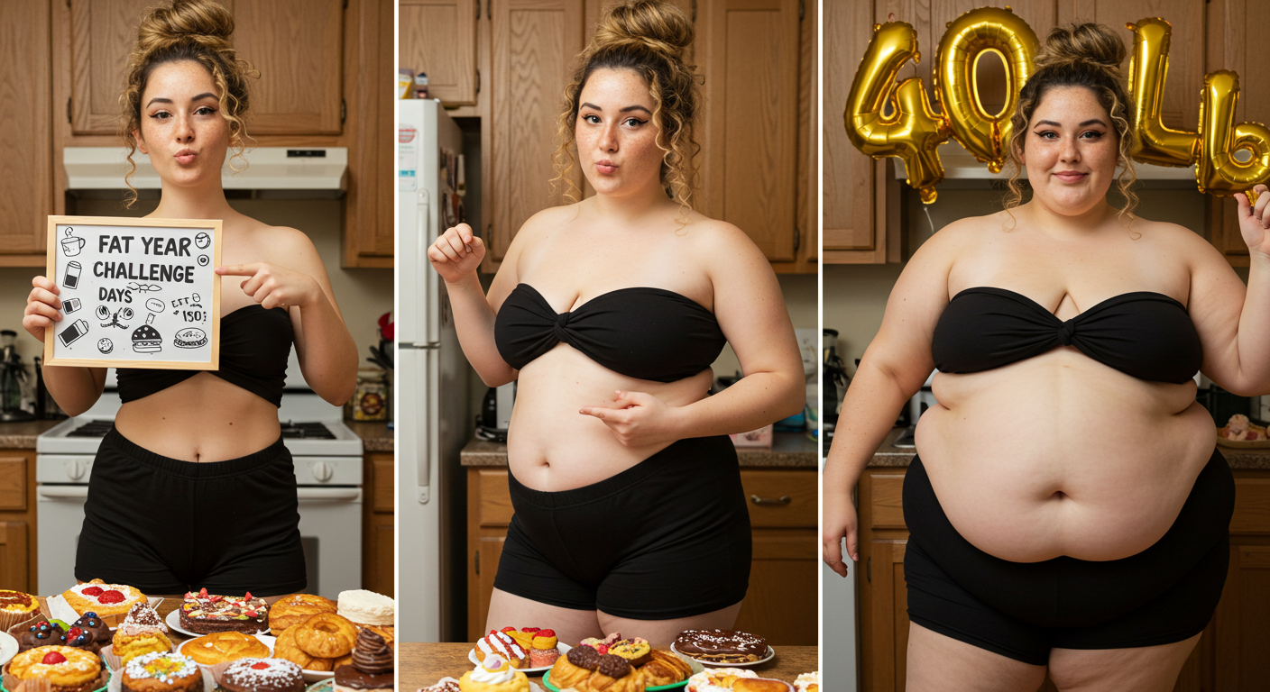 In the before picture she is extremely skinny and fit, held a tiny white marker board with the written sentence "fat year challenge" with food doodles, which she happily pointed at. blows a kiss . table in front of her with tons of variety of pastry