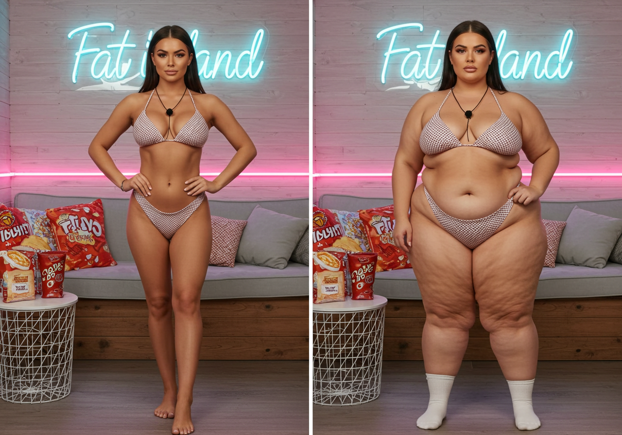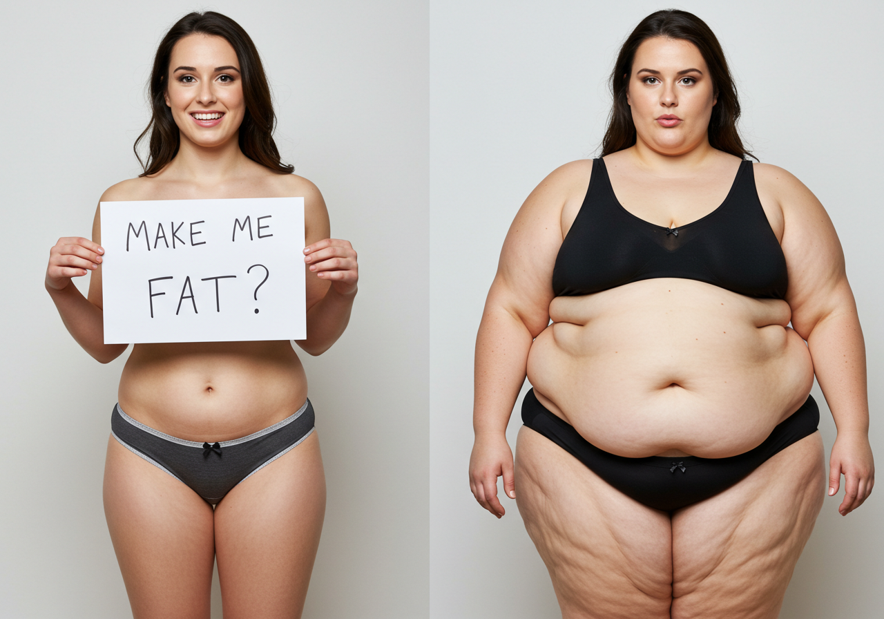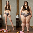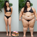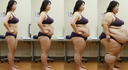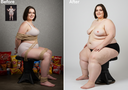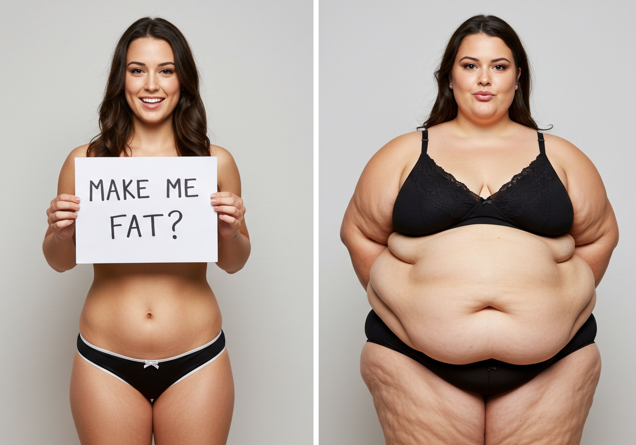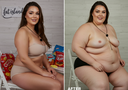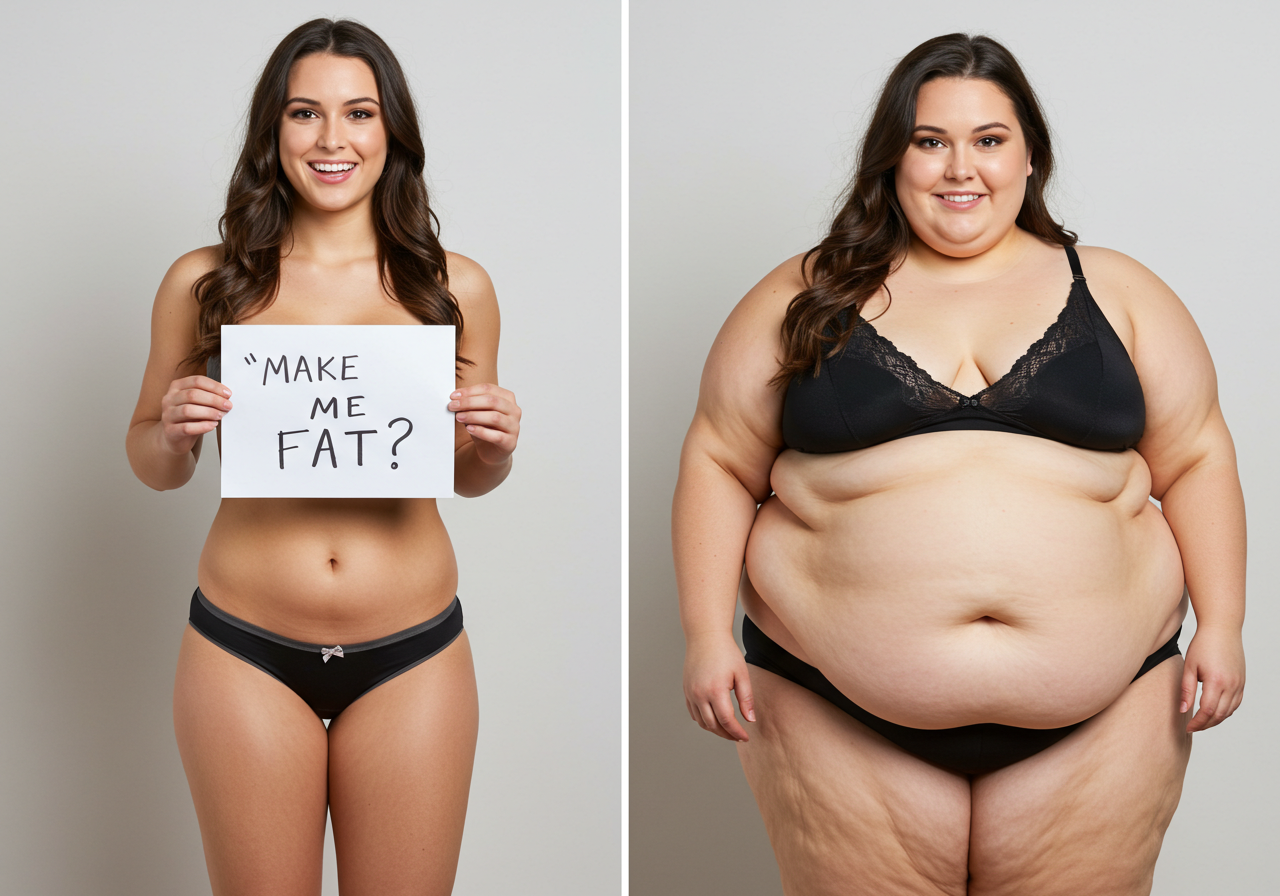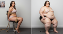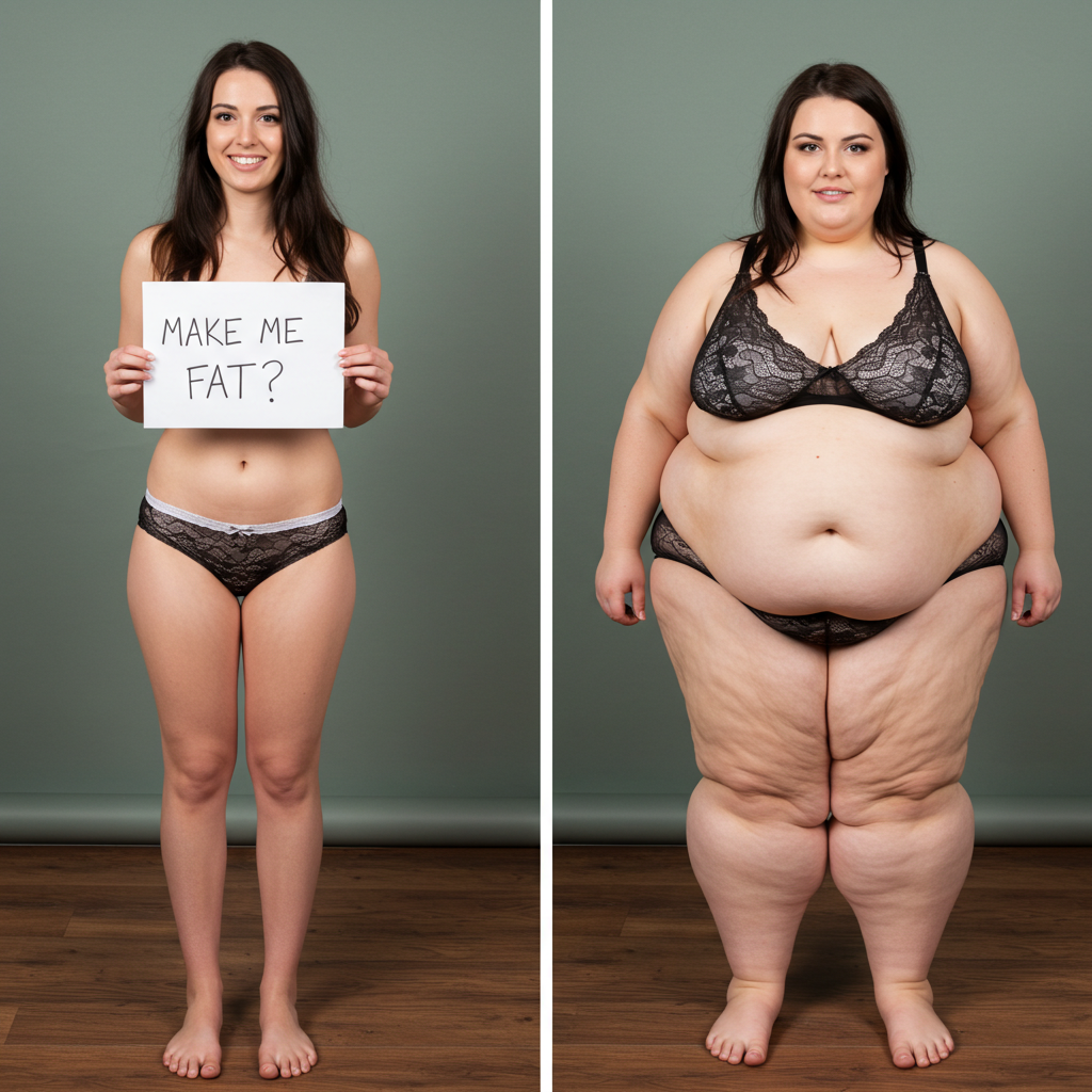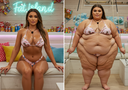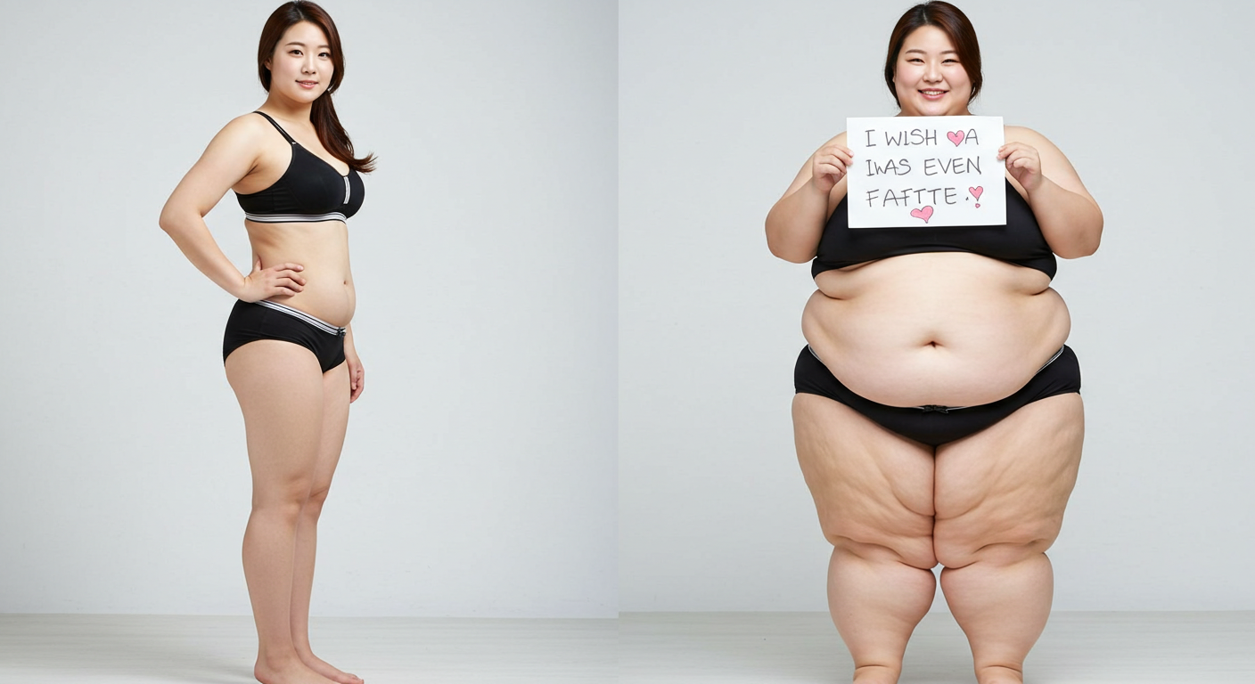 In the before picture she is extremely skinny and fit, held a tiny white marker board with the written sentence "fat year challenge" with food doodles, which she happily pointed at. blows a kiss . table in front of her with tons of variety of pastry