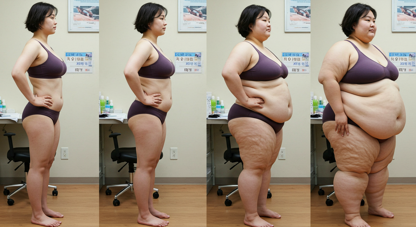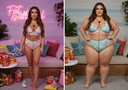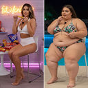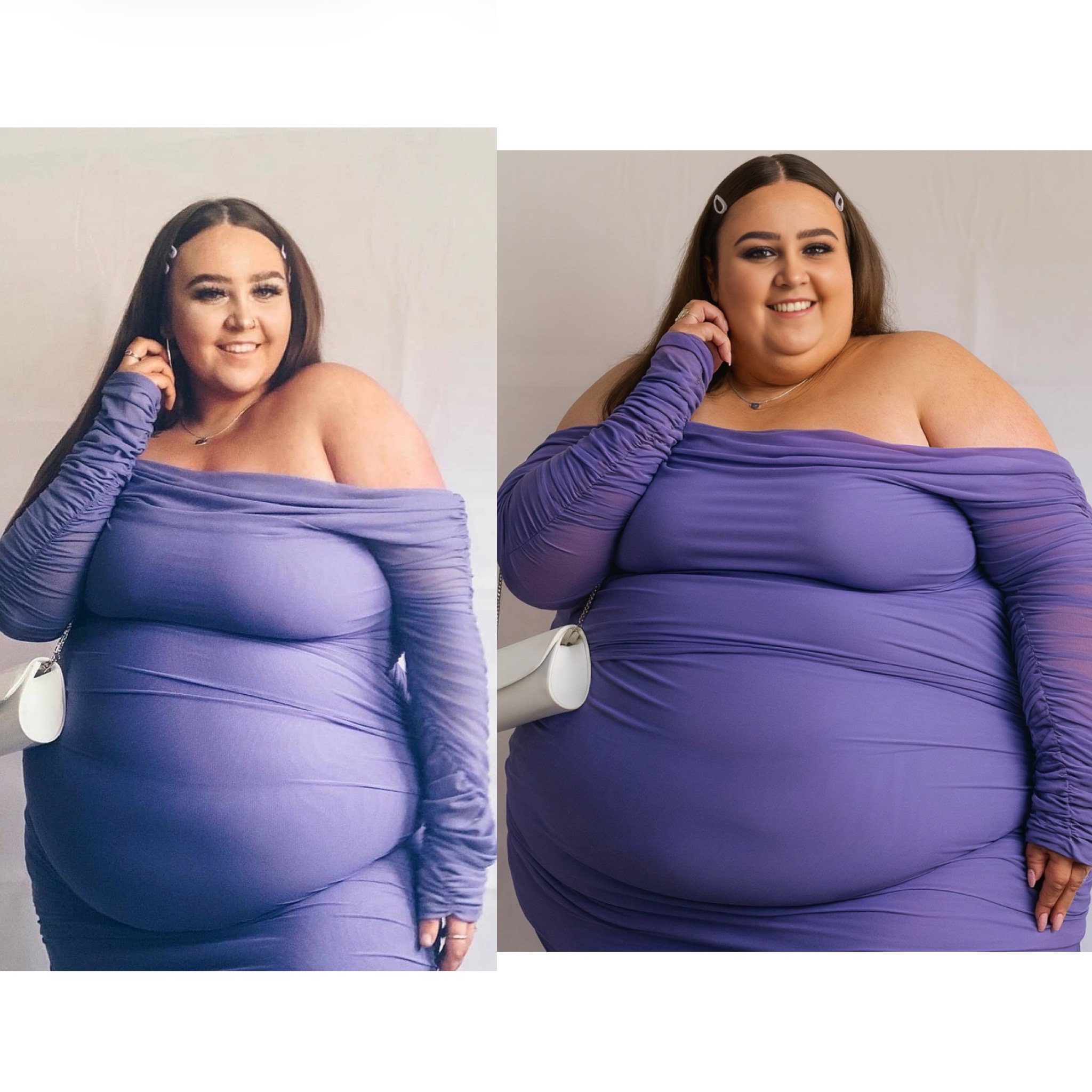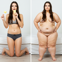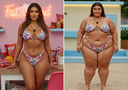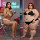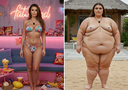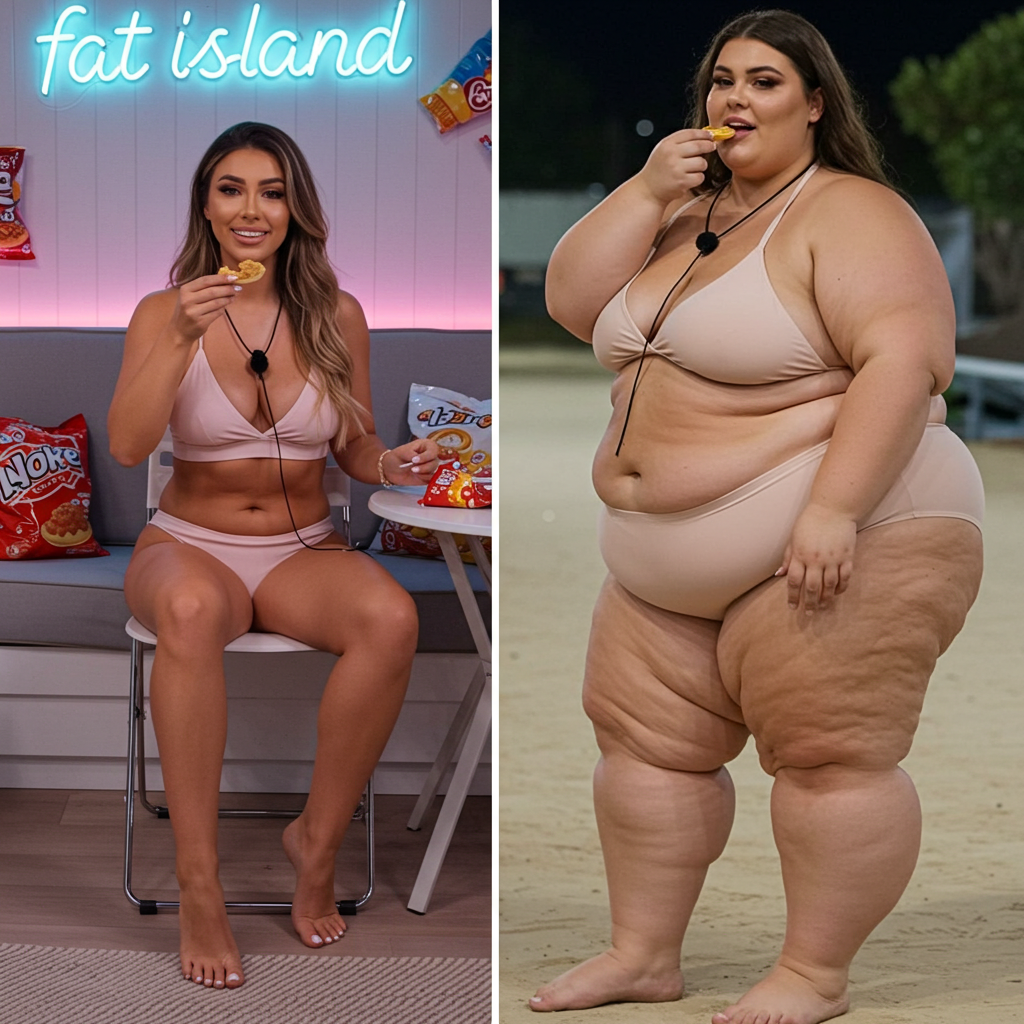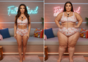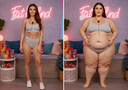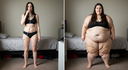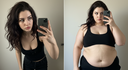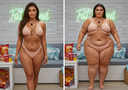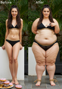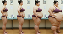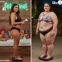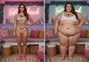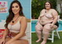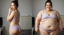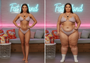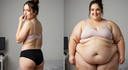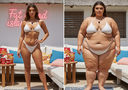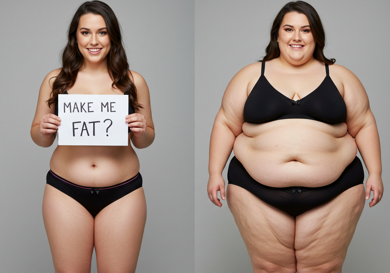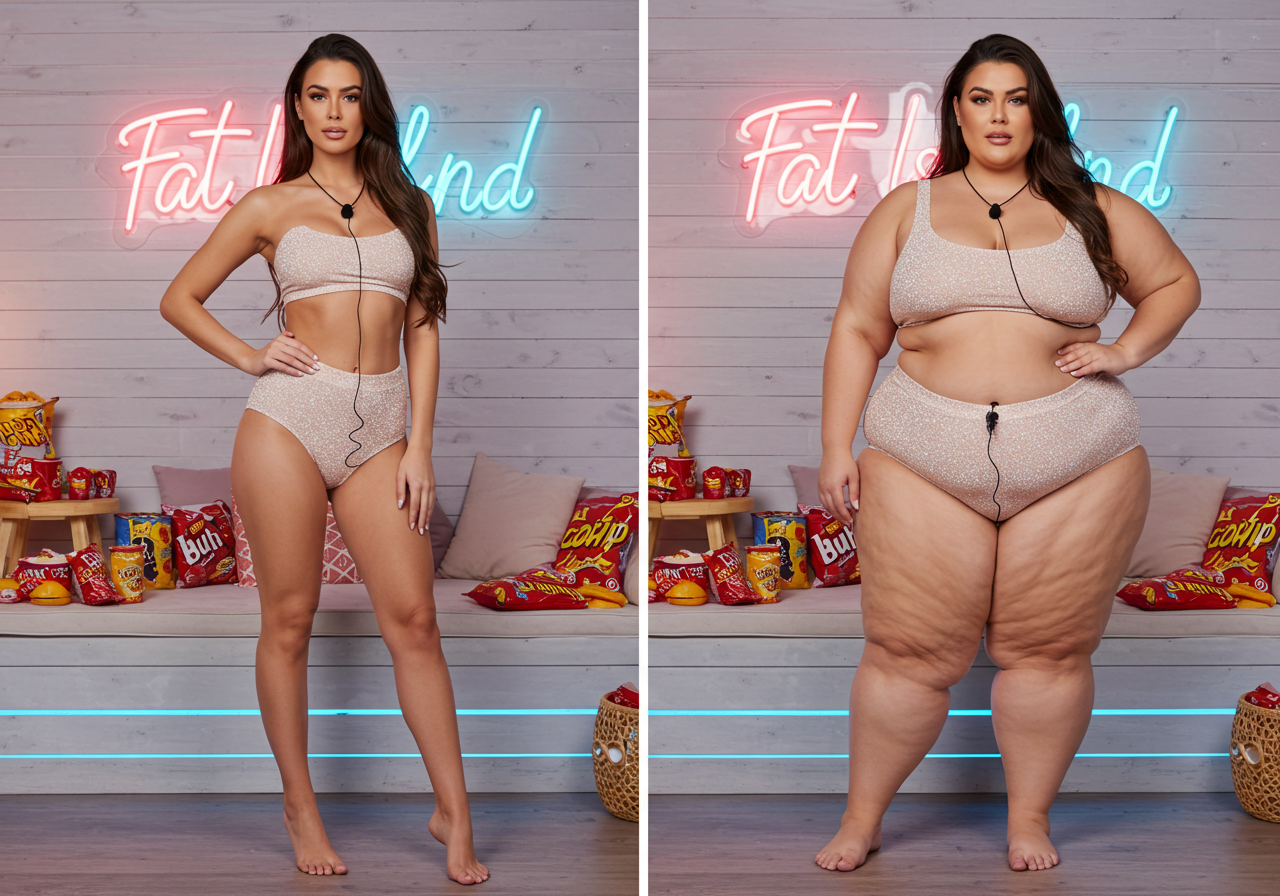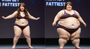 In the before picture she is extremely skinny and fit, held a tiny white marker board with the written sentence "fat year challenge" with food doodles, which she happily pointed at. blows a kiss . table in front of her with tons of variety of pastry