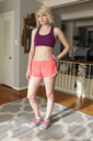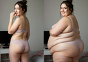 natural colors, daytime, sunrays, 35mm film before during and after comparison full body shots of massive weight gain in 2 years of female armenian college student, she wears natural makeup, eyeliner wing, blonde curly hair bun, brown eyes, freckles, at her kitchen, black twisted bandeau top and shorts, three quarter sideview.