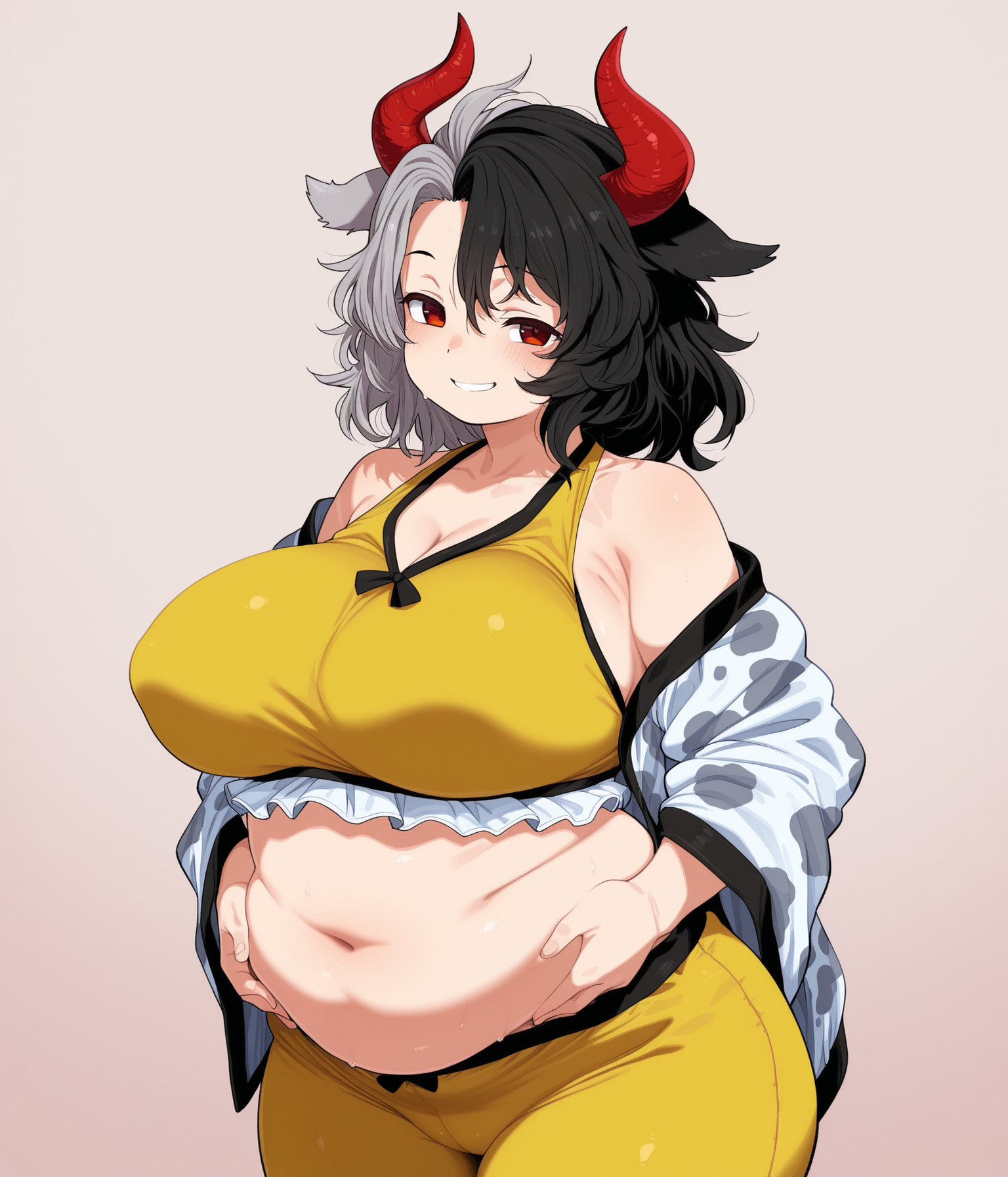>>35266 by the way the different stages are: no tag (plump:0.8) (plump:0.9) (plump:1.0) (plump:1.2) (overweight:0.9) (overweight:1.0) (overweight:1.1) (overweight:1.2) (obese:0.9) (obese:1.0) (obese:1.1) (obese:1.2) (hyper obese:0.85) (hyper obese:0.9) (hyper obese:0.95) but it totally depends on your loras and the random whims of AI as usual