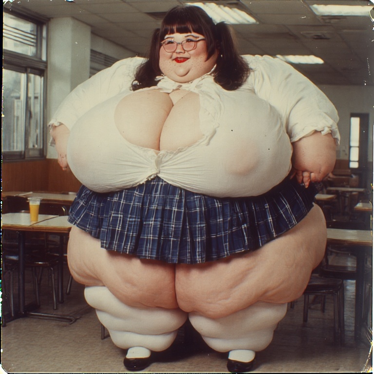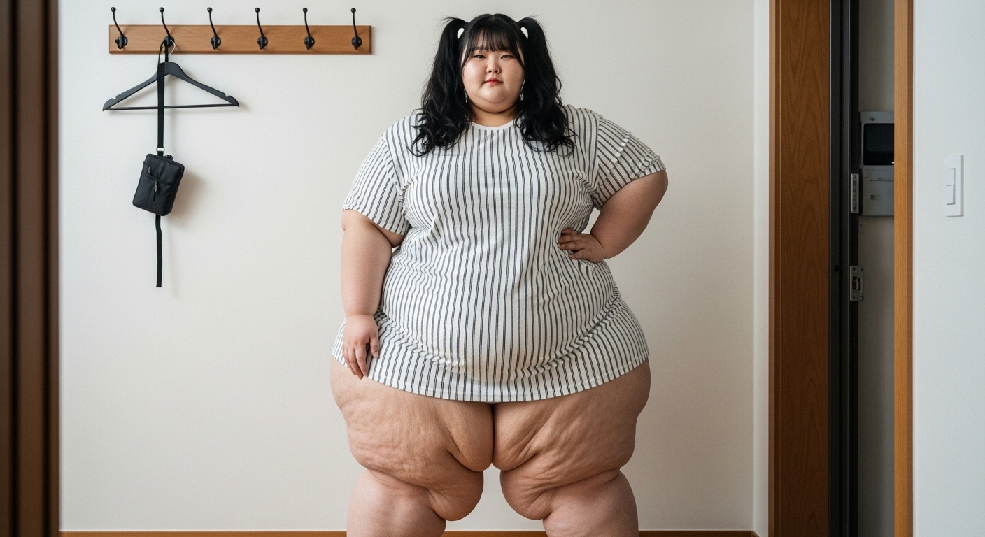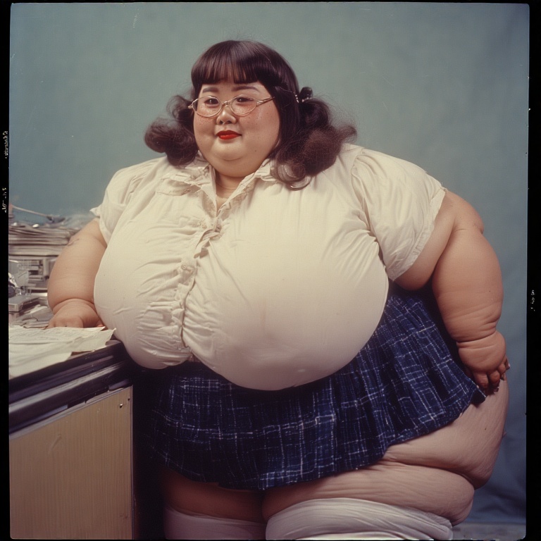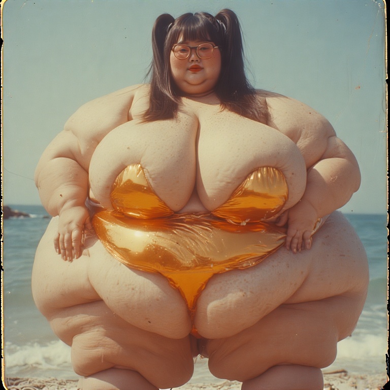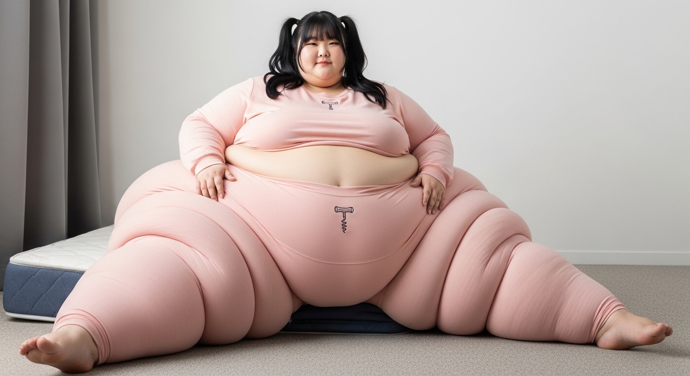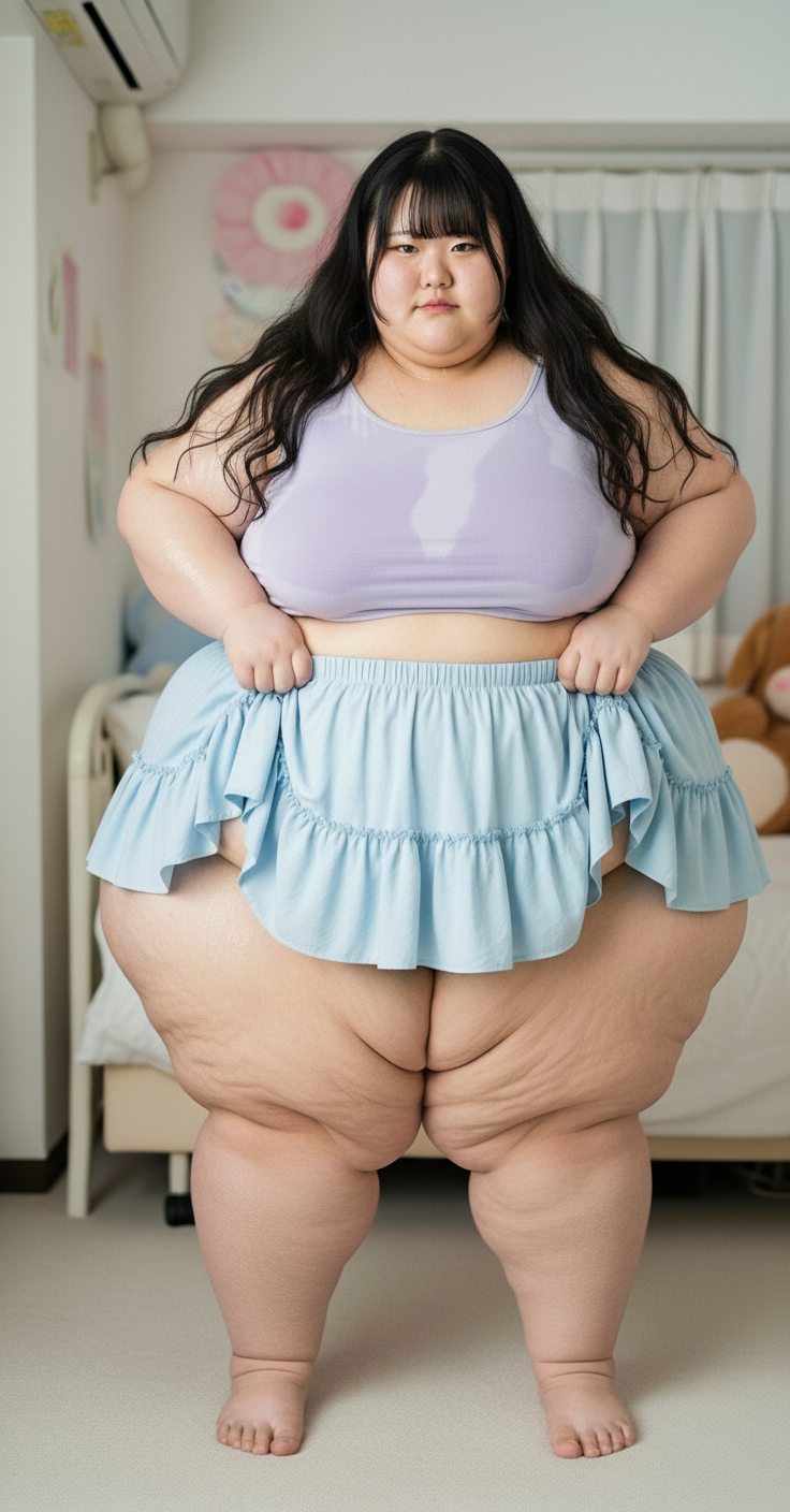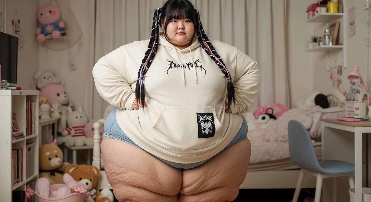 Subject & Features: PHOTOREALISTIC 35MM PHOTO. A candid full-body shot of an extremely obese young Korean woman, weighing 650 lbs. Her face is cute and nerdy with a happy expression, and she has black hair styled in two enormous, fluffy pigtails. Her enormous, soft belly hangs low, cascading in thick, pillowy rolls over her hips, with deep folds and creases defining her midsection, her skin featuring subtle, natural lines that add to its softness and a hint of natural texture with faint cellulite dimpling. Her arms are massively fat, resembling huge soft pillows with flesh spilling over her elbows in distinct, heavy layers, the skin exhibiting a gentle, uneven pattern with noticeable cellulite, marked by small, irregular dimples and a slightly puckered surface. Her thighs, hips, and calves are enormously large, defined by deep rolls, a soft, wavy texture with vivid cellulite displaying prominent, deep-set dimples, a pebbled texture with a honeycomb-like pattern, and squishy qualities that jiggle with every movement. Her cankles are preposterously pudgy, merging into her feet, with a smooth yet slightly varied skin texture accented by pronounced cellulite dimples and a rippled appearance, and her tree-trunk legs appear both heavy and tender.