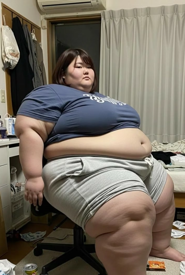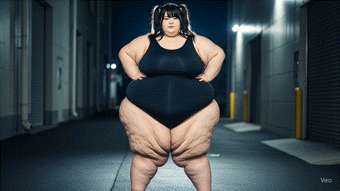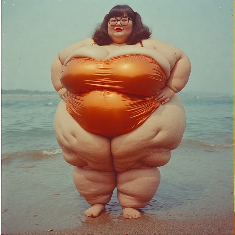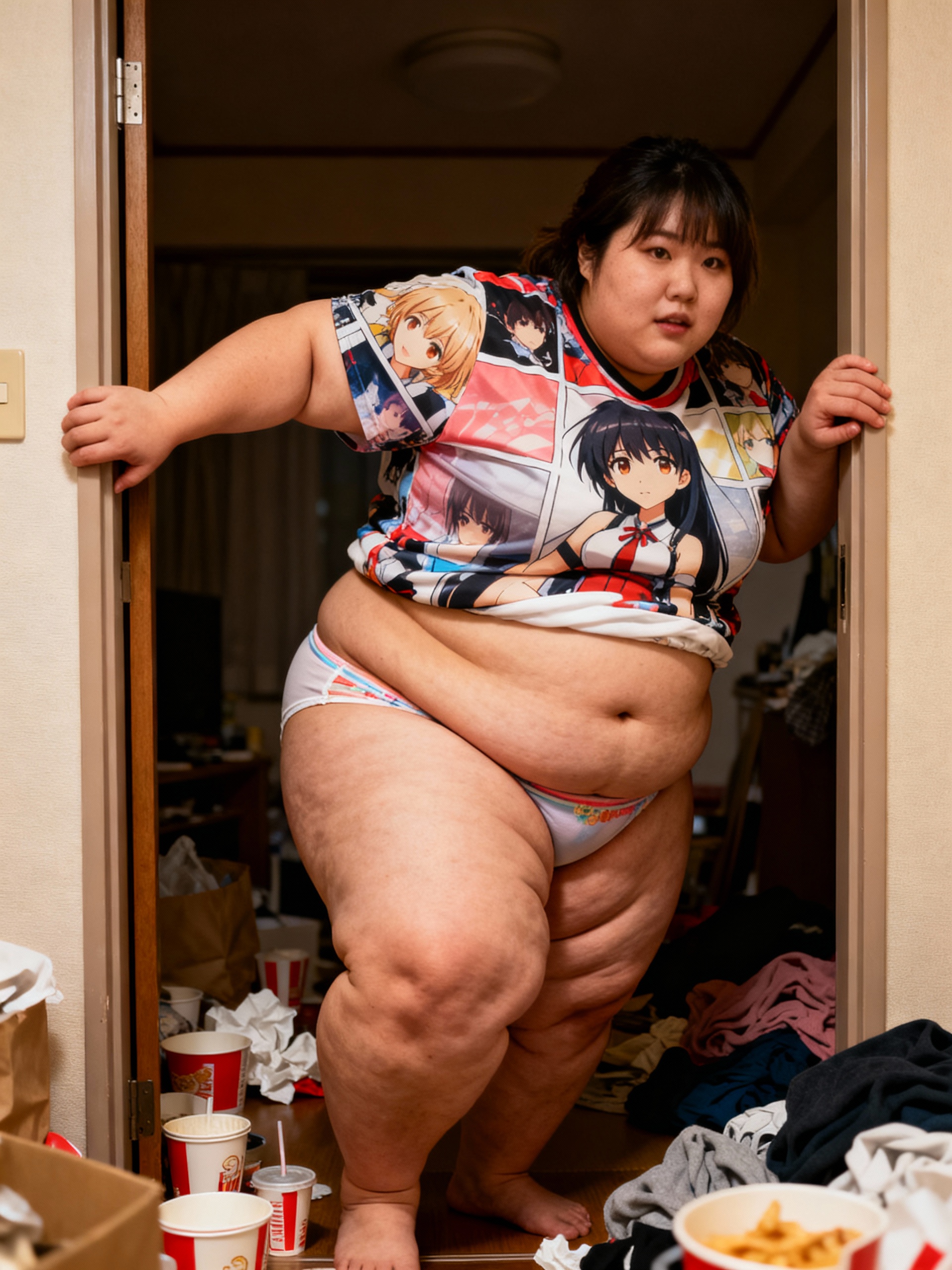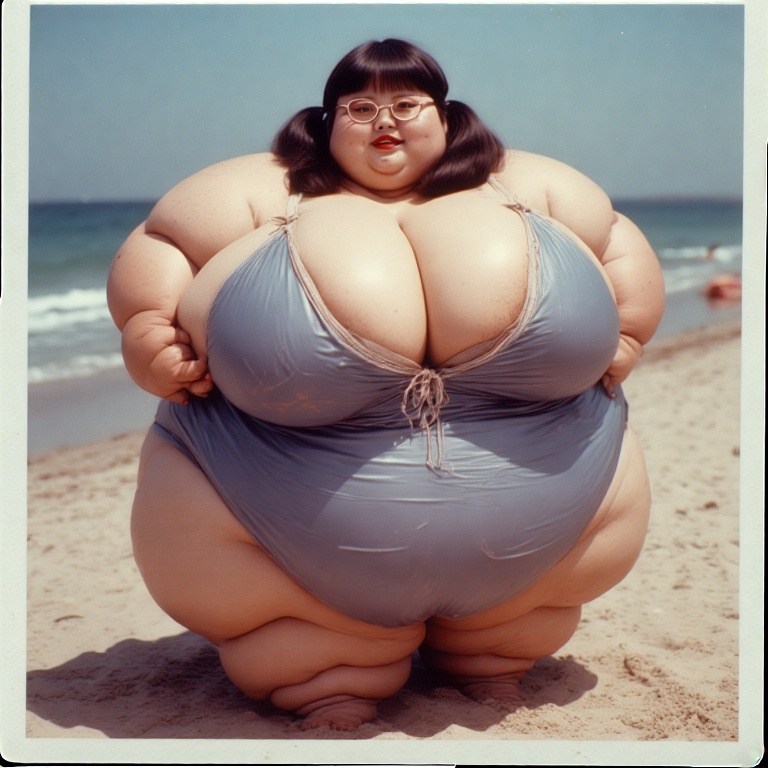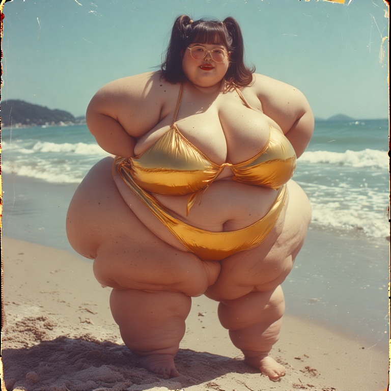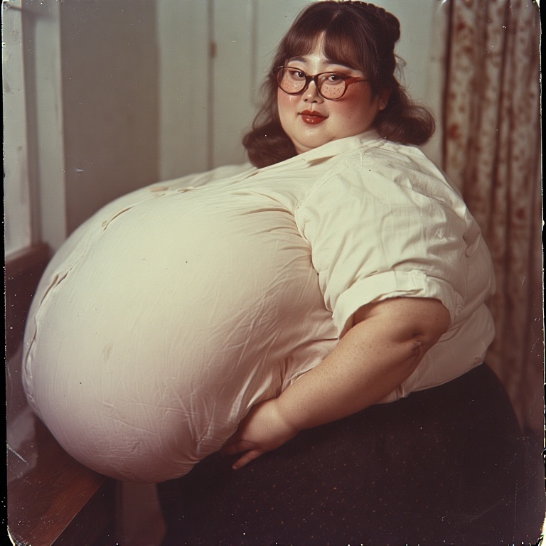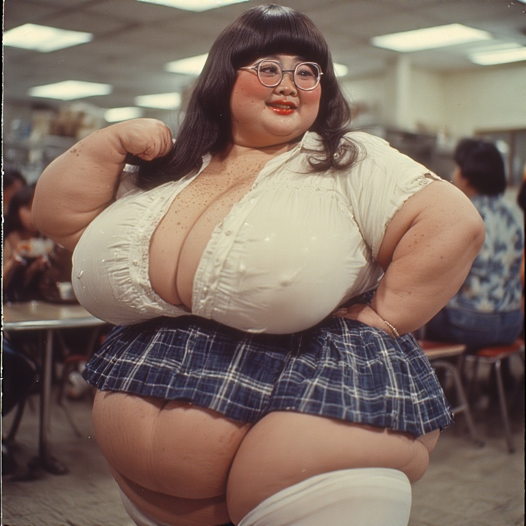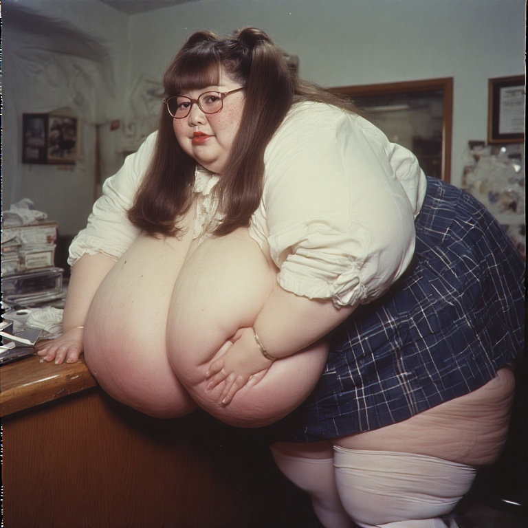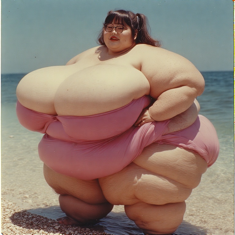 Subject & Features: PHOTOREALISTIC 35MM PHOTO. A candid full-body shot of an extremely obese young Korean woman, weighing 650 lbs. Her face is cute and nerdy with a happy expression, and she has black hair styled in two enormous, fluffy pigtails. Her enormous, soft belly hangs low, cascading in thick, pillowy rolls over her hips, with deep folds and creases defining her midsection, her skin featuring subtle, natural lines that add to its softness and a hint of natural texture with faint cellulite dimpling. Her arms are massively fat, resembling huge soft pillows with flesh spilling over her elbows in distinct, heavy layers, the skin exhibiting a gentle, uneven pattern with noticeable cellulite, marked by small, irregular dimples and a slightly puckered surface. Her thighs, hips, and calves are enormously large, defined by deep rolls, a soft, wavy texture with vivid cellulite displaying prominent, deep-set dimples, a pebbled texture with a honeycomb-like pattern, and squishy qualities that jiggle with every movement. Her cankles are preposterously pudgy, merging into her feet, with a smooth yet slightly varied skin texture accented by pronounced cellulite dimples and a rippled appearance, and her tree-trunk legs appear both heavy and tender.